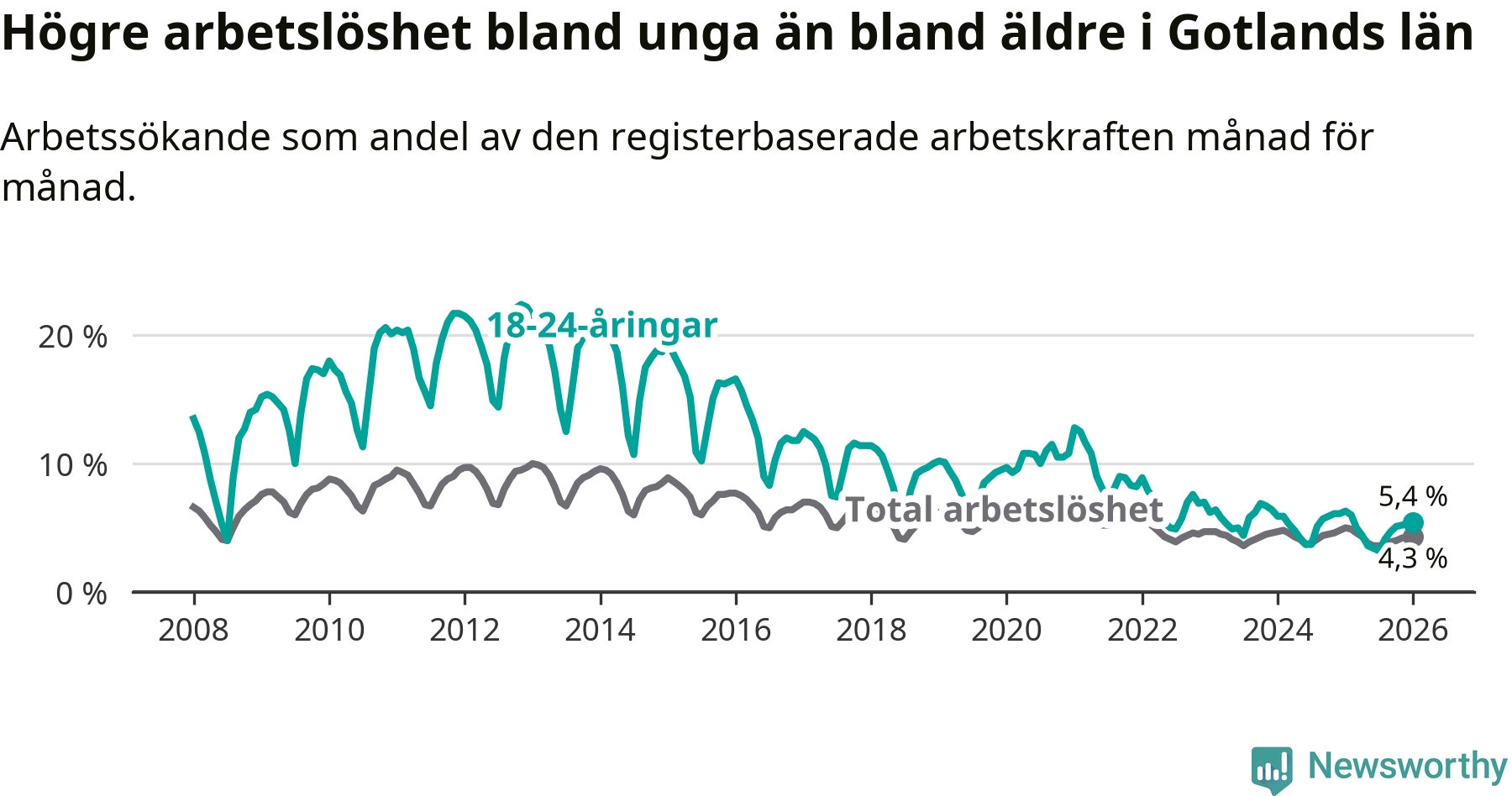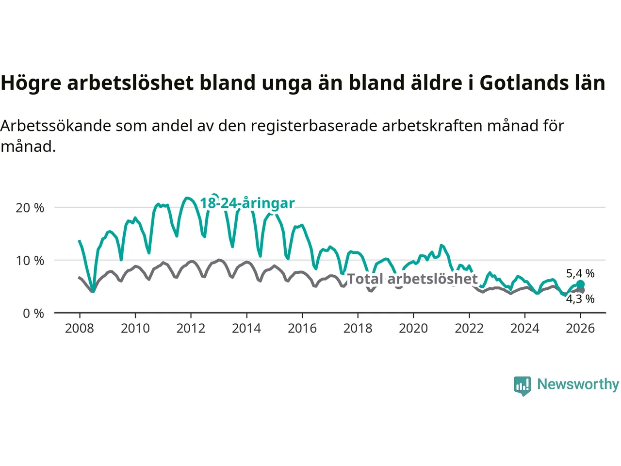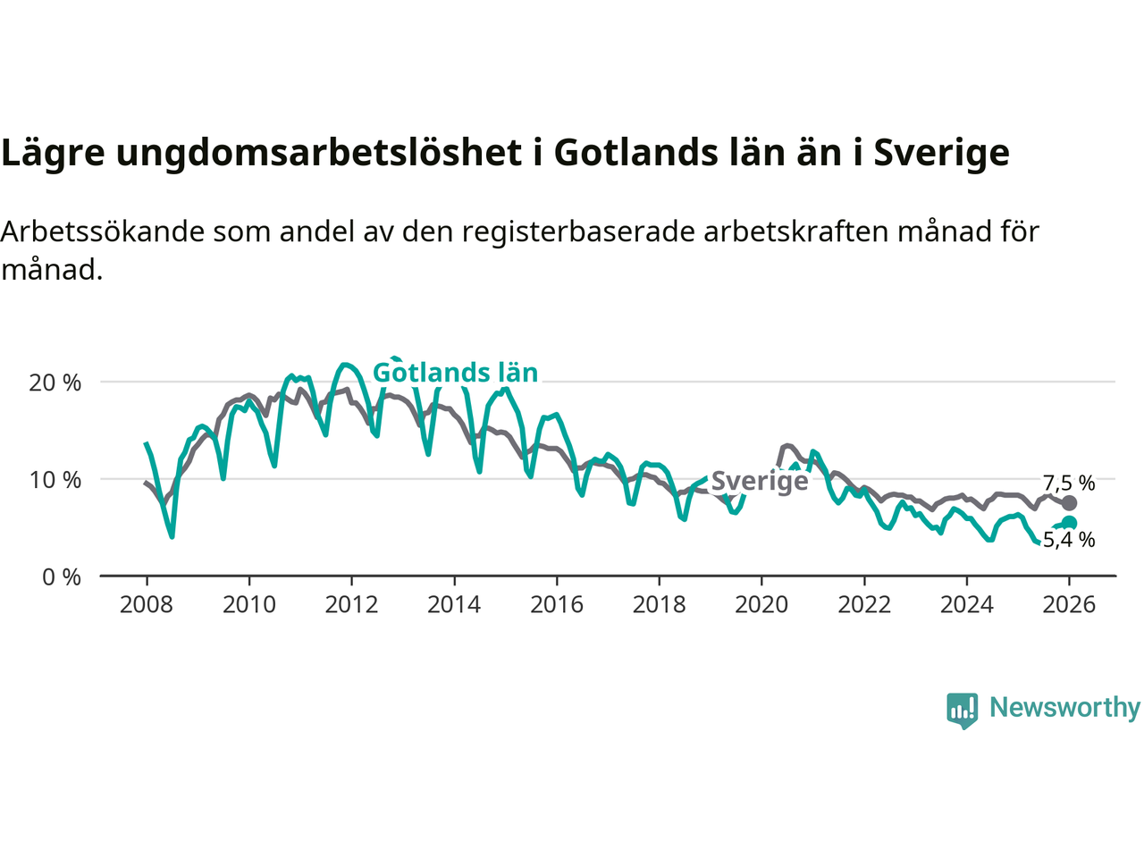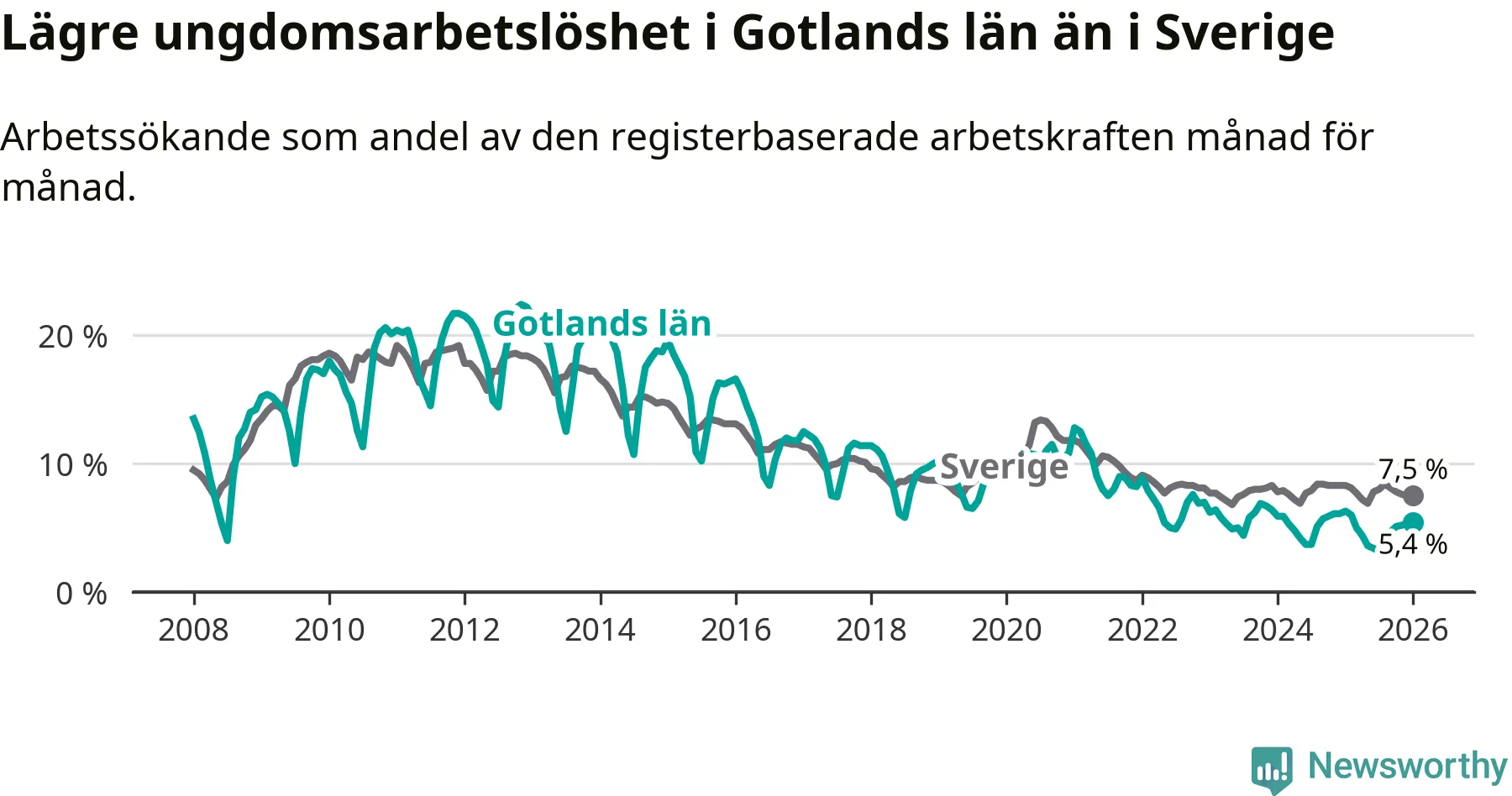 I och med den senaste månadens nedgång har de ungas arbetslöshet på Gotland sjunkit elva månader i följd (ner från 6,0 procent i februari 2025 till 5,4 procent nu).