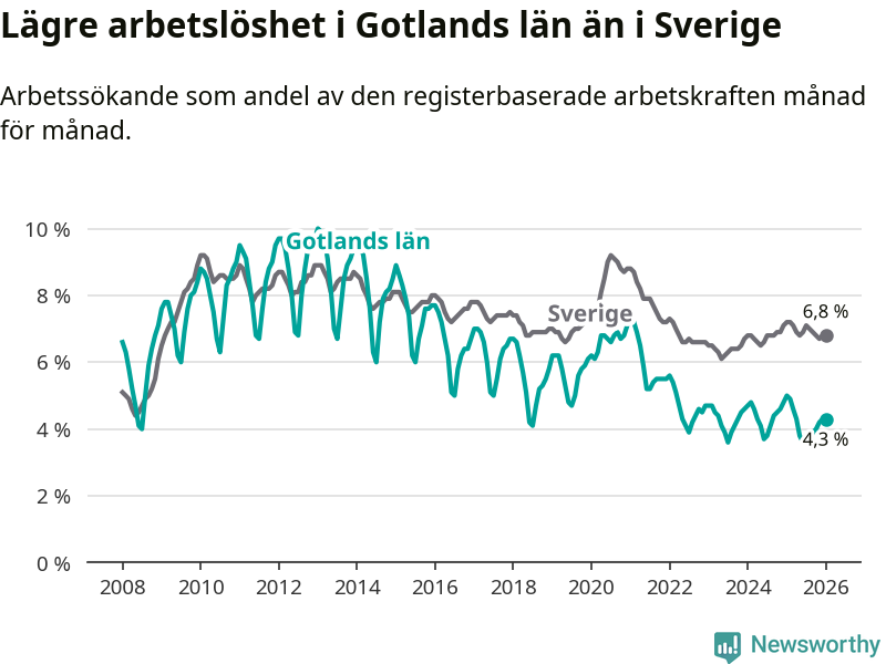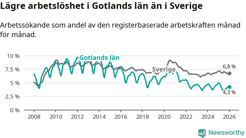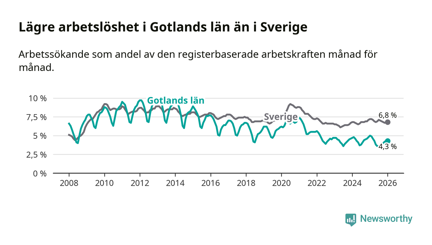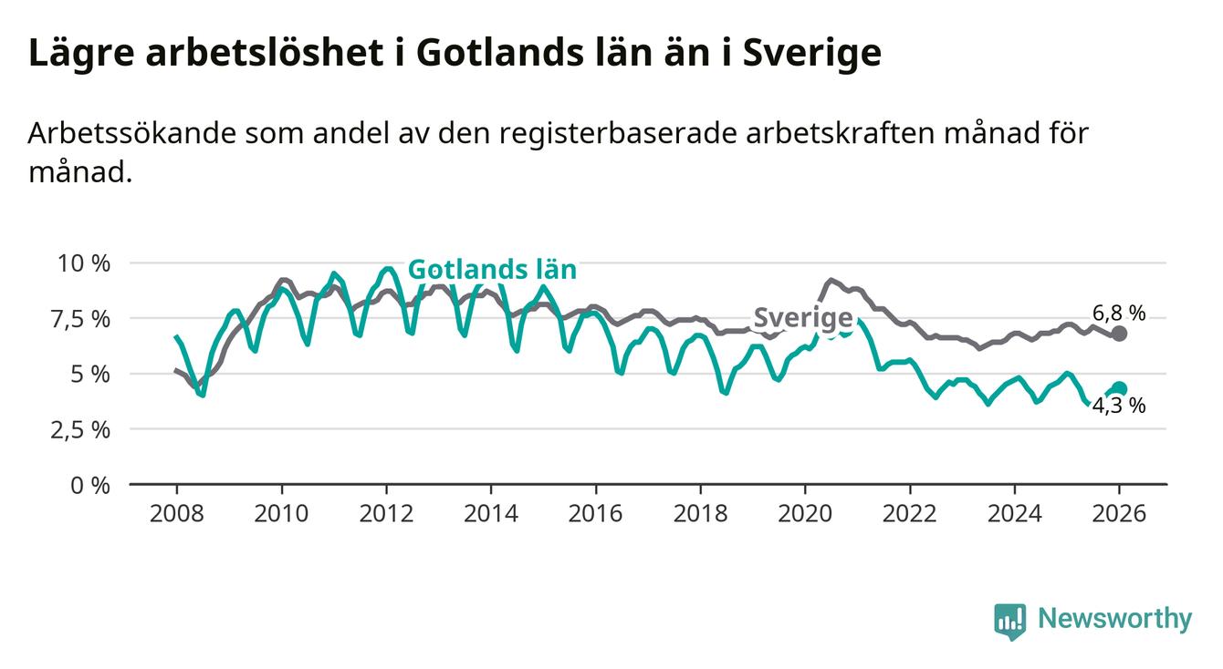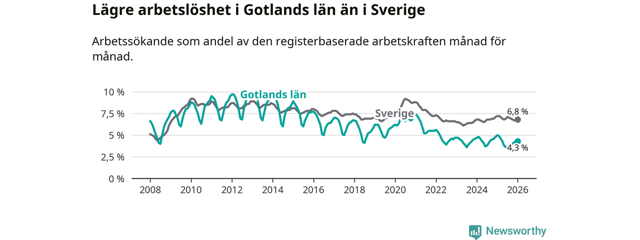 Under januari månad rapporterade Gotlands län en total arbetslöshet på 4,3 procent. Det är en minskning jämfört med samma tidpunkt i fjol (−0,7 procentenheter). Även i Sverige sjunker arbetslösheten .
