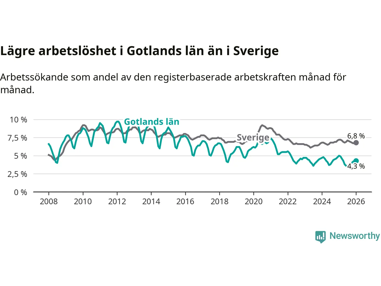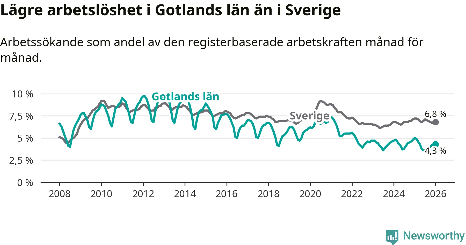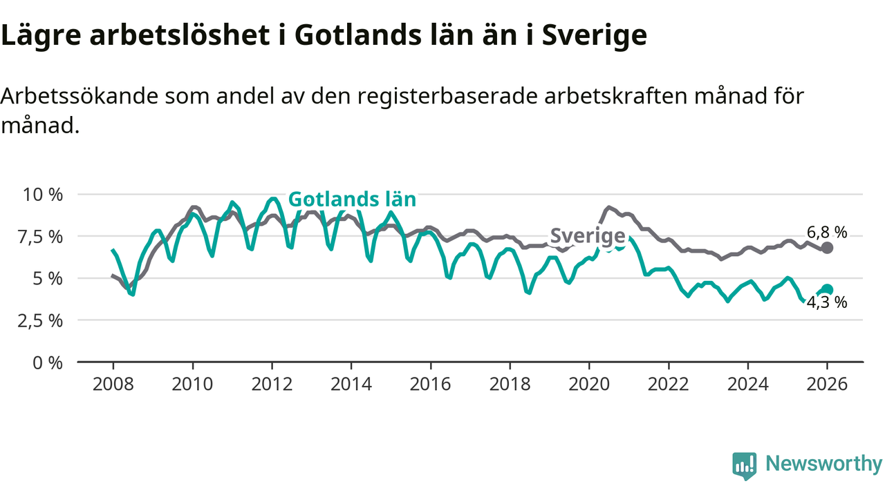 Under januari månad rapporterade Gotlands län en total arbetslöshet på 4,3 procent. Det är en minskning jämfört med samma tidpunkt i fjol (−0,7 procentenheter). Även i Sverige sjunker arbetslösheten .