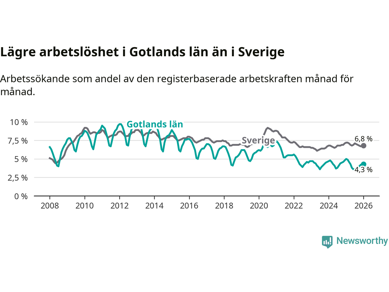 Gotlands län hade redan tidigare lägre arbetslöshet än snittet i hela Sverige och nu växer klyftan (4,3 procent i länet, jämfört med 6,8 procent i hela riket). Norrbotten har den lägsta arbetslösheten i riket (3,9 procent), medan Skåne har den högsta (8,9 procent). För att Gotlands län skulle komma ner i samma arbetslöshetsnivå som Norrbotten skulle 115 personer behöva sysselsättas.