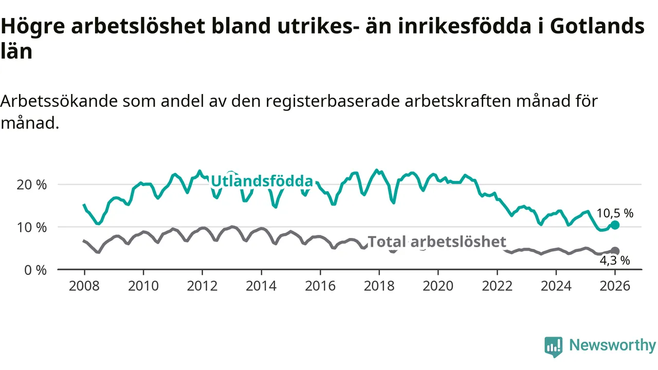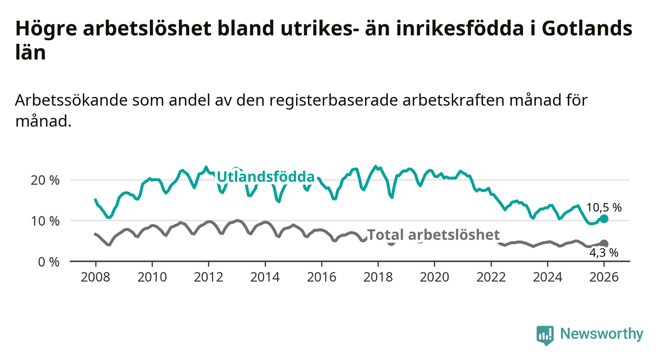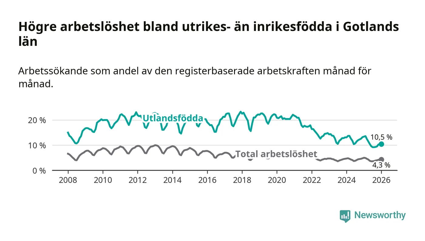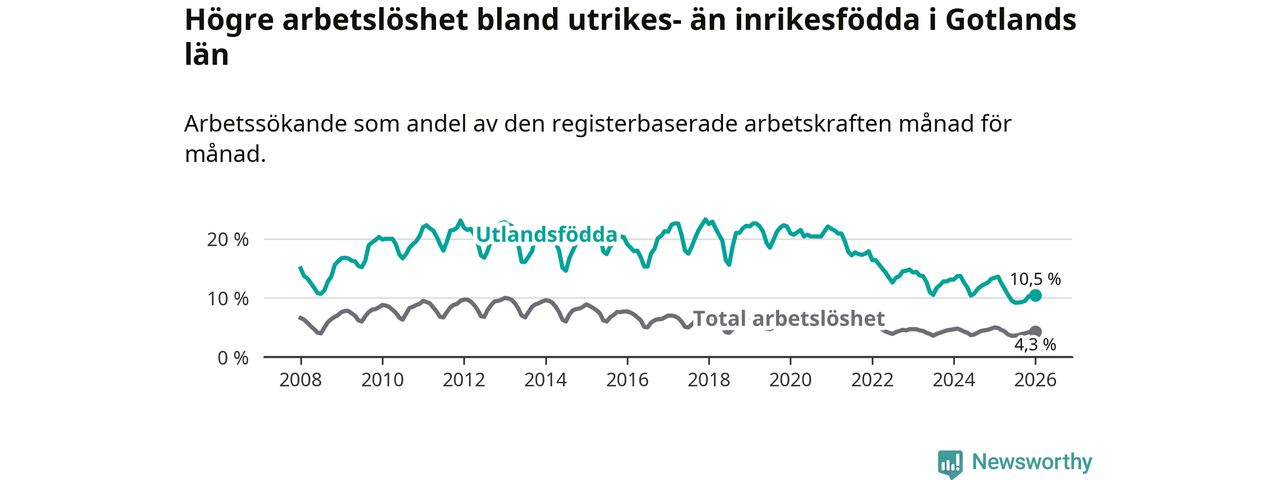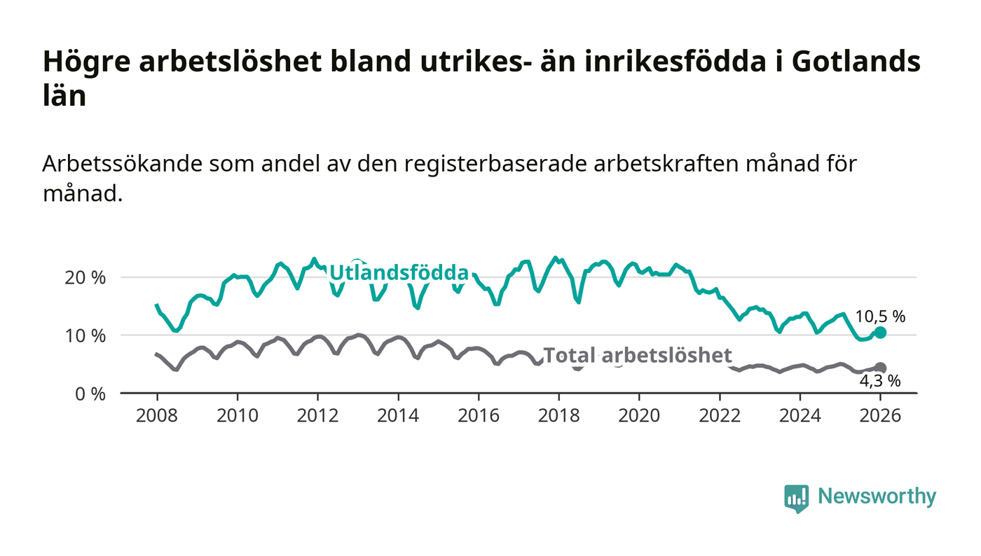 Arbetslösheten bland utlandsfödda var 10,5 procent på Gotland under januari månad, motsvarande 303 av 2 886 personer. Det är 2,9 procentenheter färre än vid samma tidpunkt i fjol (−75 om man räknar personer). Därmed är de utlandsföddas arbetslöshet lägre än vid samma tidpunkt i fjol för tolfte månaden i följd. Sedan januari 2025 har arbetslösheten bland utlandsfödda minskat från 13,4 till 10,5 procent.