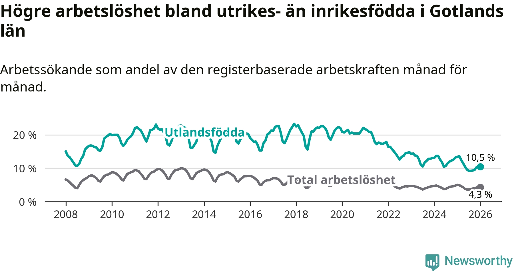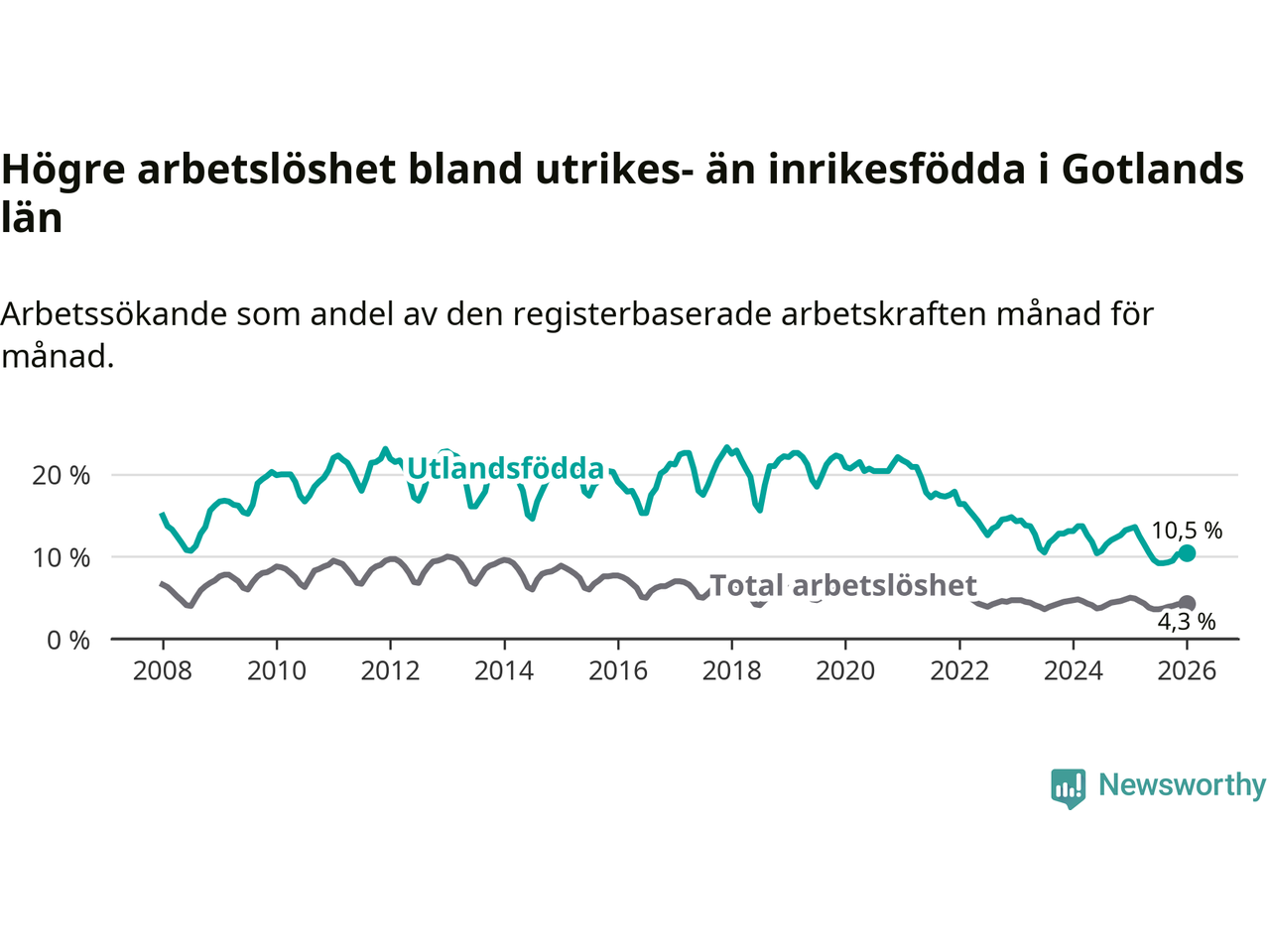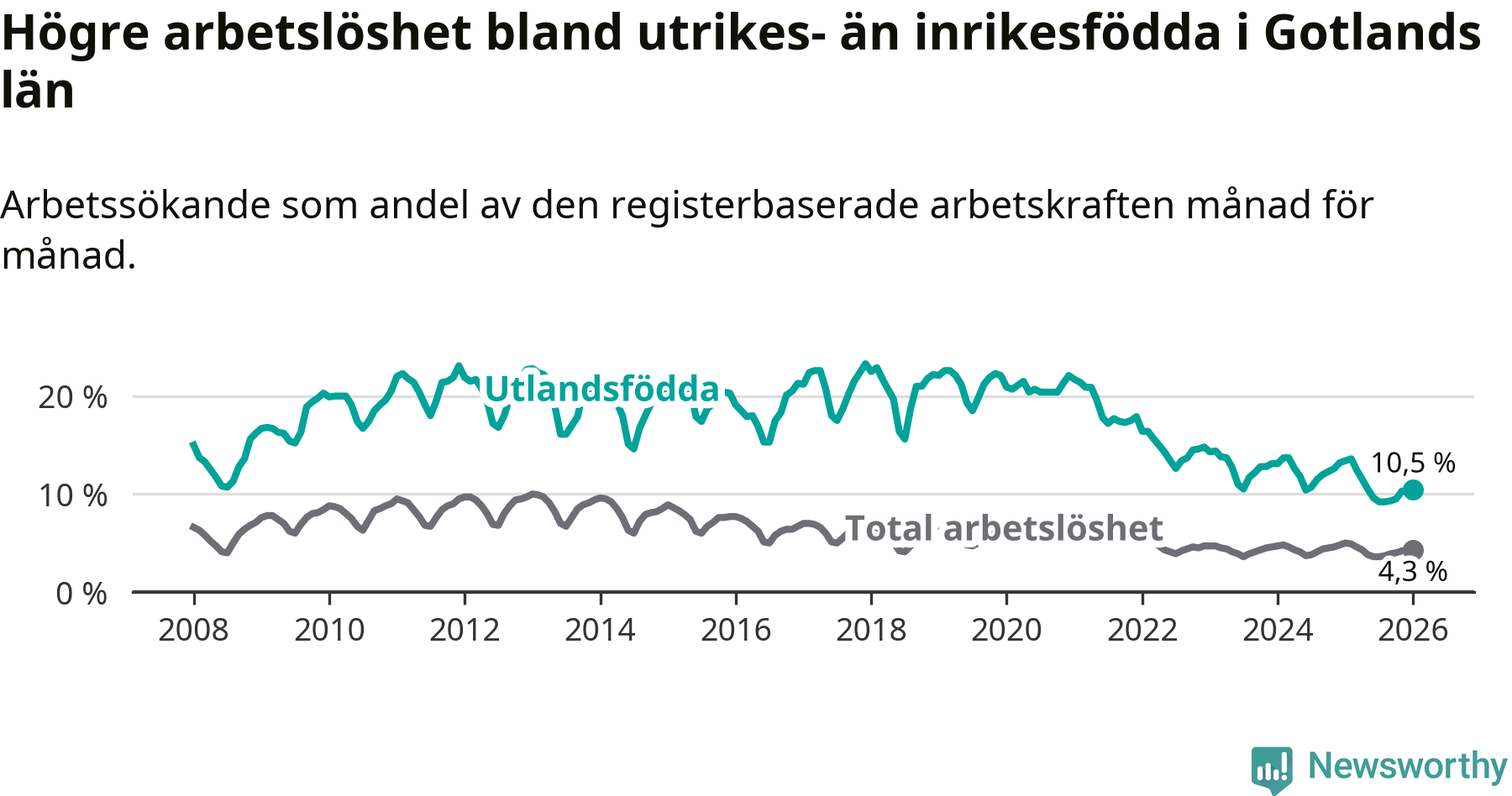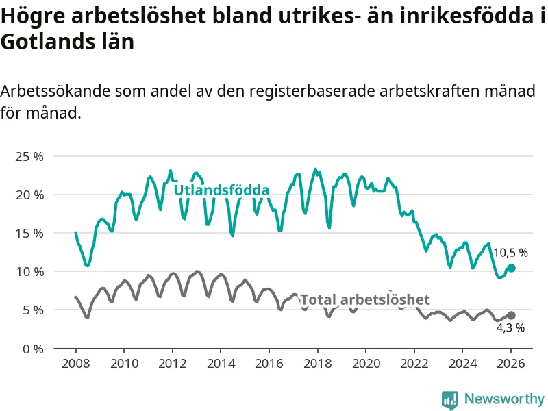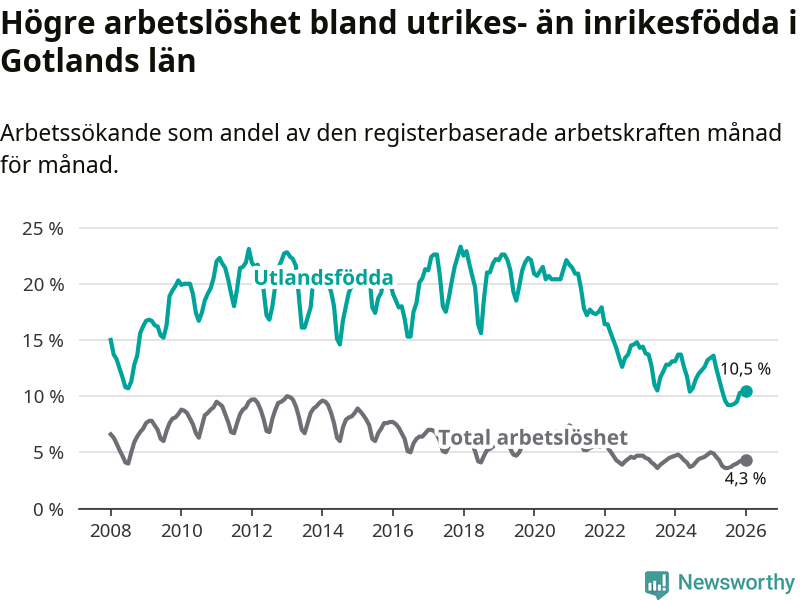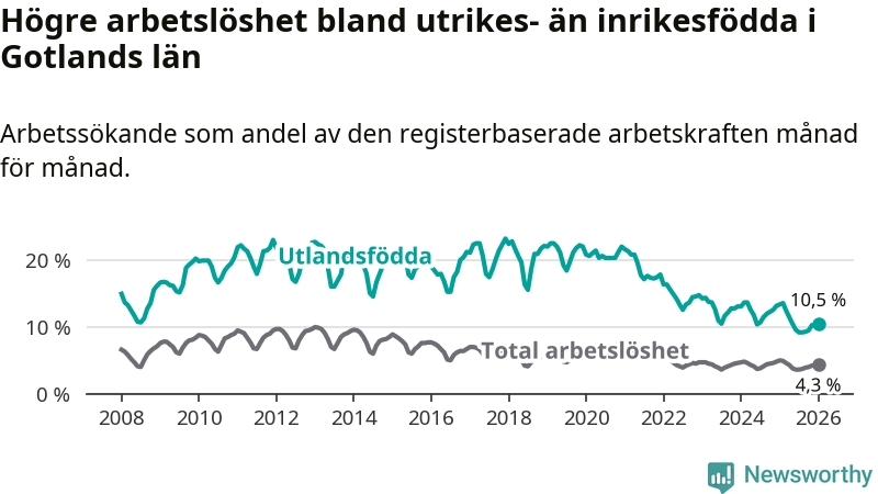 Arbetslösheten bland utlandsfödda var 10,5 procent på Gotland under januari månad, motsvarande 303 av 2 886 personer. Det är 2,9 procentenheter färre än vid samma tidpunkt i fjol (−75 om man räknar personer). Därmed är de utlandsföddas arbetslöshet lägre än vid samma tidpunkt i fjol för tolfte månaden i följd. Sedan januari 2025 har arbetslösheten bland utlandsfödda minskat från 13,4 till 10,5 procent.