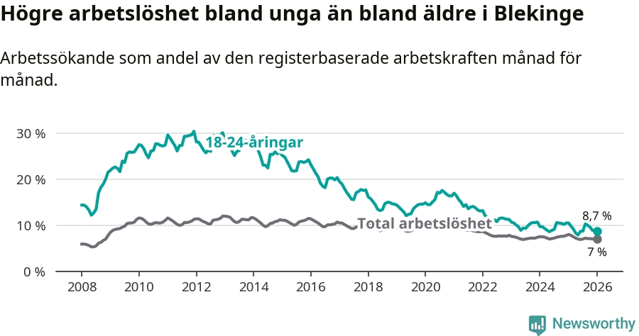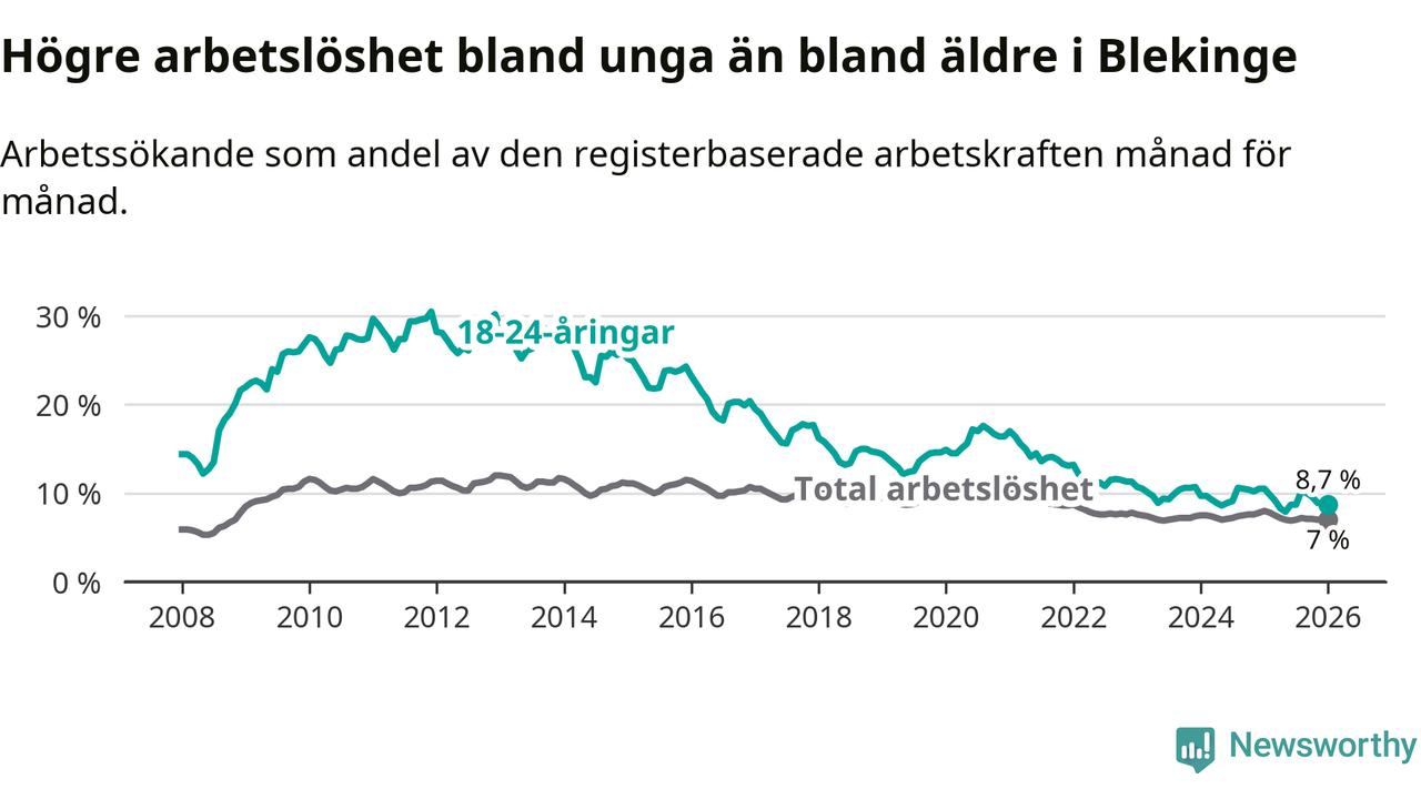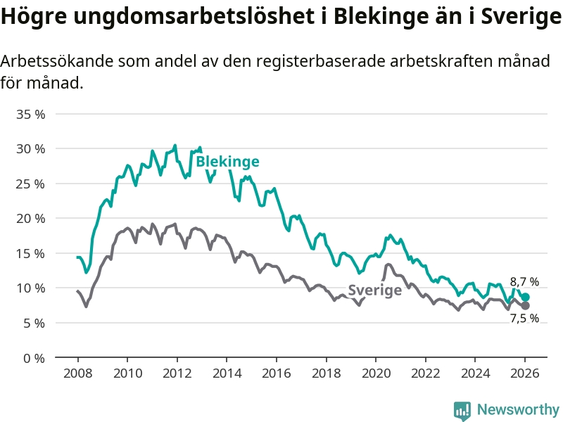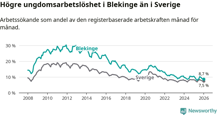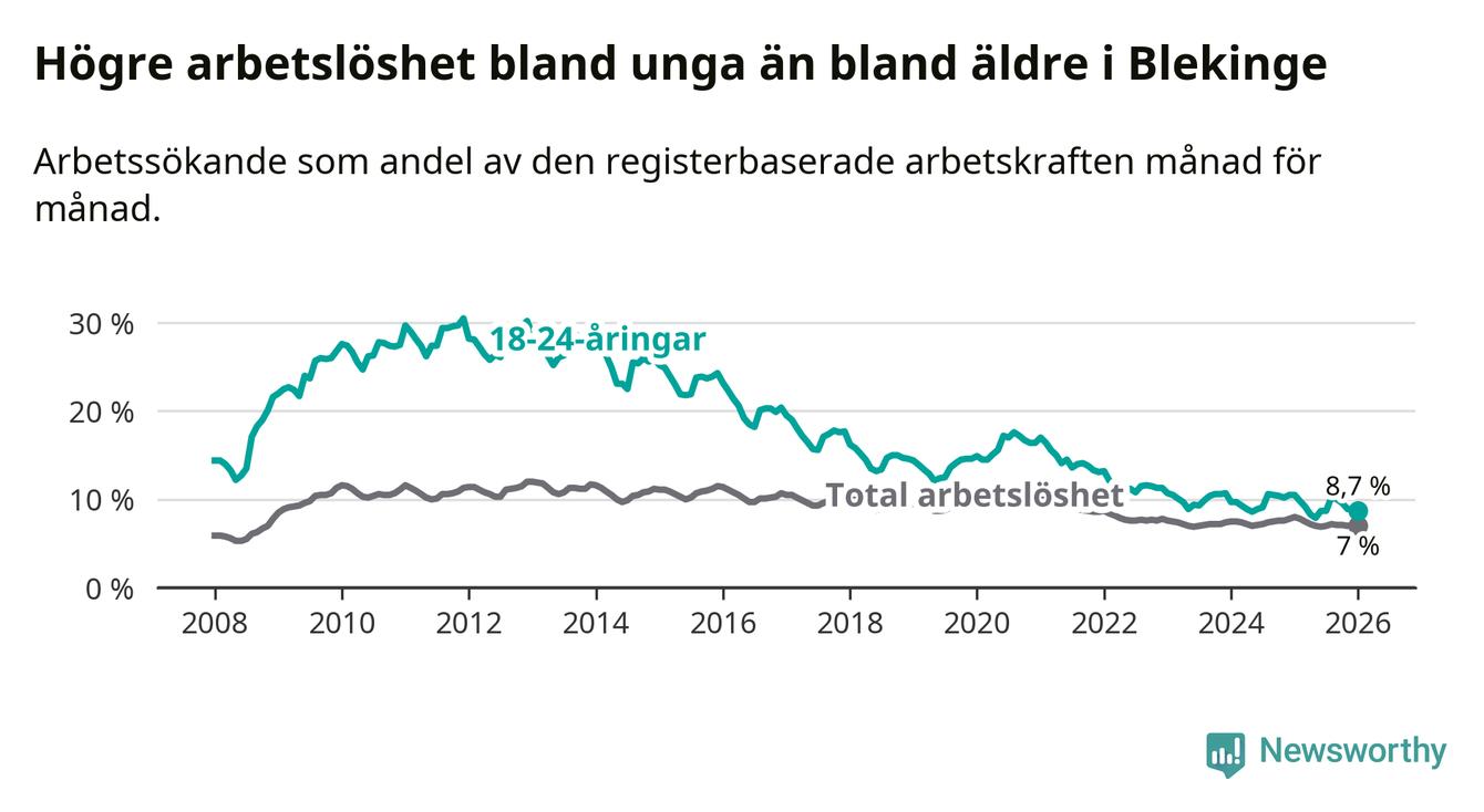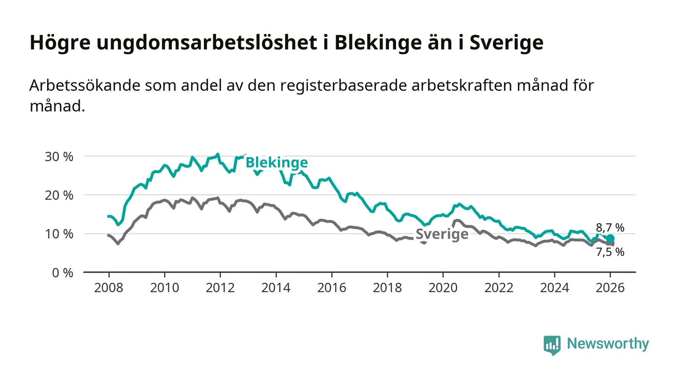 I och med den senaste månadens nedgång har de ungas arbetslöshet i Blekinge sjunkit elva månader i följd (ner från 9,8 procent i februari 2025 till 8,7 procent nu).