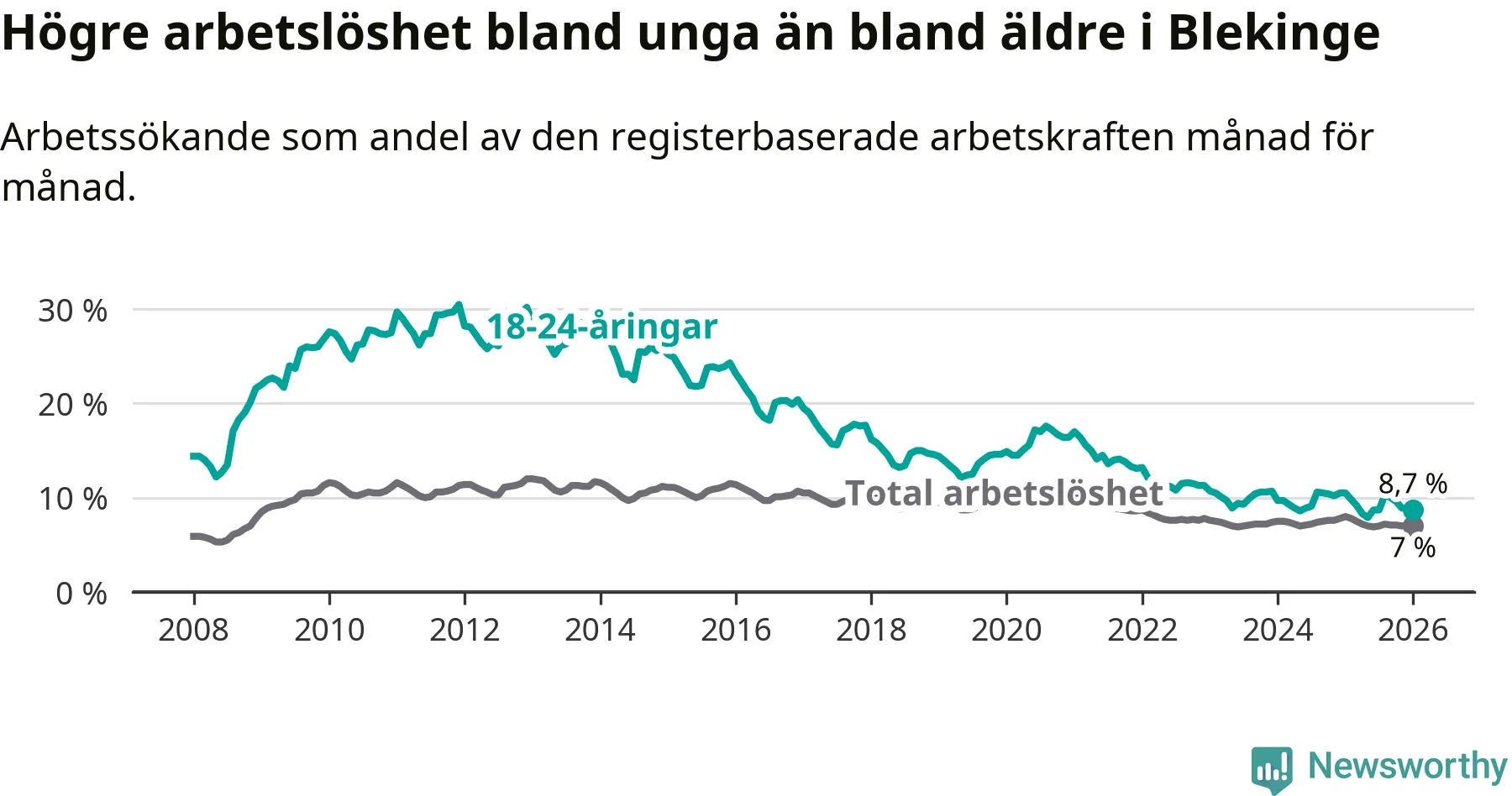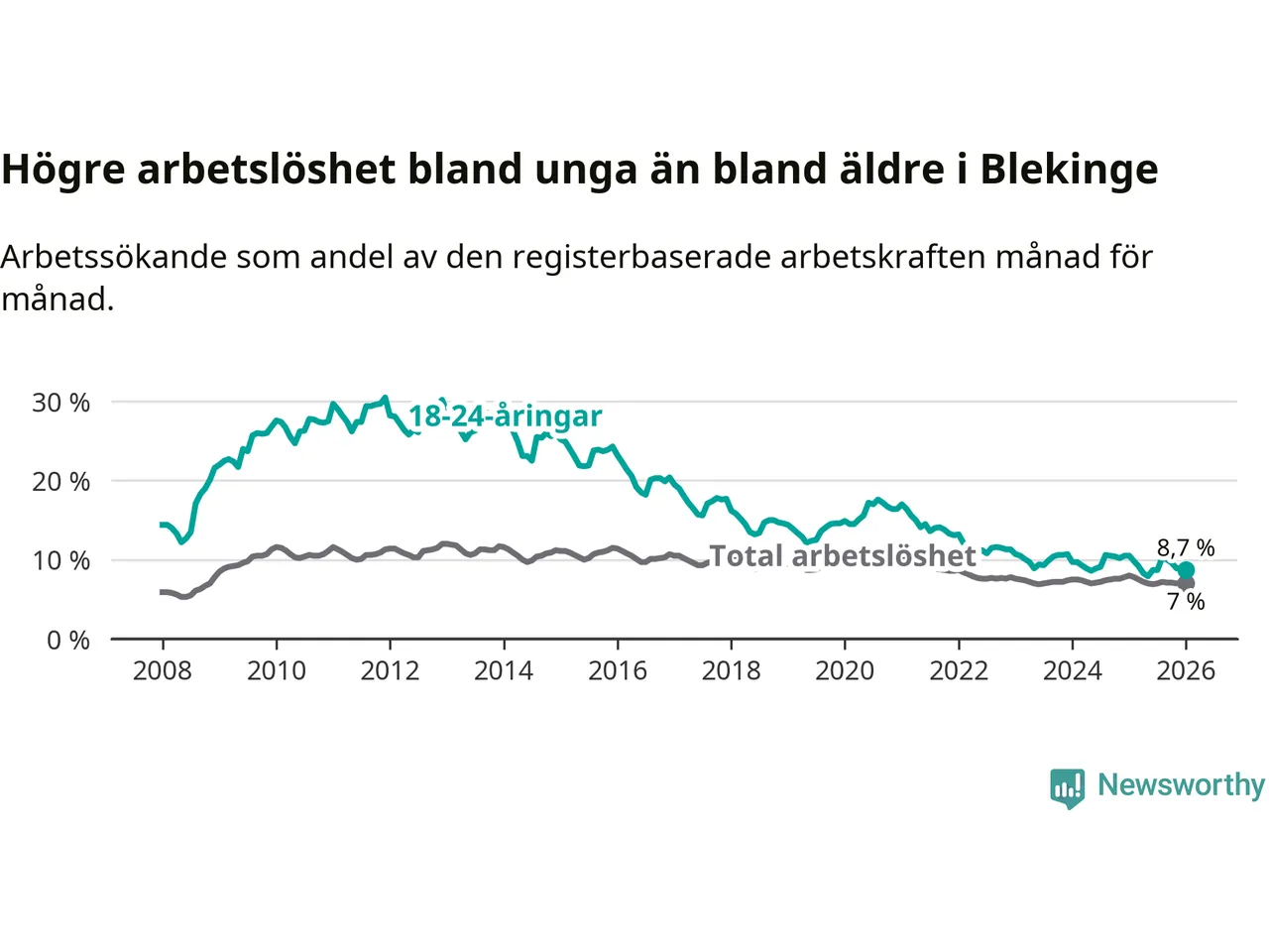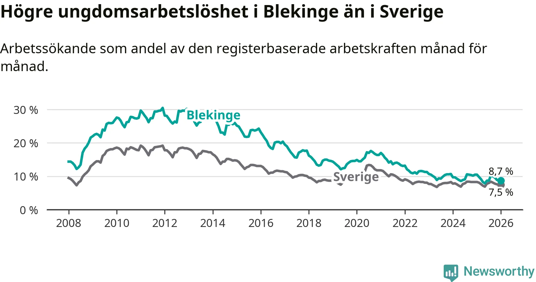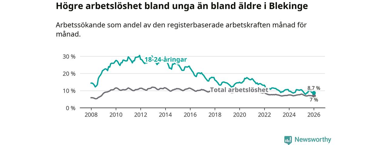 I och med den senaste månadens nedgång har de ungas arbetslöshet i Blekinge sjunkit elva månader i följd (ner från 9,8 procent i februari 2025 till 8,7 procent nu).