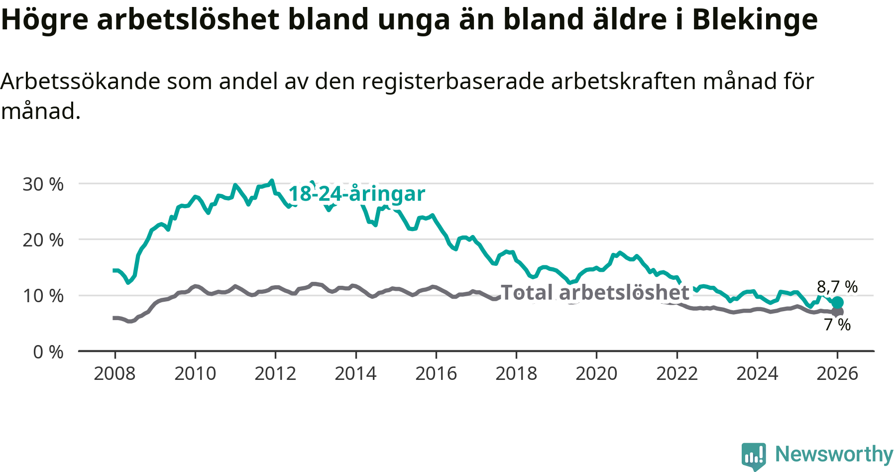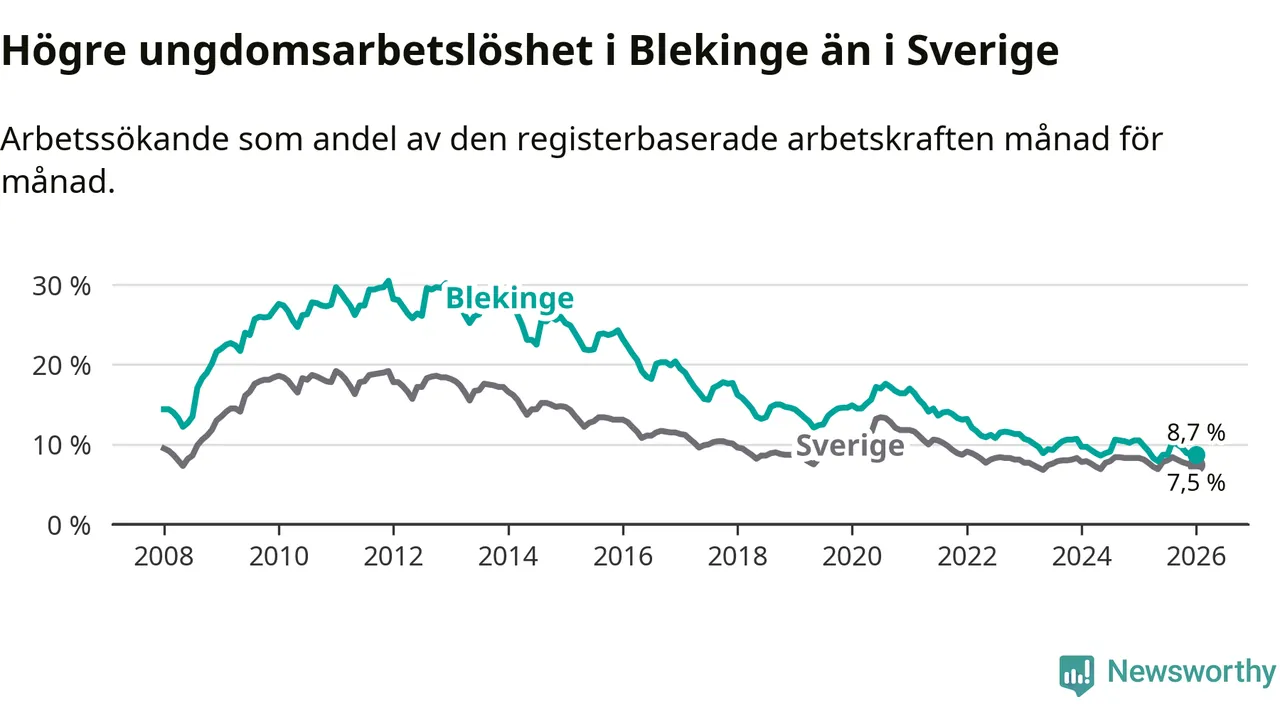 Graf: Arbetslöshet bland unga i Blekinge län och Sverige
