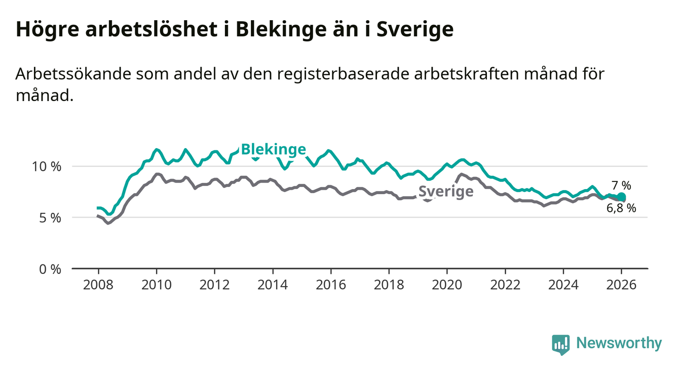Även om arbetslösheten i Blekinge alltså minskar, så ligger den fortfarande över snittet i hela Sverige (7,0 procent i länet, jämfört med 6,8 procent i hela riket). Norrbotten har den lägsta arbetslösheten i riket (3,9 procent), medan Skåne har den högsta (8,9 procent). För att Blekinge skulle komma ner i samma arbetslöshetsnivå som Norrbotten skulle 2 373 personer behöva sysselsättas.