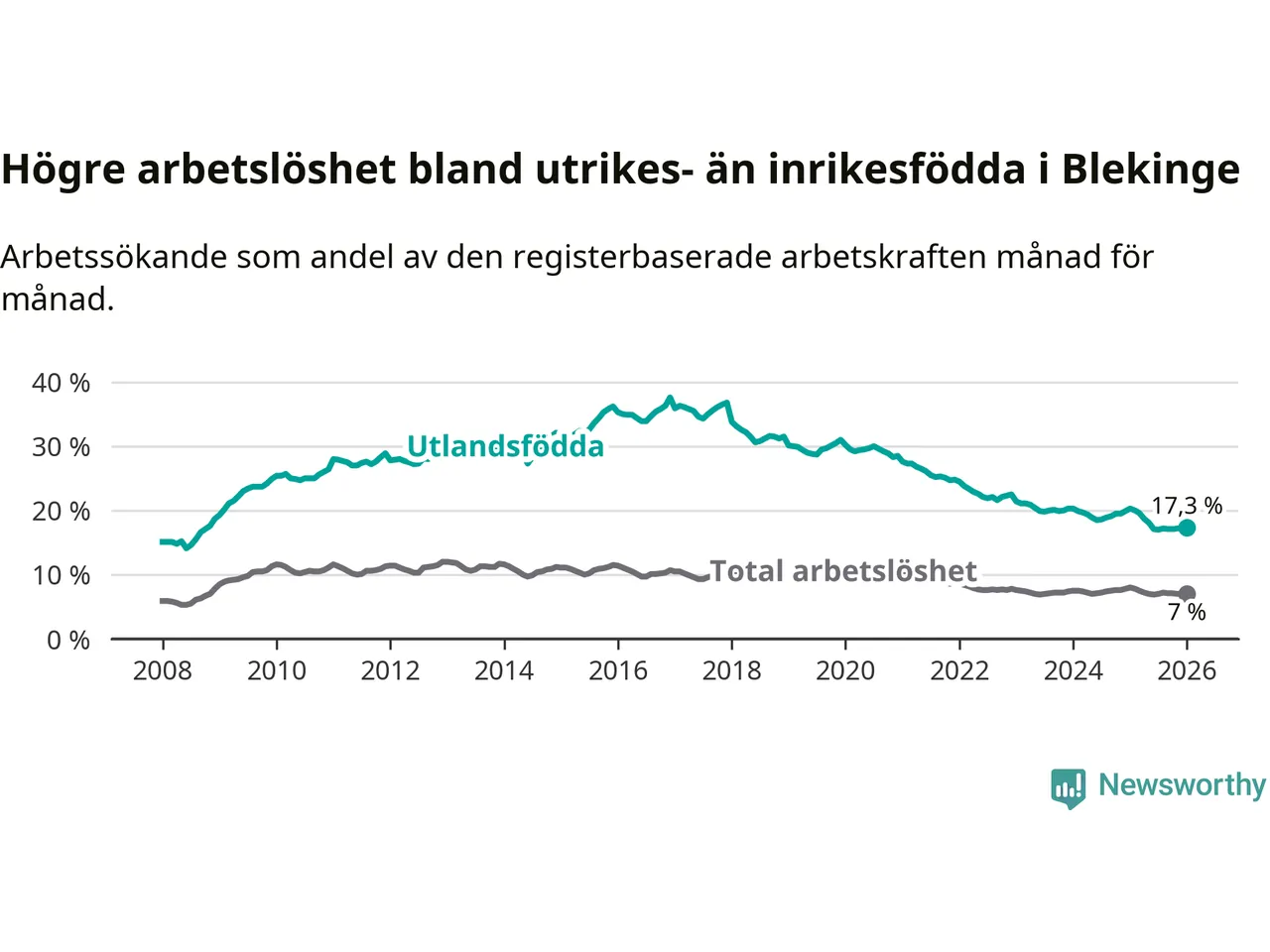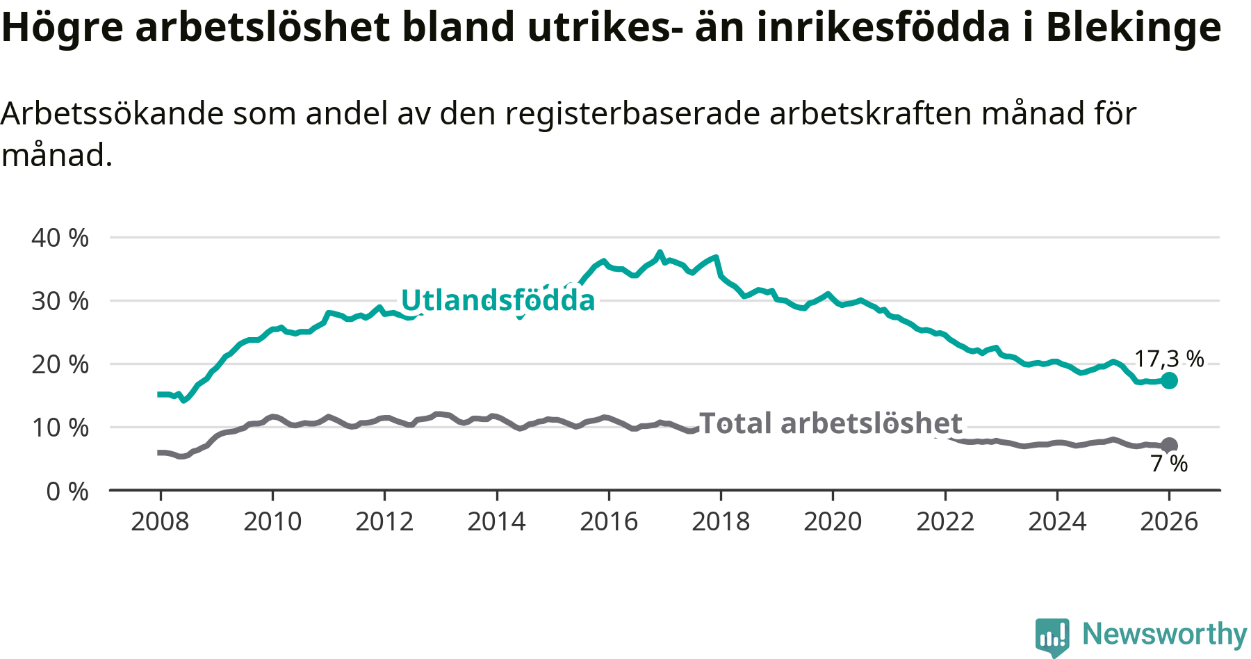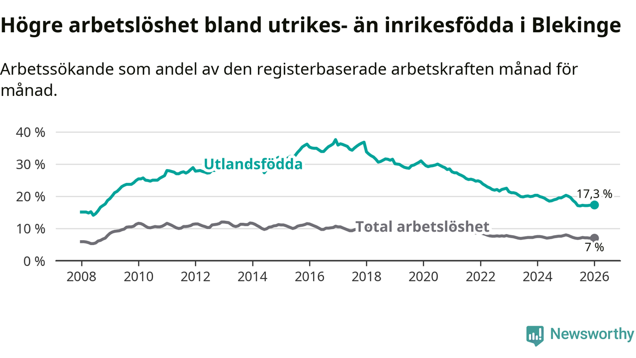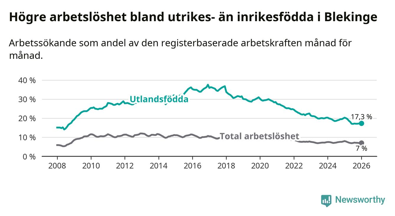 Arbetslösheten bland utlandsfödda var 17,3 procent i Blekinge under januari månad, motsvarande 2 310 av 13 353 personer. Det är 3,0 procentenheter färre än vid samma tidpunkt i fjol (−385 om man räknar personer). Därmed är de utlandsföddas arbetslöshet lägre än vid samma tidpunkt i fjol för elfte månaden i följd. Sedan februari 2025 har arbetslösheten bland utlandsfödda minskat från 20,0 till 17,3 procent.