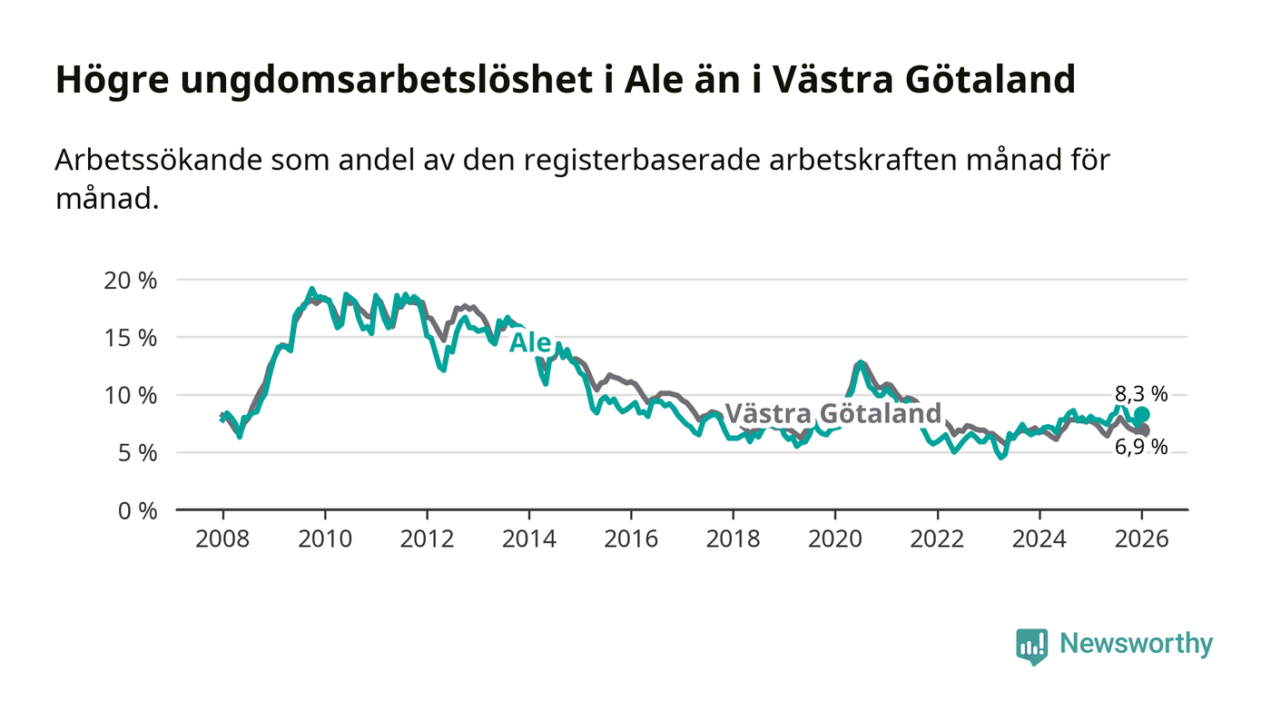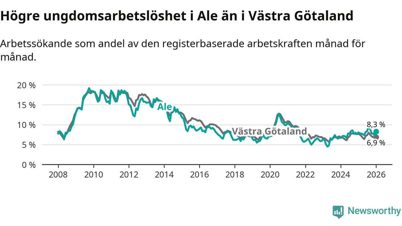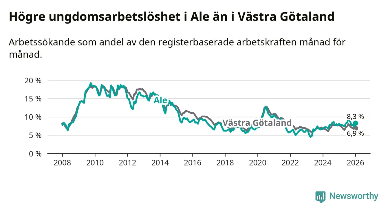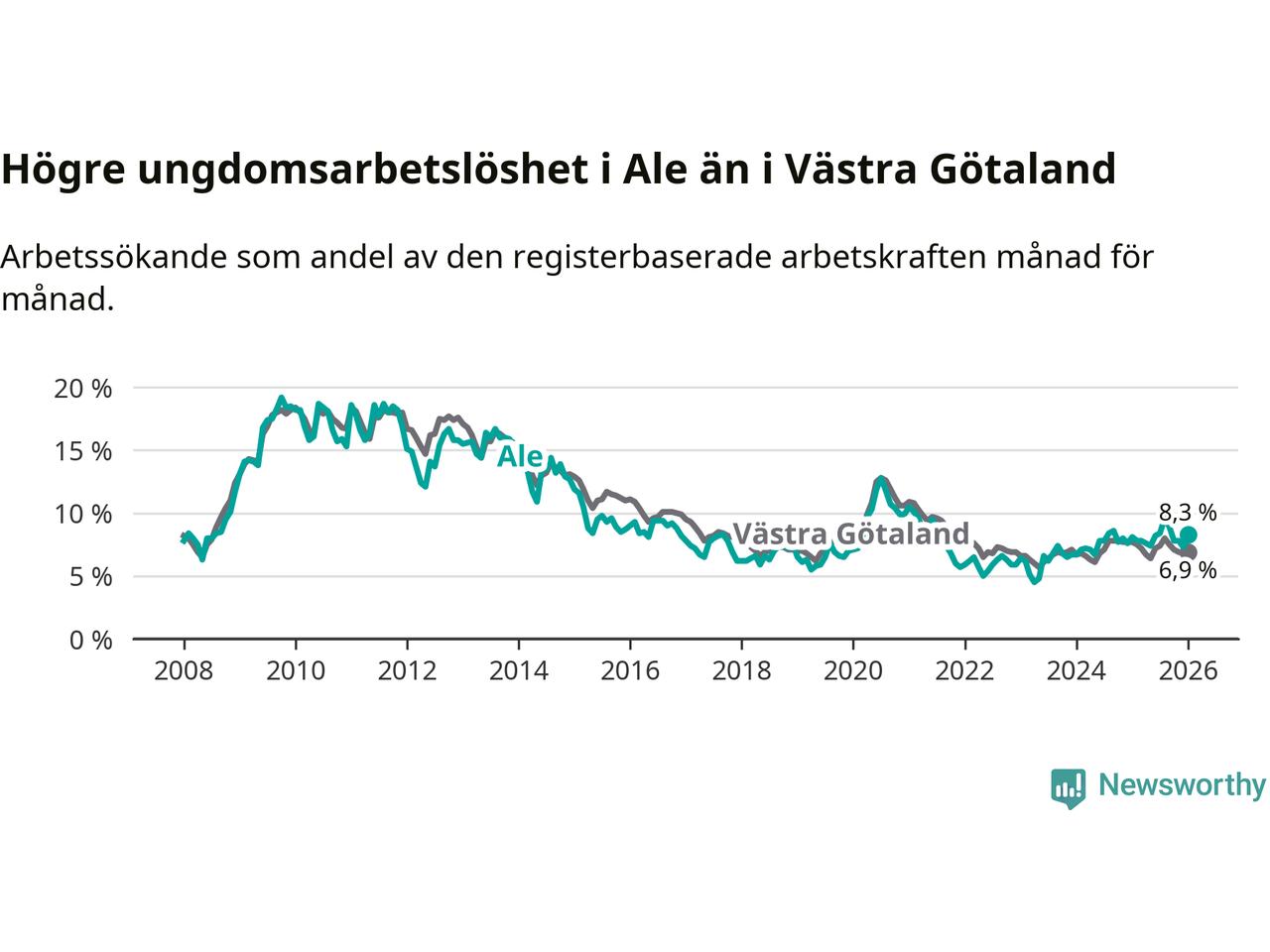 Medan Ale har lägre total arbetslöshet än Västra Götaland, ligger ungdomsarbetslösheten 1,4 procentenheter högre i Ale.