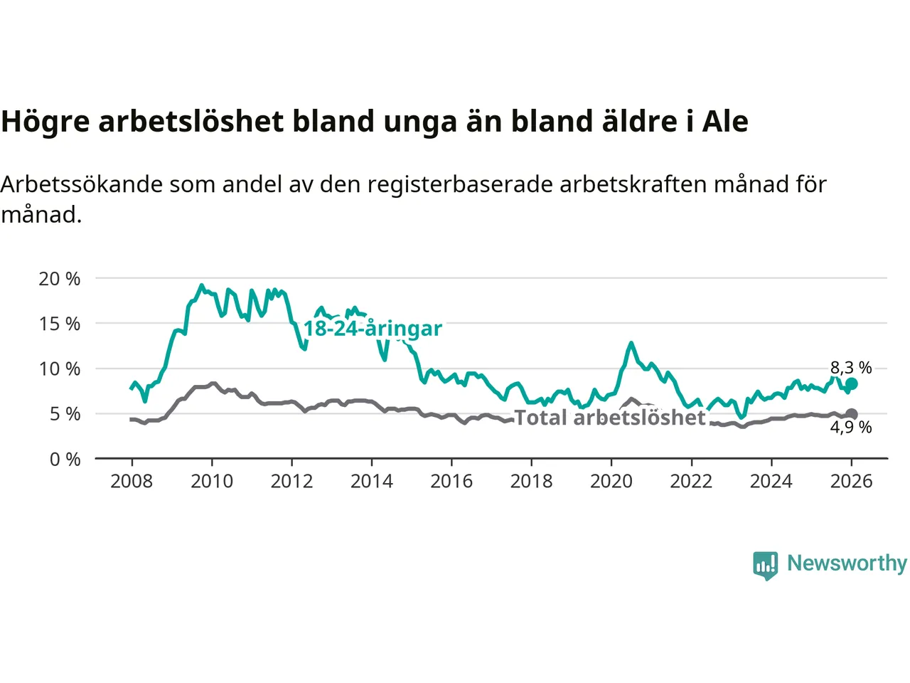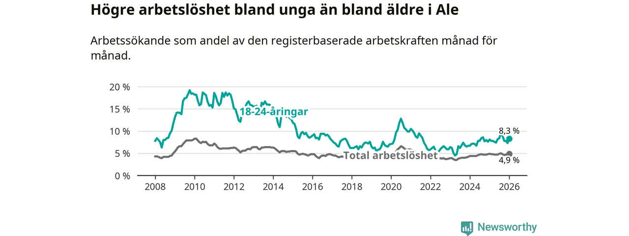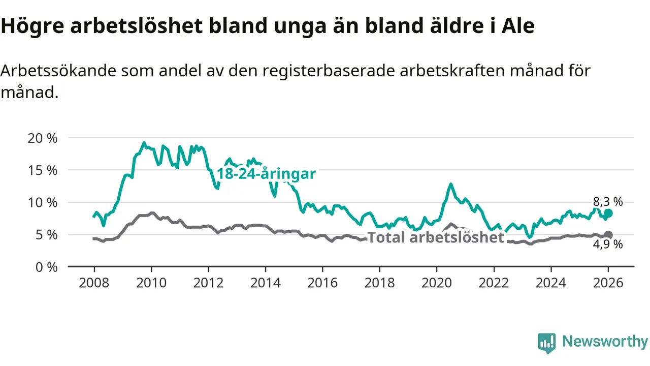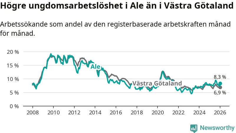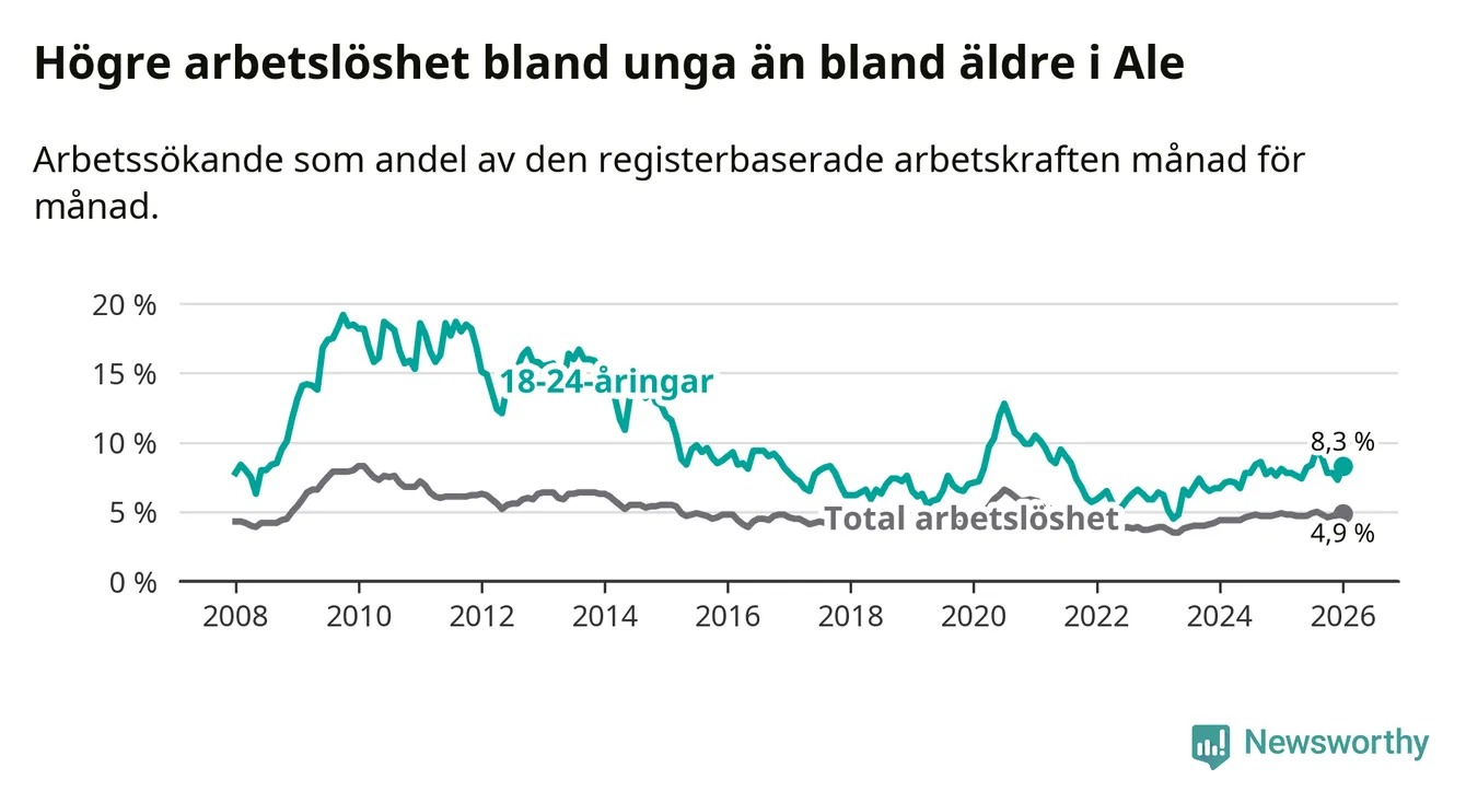 Medan Ale har lägre total arbetslöshet än Västra Götaland, ligger ungdomsarbetslösheten 1,4 procentenheter högre i Ale.