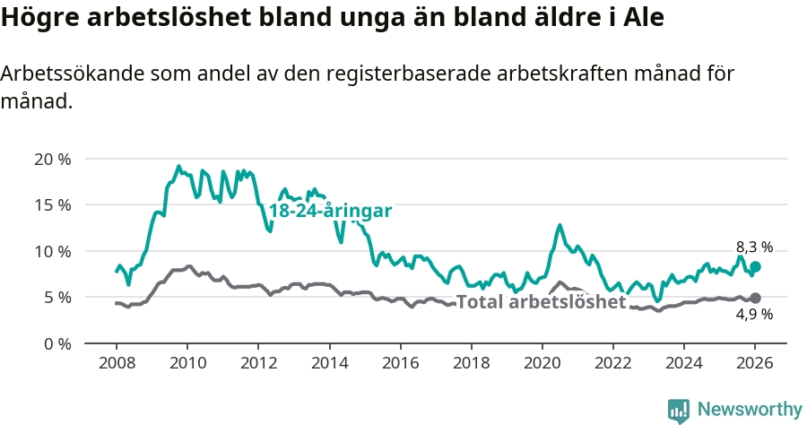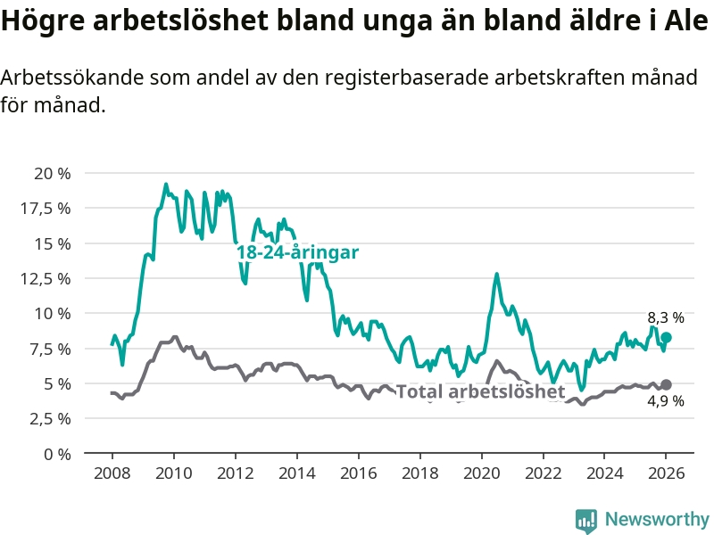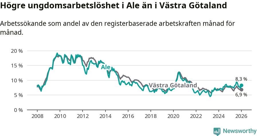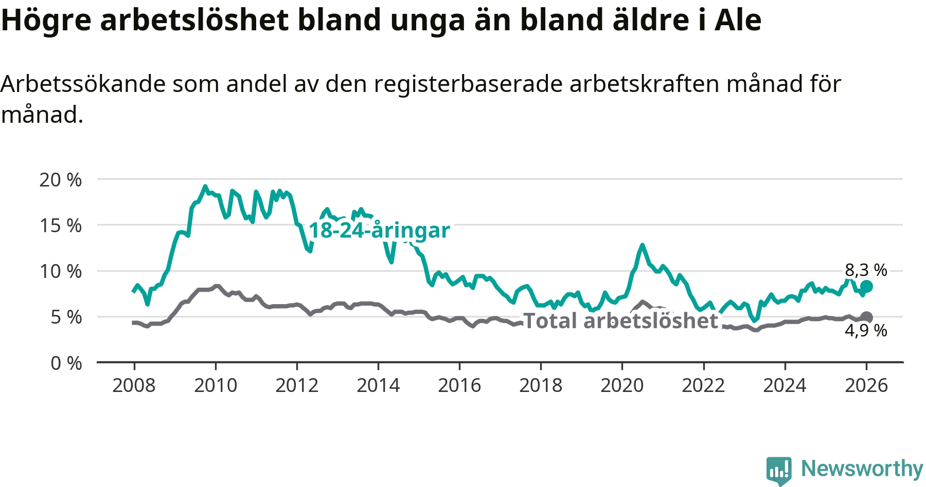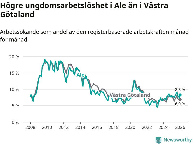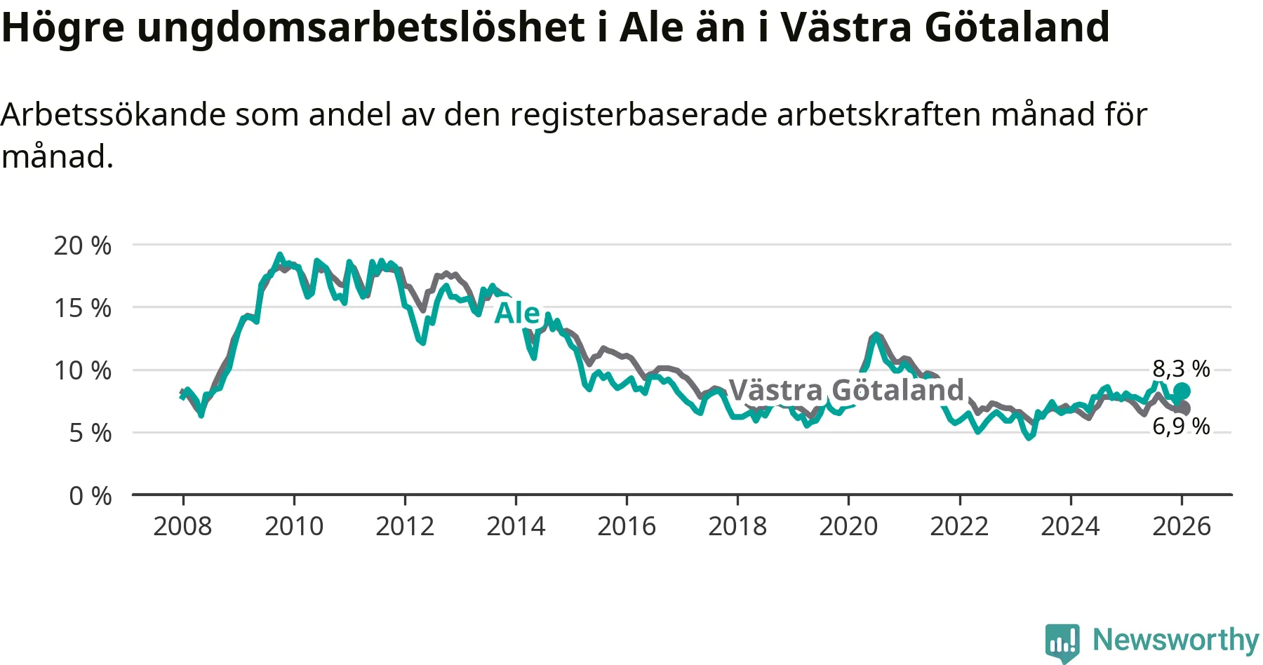 Medan Ale har lägre total arbetslöshet än Västra Götaland, ligger ungdomsarbetslösheten 1,4 procentenheter högre i Ale.