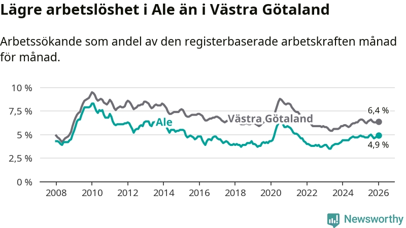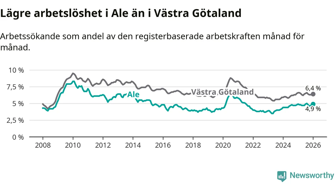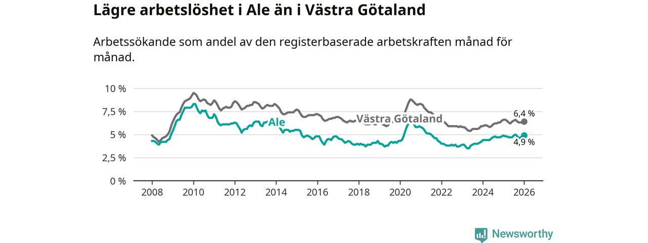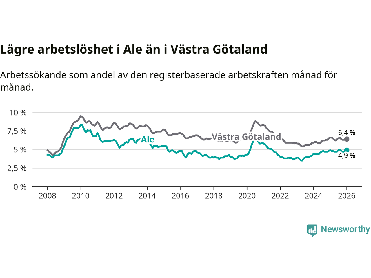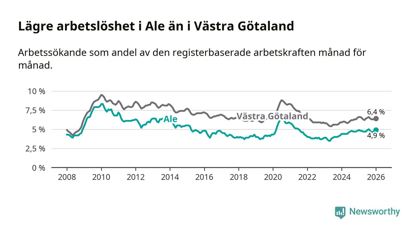 Ale går därmed mot strömmen i förhållande till andra kommuner i Västra Götalands län. I de flesta andra kommuner i länet går arbetslösheten nedåt. Störst är minskningen i Mellerud, där arbetslösheten sjunker med 1,7 procentenheter. I tabellen längre ner ser du utvecklingen i samtliga kommuner i länet.