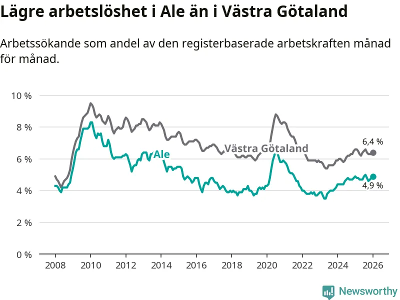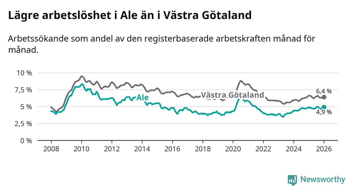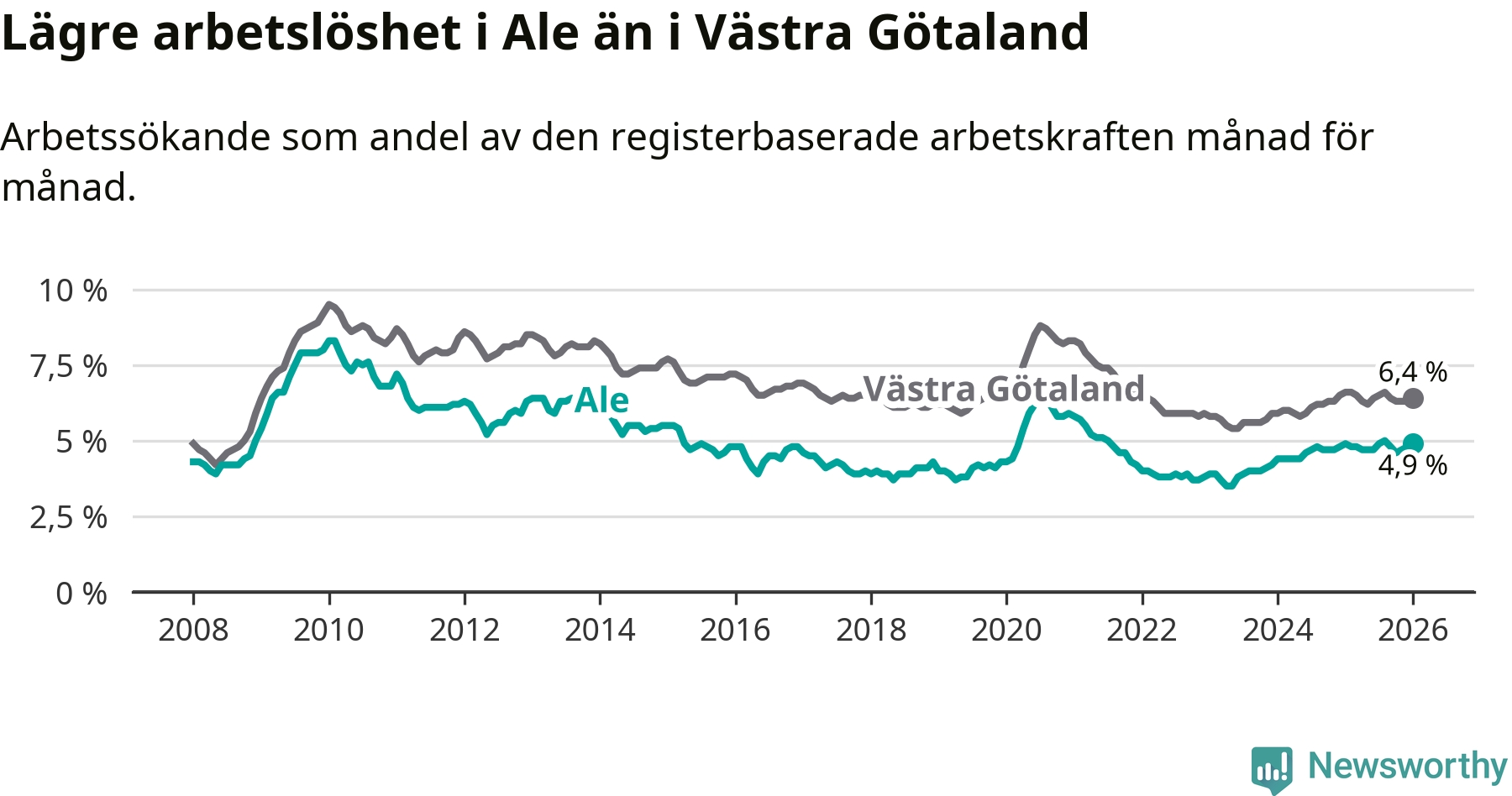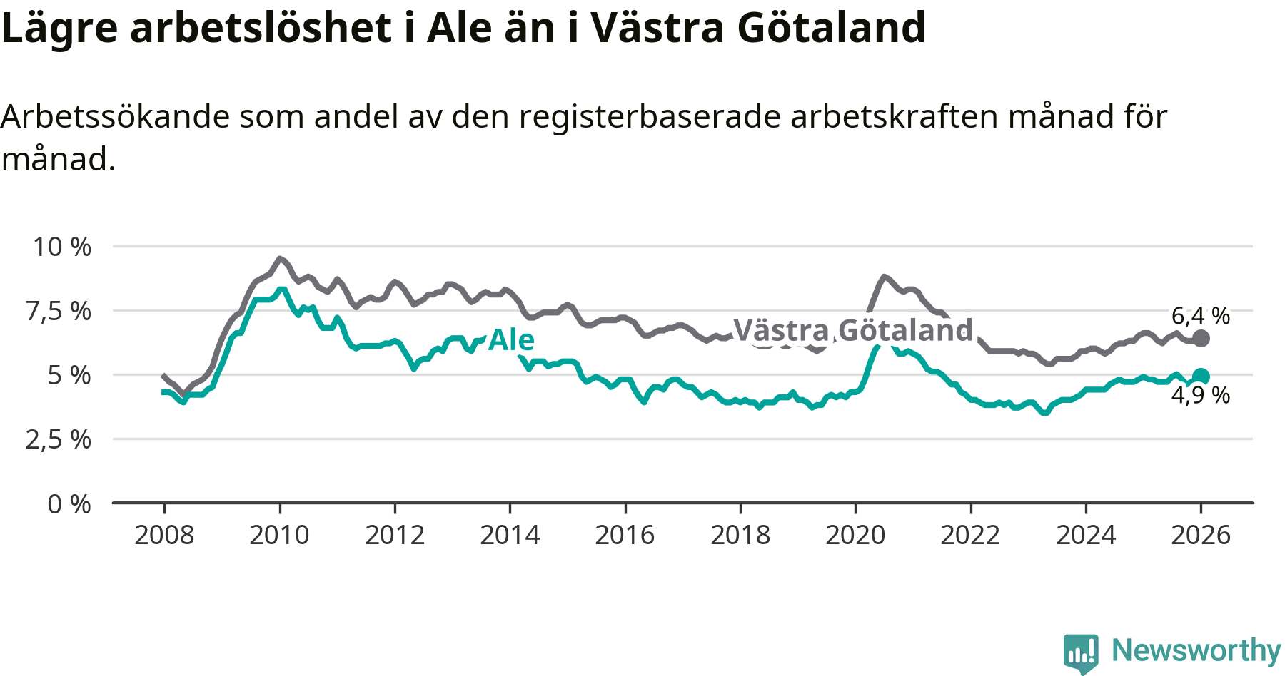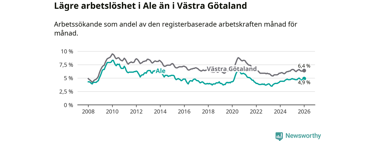 Ale går därmed mot strömmen i förhållande till andra kommuner i Västra Götalands län. I de flesta andra kommuner i länet går arbetslösheten nedåt. Störst är minskningen i Mellerud, där arbetslösheten sjunker med 1,7 procentenheter. I tabellen längre ner ser du utvecklingen i samtliga kommuner i länet.