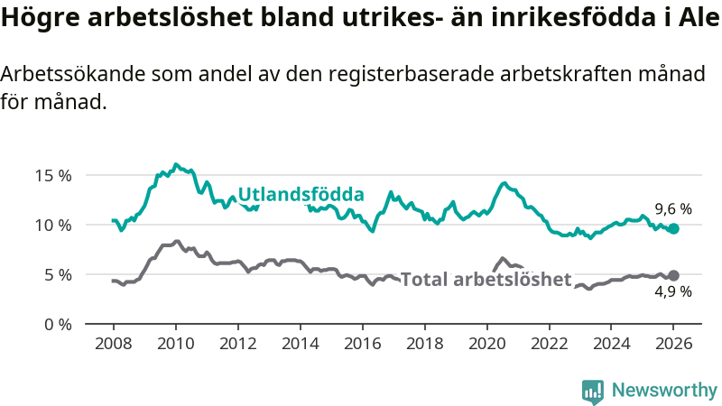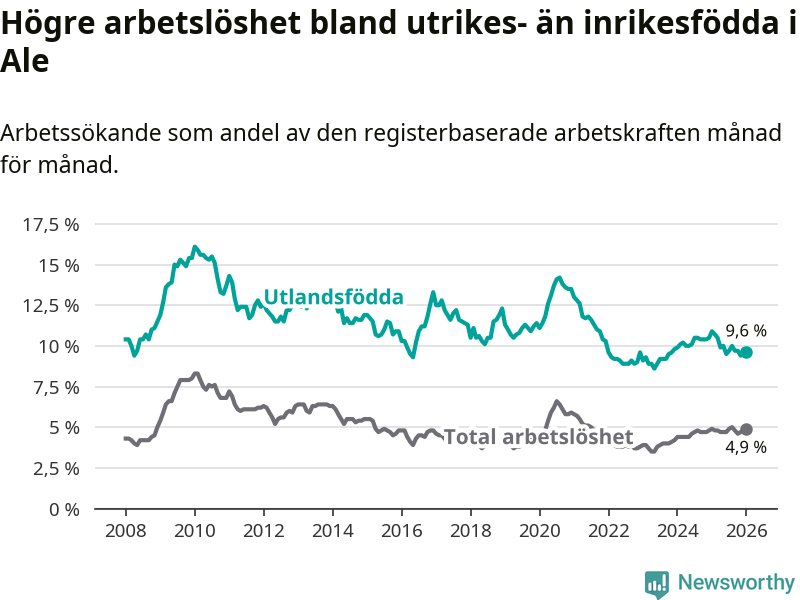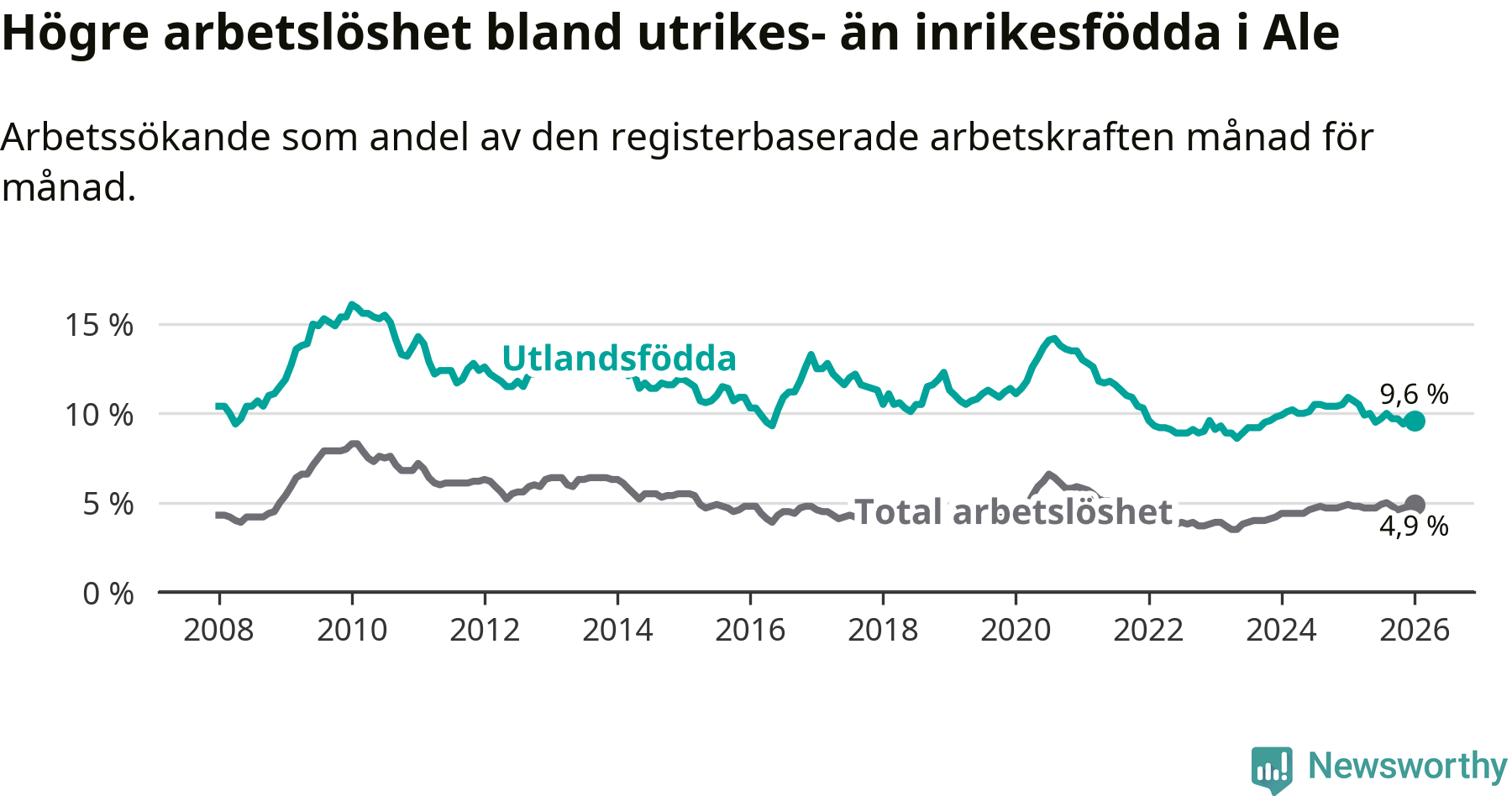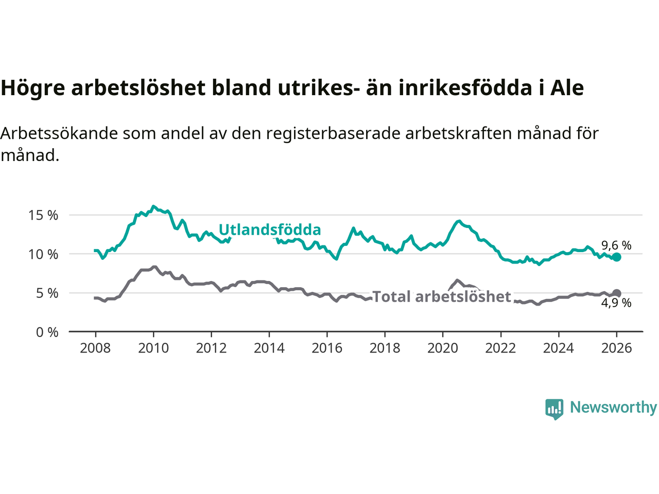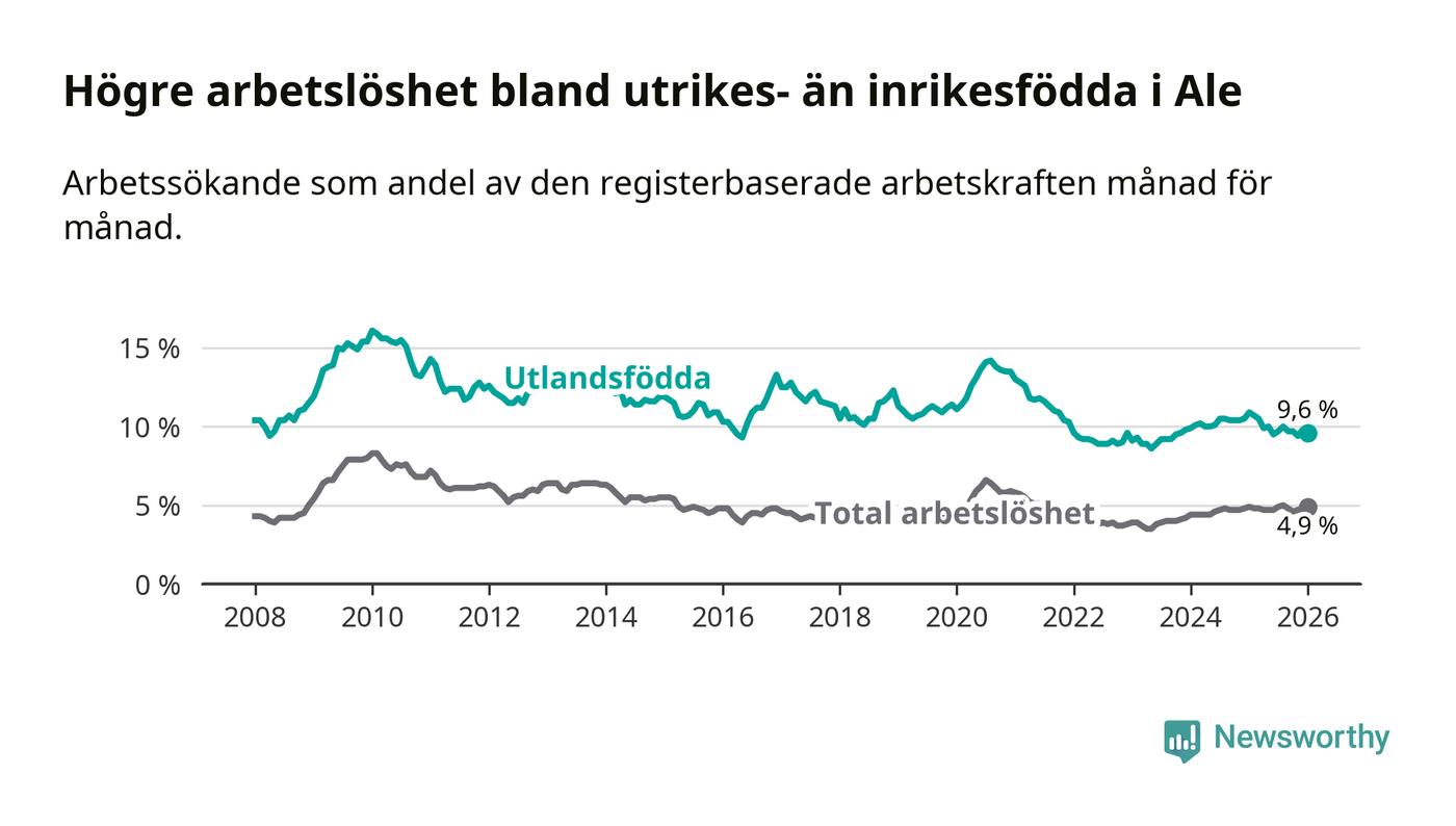 Arbetslösheten bland utlandsfödda var 9,6 procent i Ale under januari månad, motsvarande 376 av 3 917 personer. Det är 1,3 procentenheter färre än vid samma tidpunkt i fjol (−41 om man räknar personer). Därmed är de utlandsföddas arbetslöshet lägre än vid samma tidpunkt i fjol för åttonde månaden i följd.