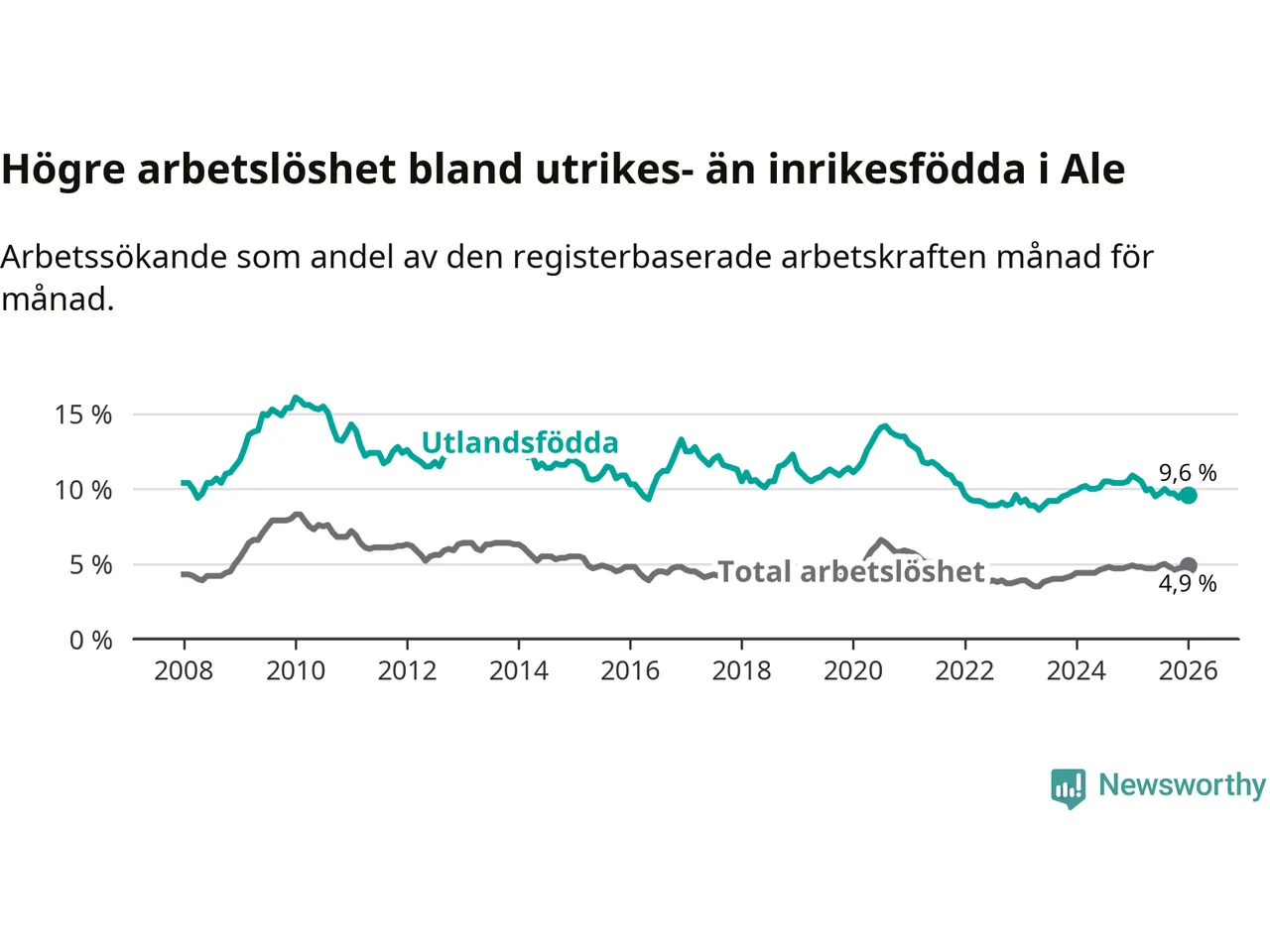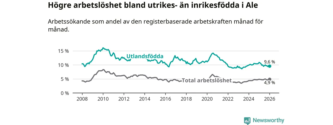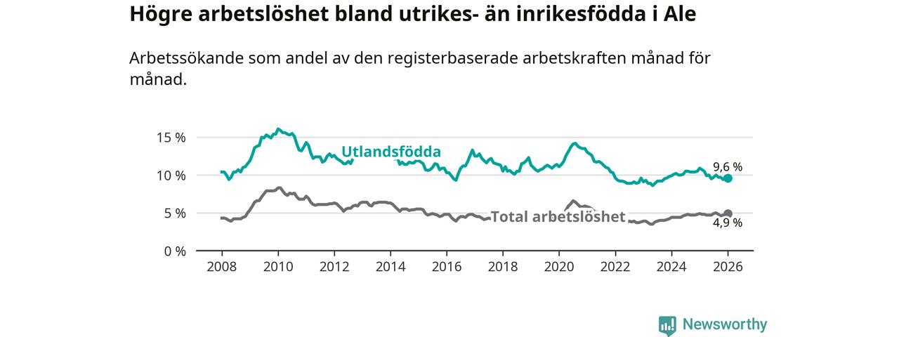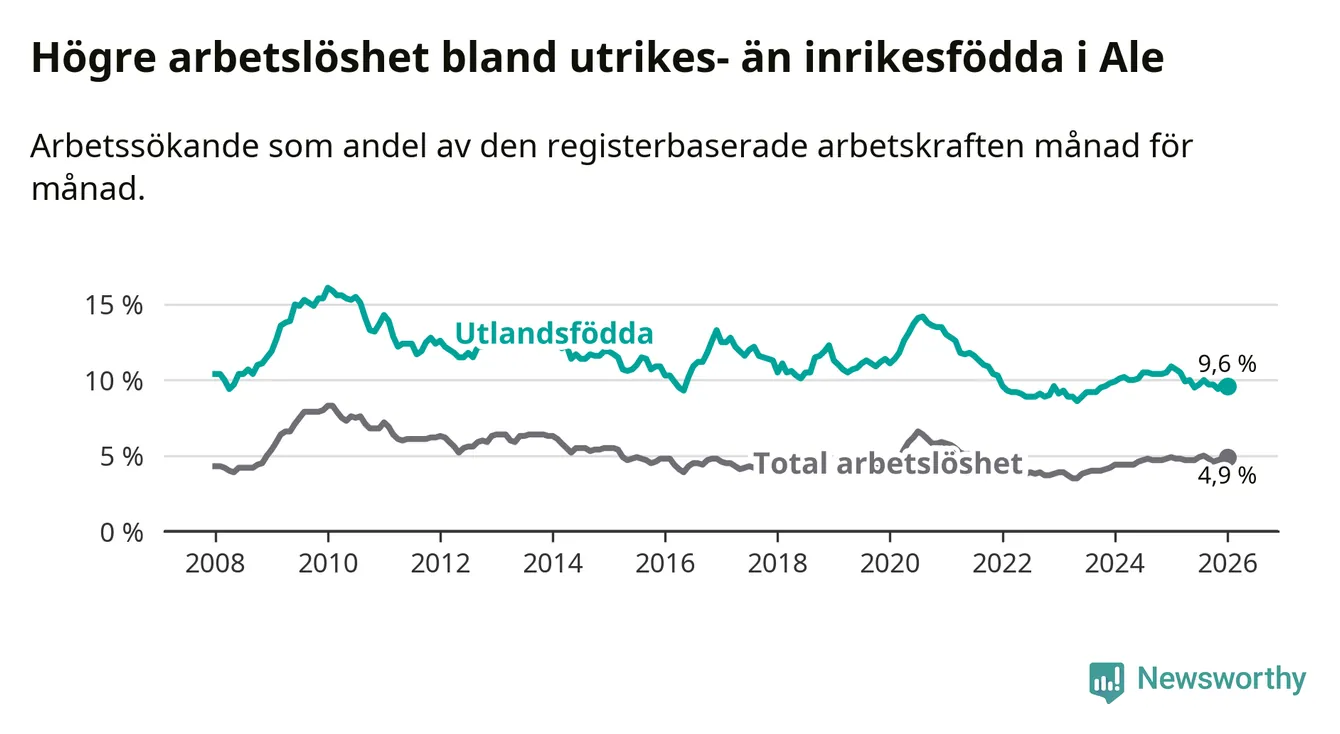 Skillnaden i arbetslöshet mellan utrikesfödda och hela befolkningen är 4,7 procentenheter i Ale. Det är en mindre skillnad än för ett år sedan (−1,3 procentenheter).