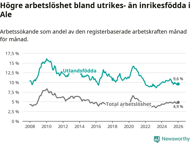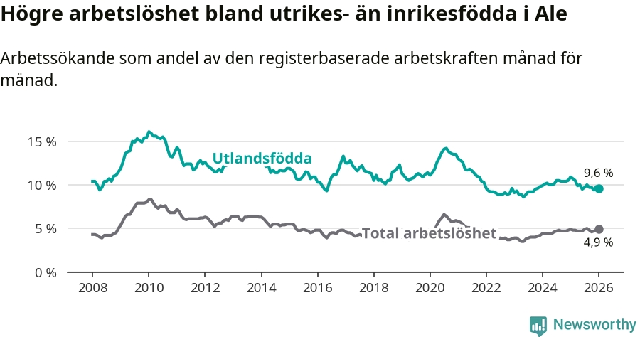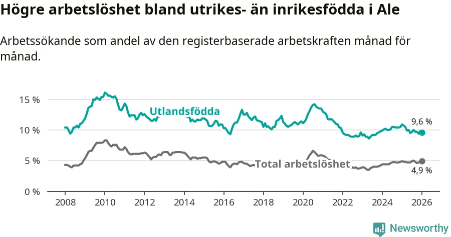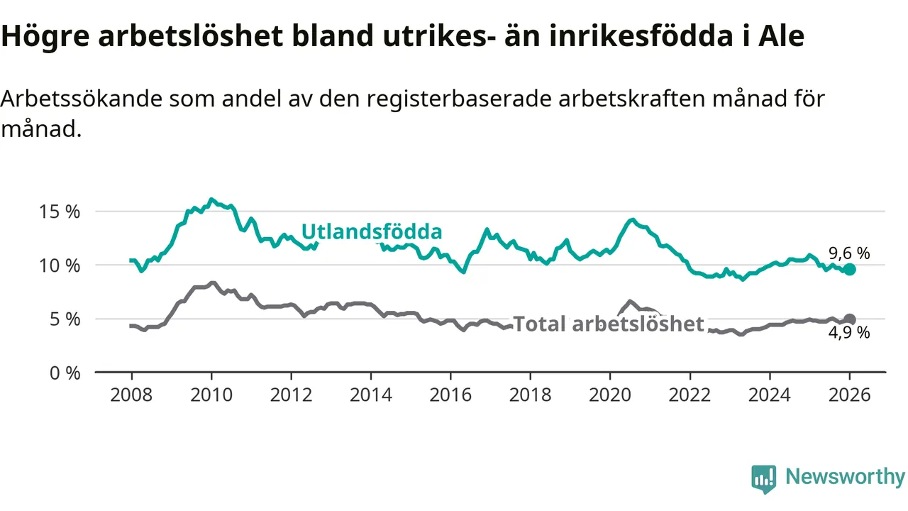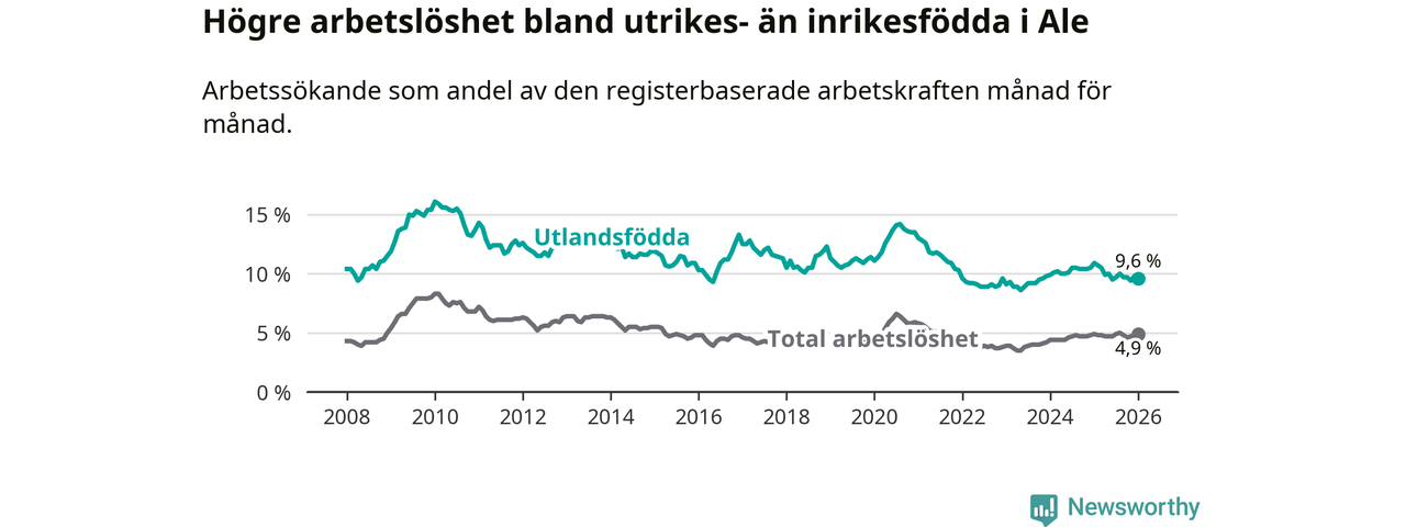 Skillnaden i arbetslöshet mellan utrikesfödda och hela befolkningen är 4,7 procentenheter i Ale. Det är en mindre skillnad än för ett år sedan (−1,3 procentenheter).