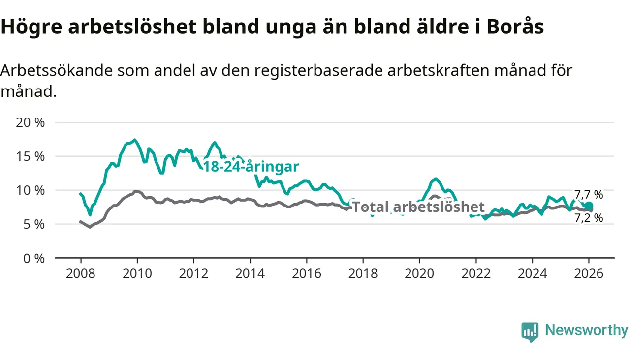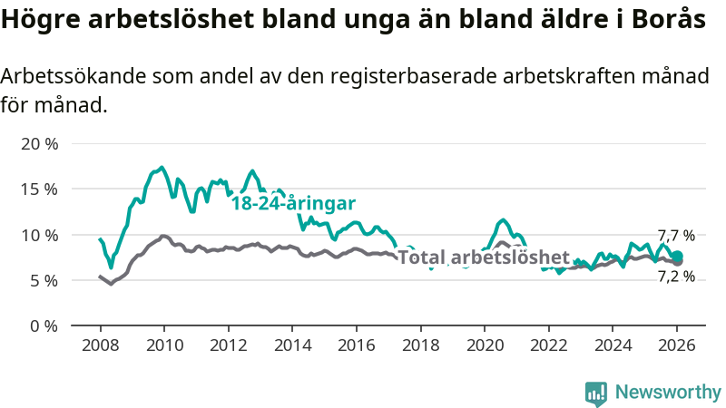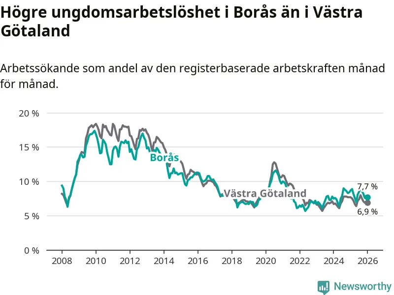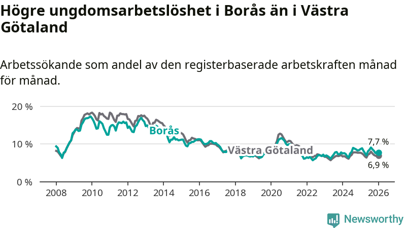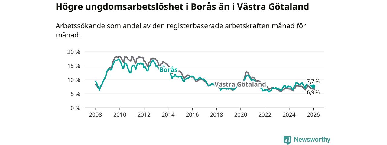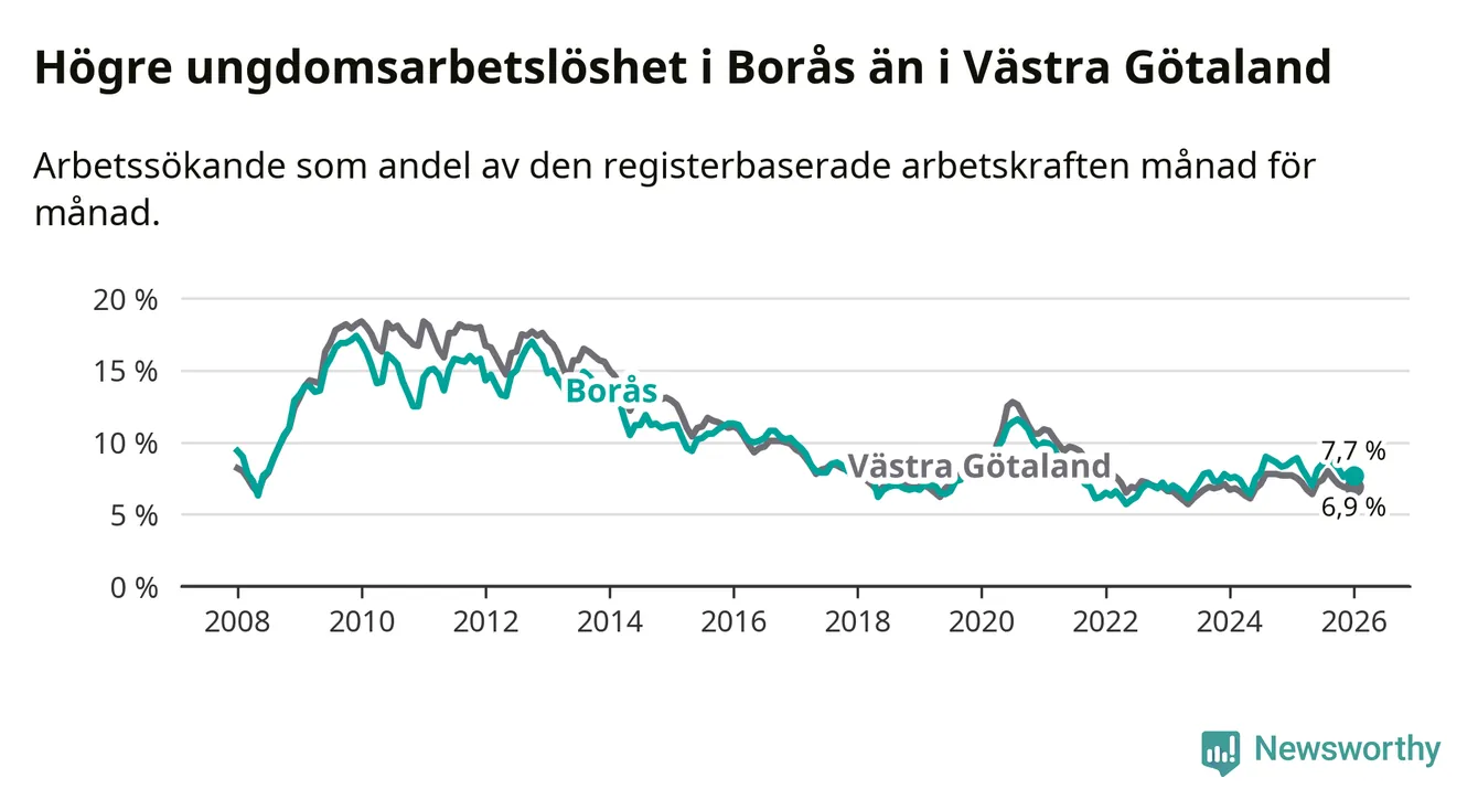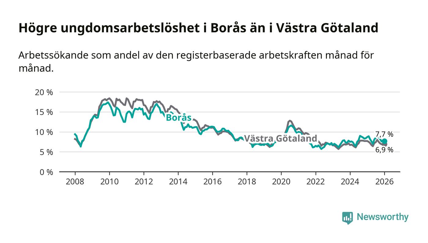 Precis som den totala arbetslösheten ligger ungdomsarbetslösheten i Borås högre än i Västra Götaland som helhet. Skillnaden mellan kommunen och länet är 0,8 procentenheter.