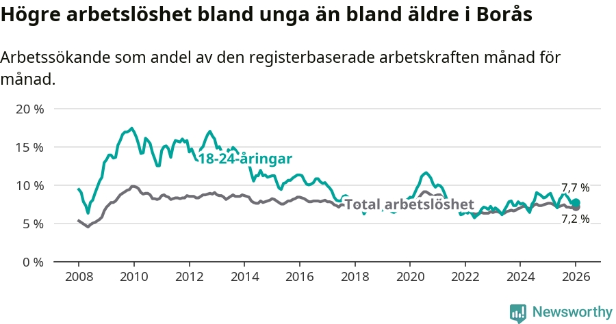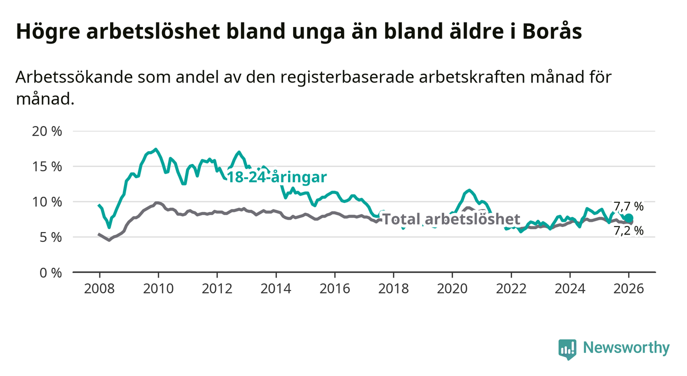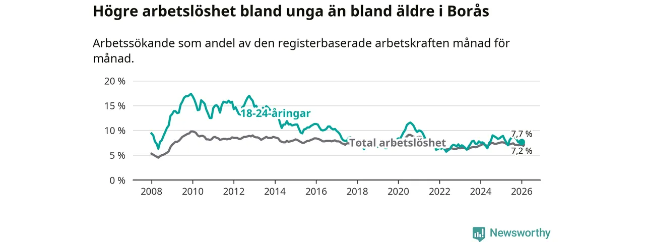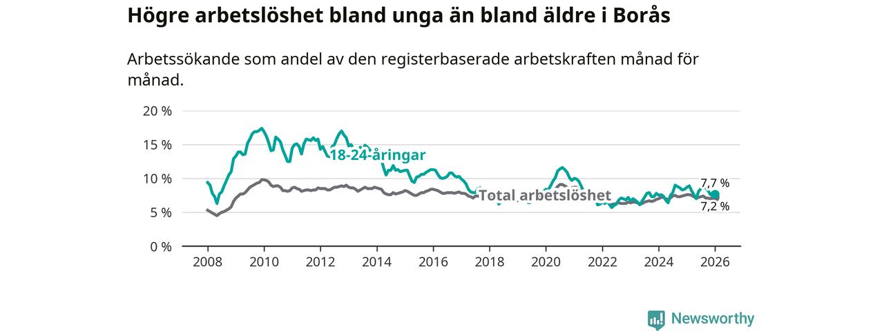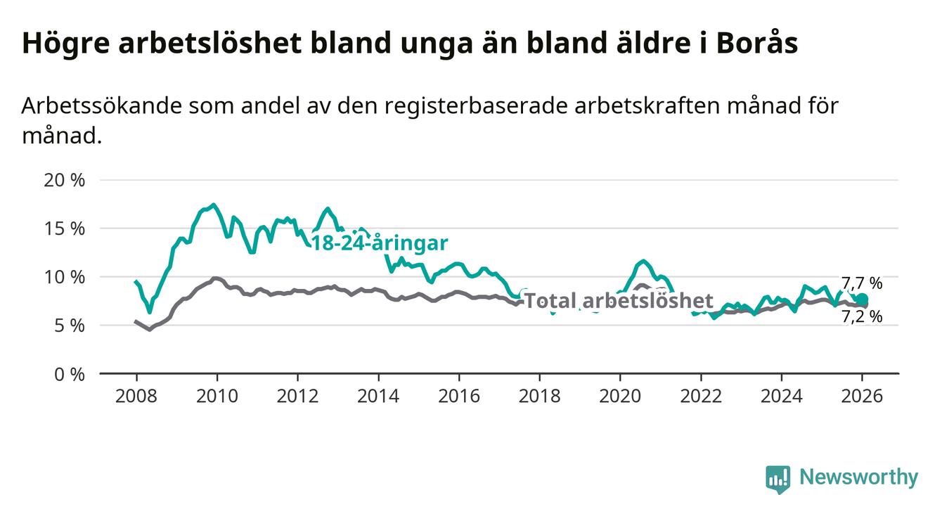Precis som den totala arbetslösheten ligger ungdomsarbetslösheten i Borås högre än i Västra Götaland som helhet. Skillnaden mellan kommunen och länet är 0,8 procentenheter.
