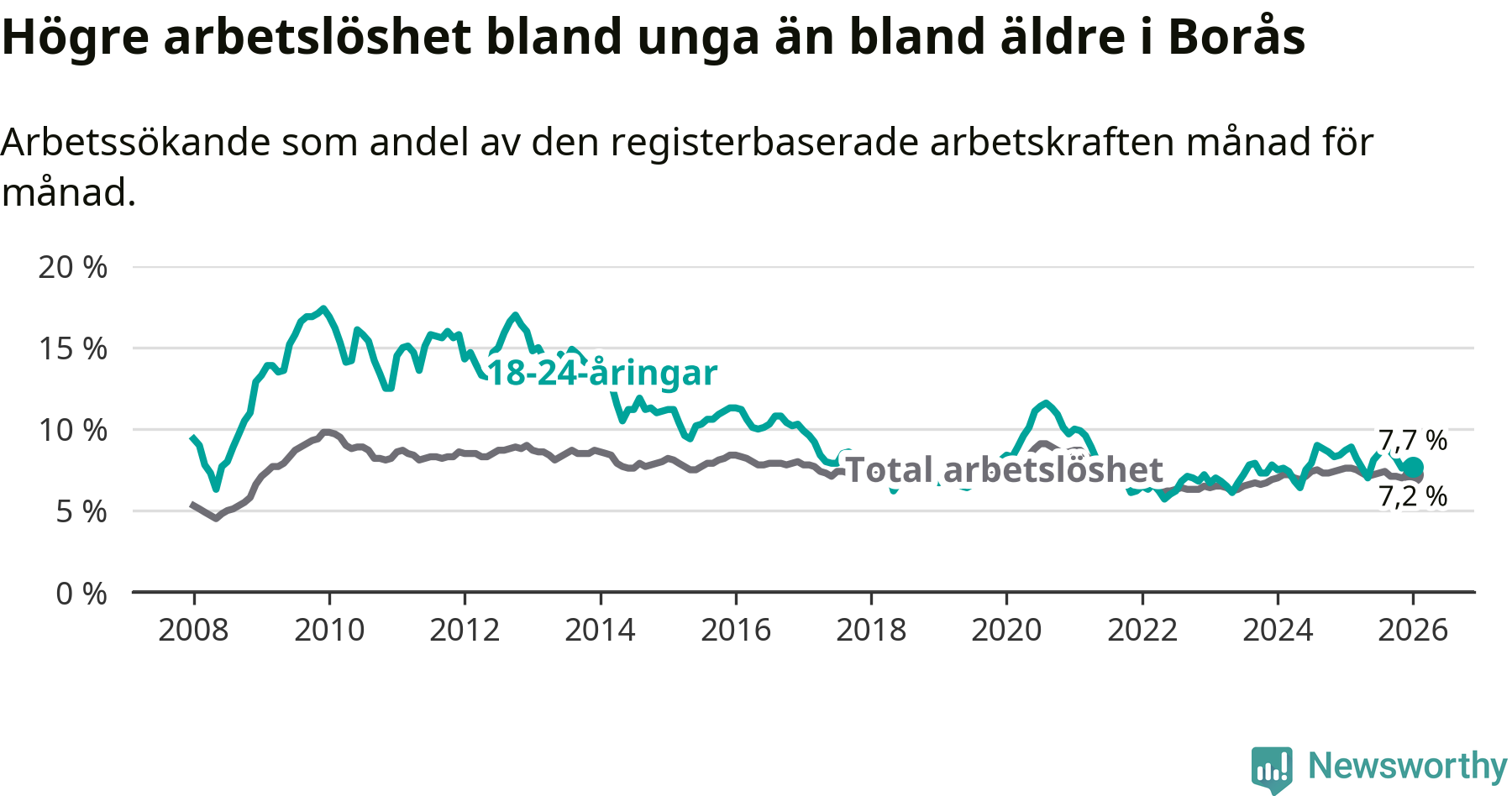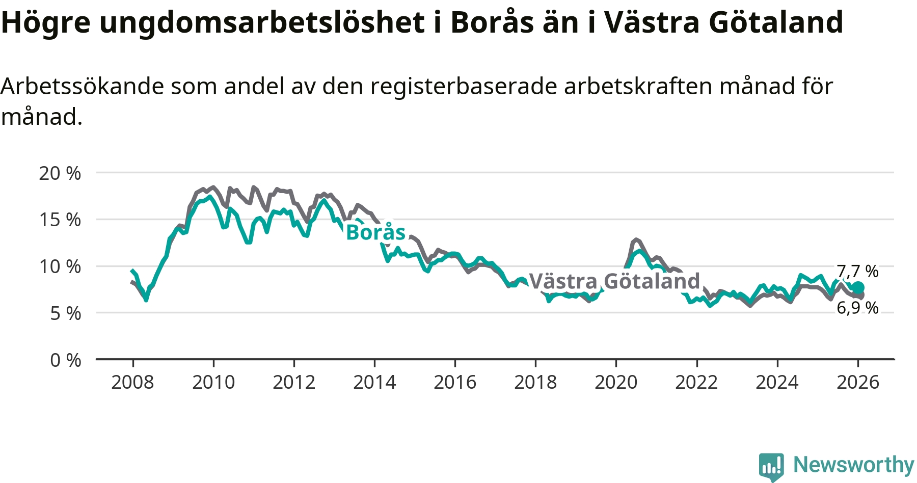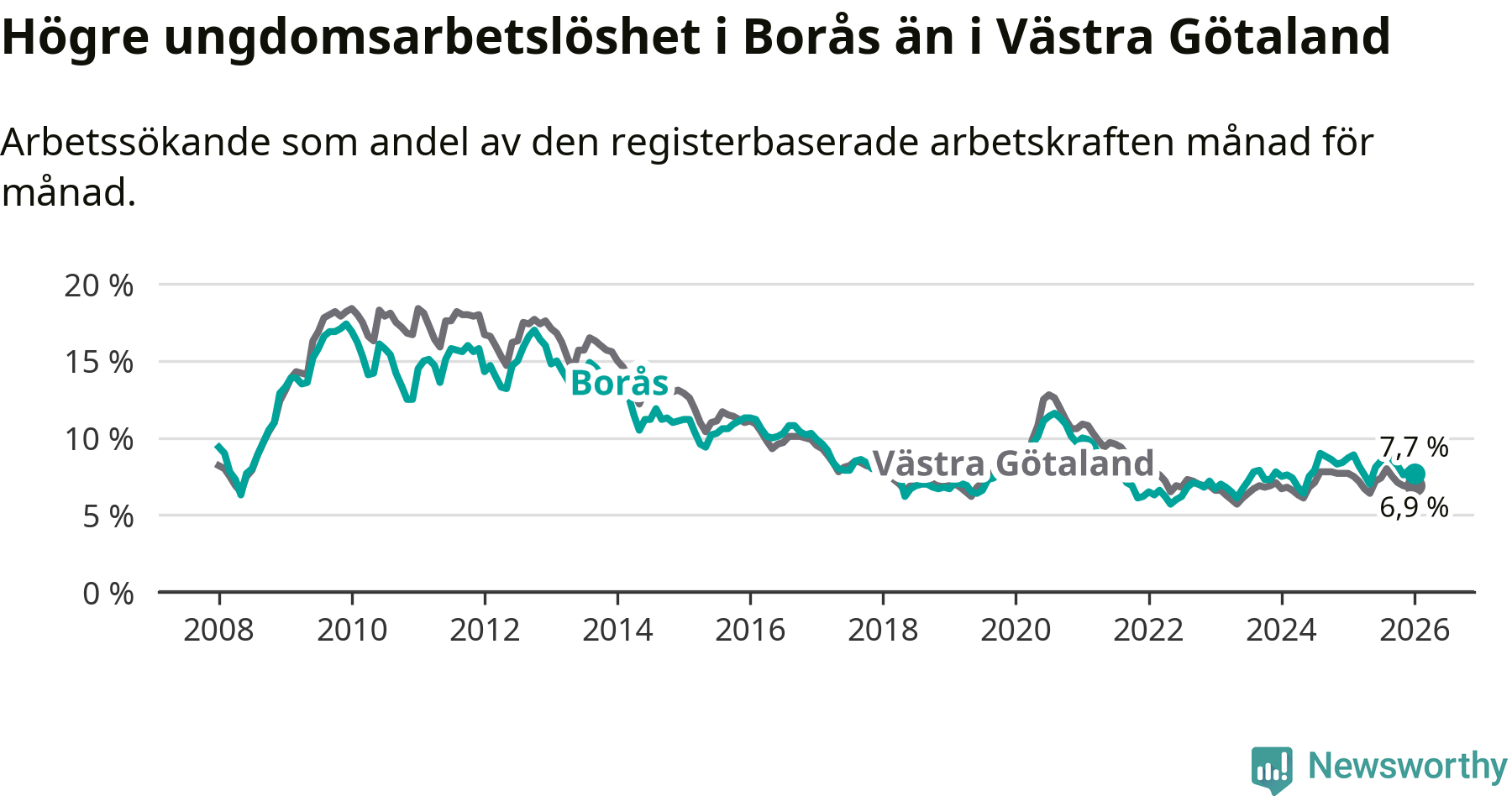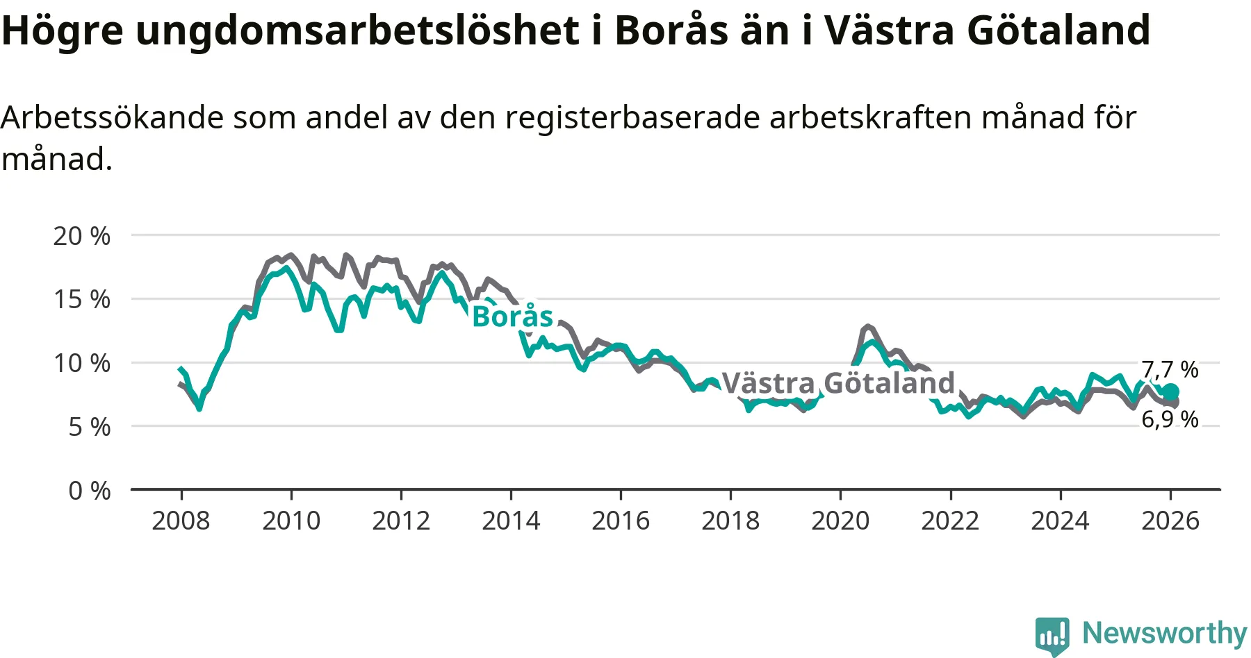 Precis som den totala arbetslösheten ligger ungdomsarbetslösheten i Borås högre än i Västra Götaland som helhet. Skillnaden mellan kommunen och länet är 0,8 procentenheter.