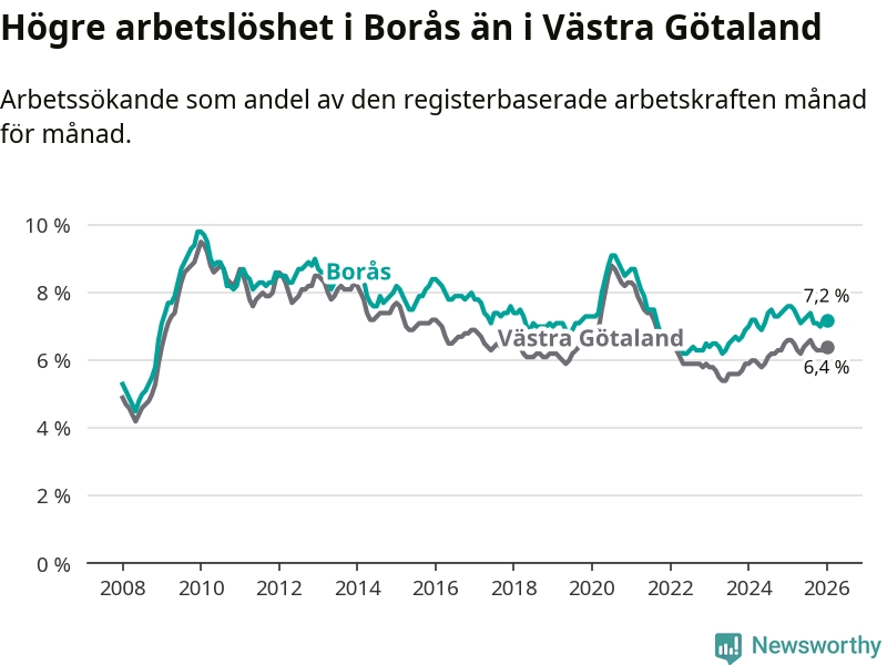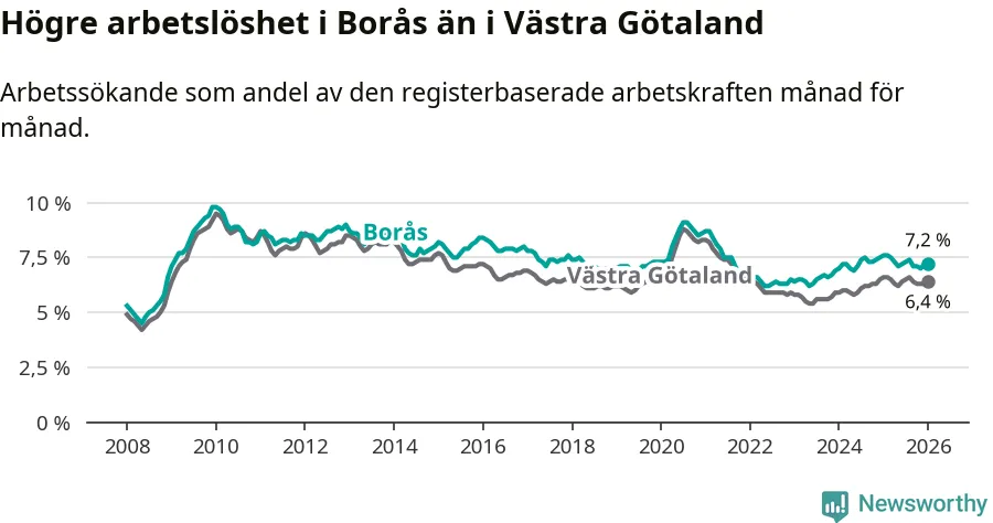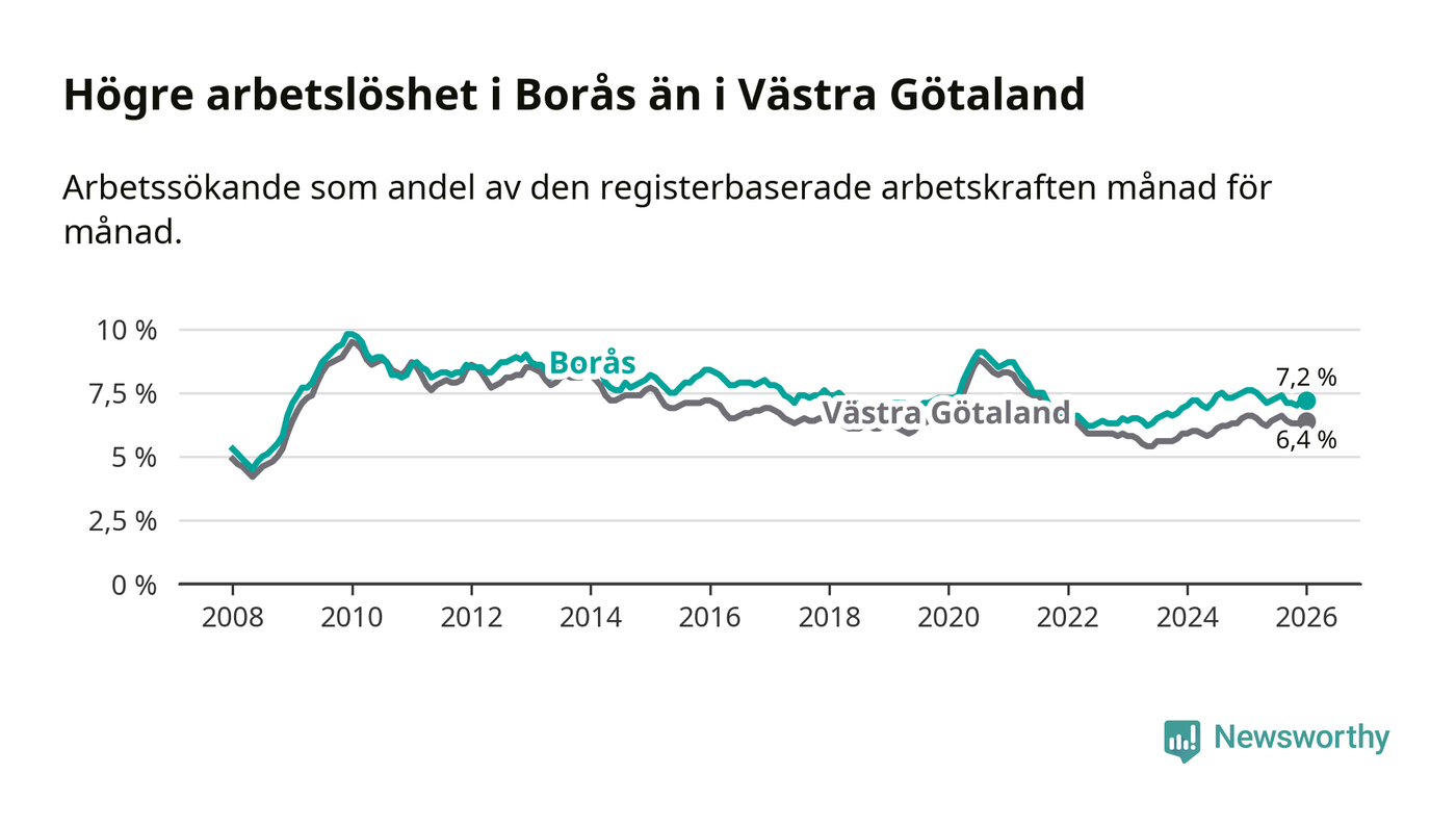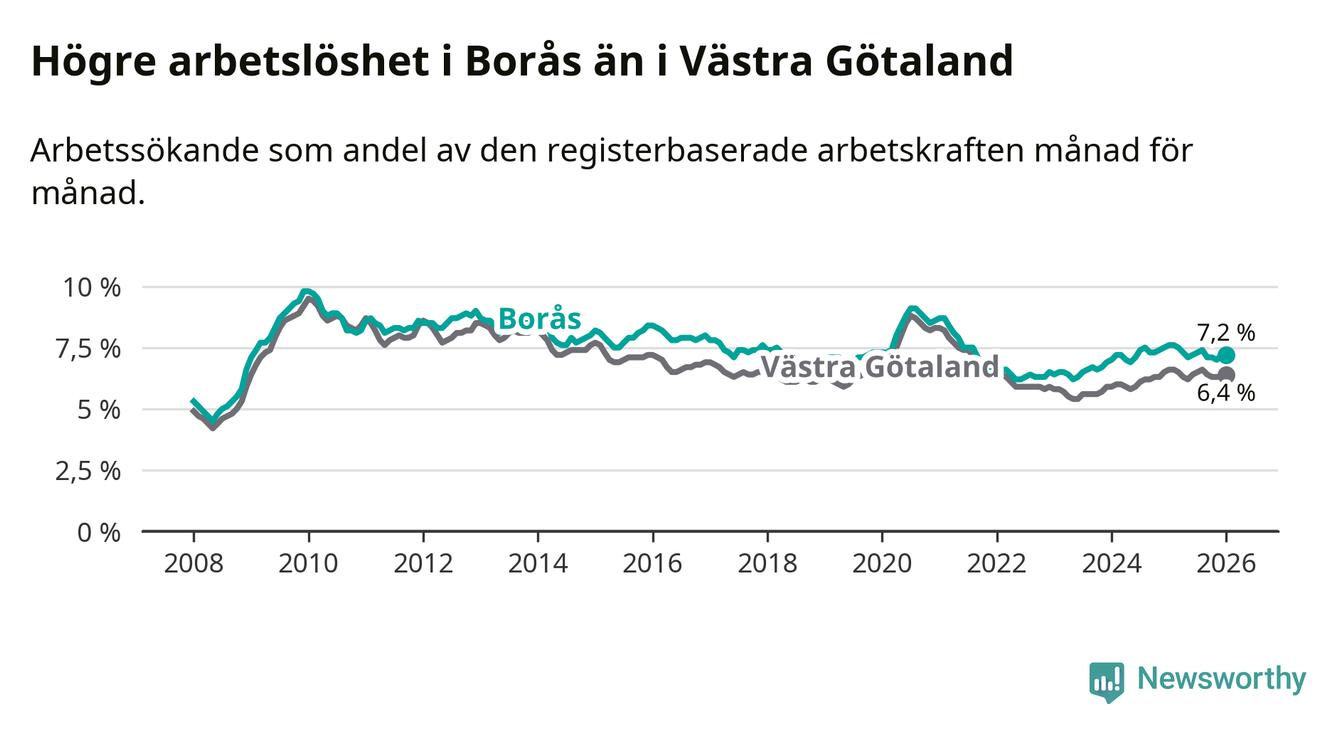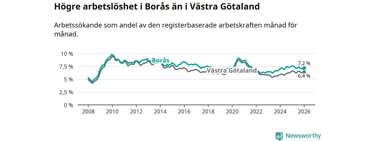 Under januari månad rapporterade Borås kommun en total arbetslöshet på 7,2 procent. Det är en minskning jämfört med samma tidpunkt i fjol (−0,4 procentenheter). Även i Västra Götalands län sjunker arbetslösheten .