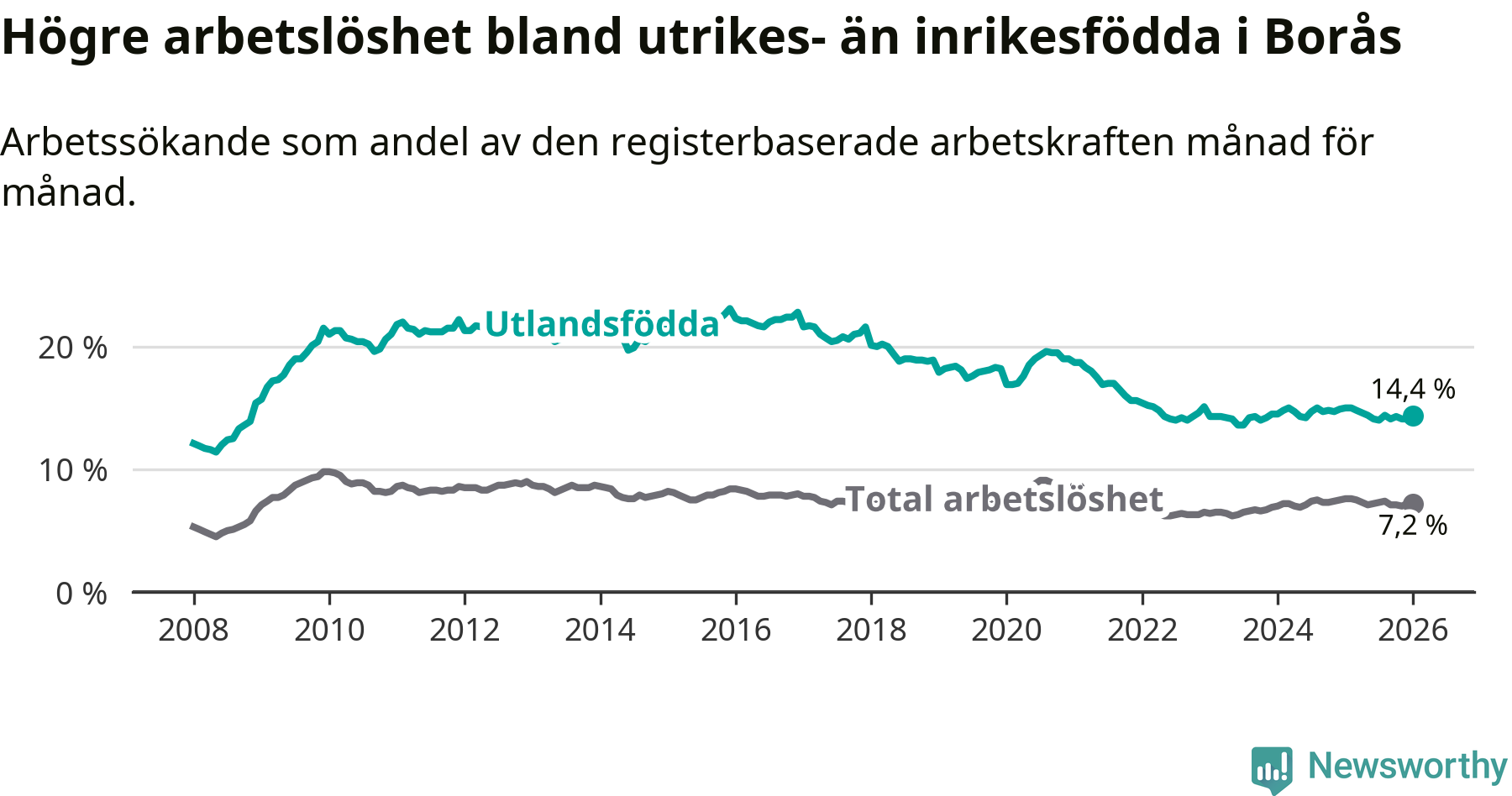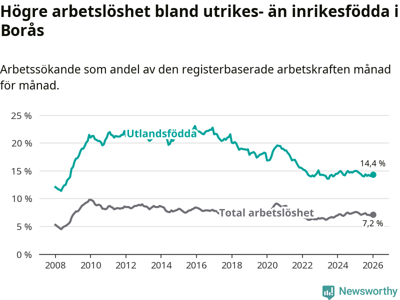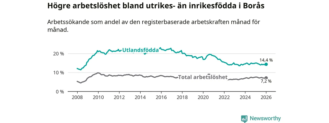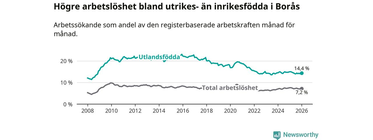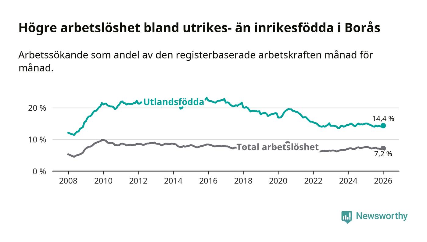 Arbetslösheten bland utlandsfödda var 14,4 procent i Borås under januari månad, motsvarande 2 416 av 16 778 personer. Det är 0,6 procentenheter färre än vid samma tidpunkt i fjol (−90 om man räknar personer). Därmed är de utlandsföddas arbetslöshet lägre än vid samma tidpunkt i fjol för åttonde månaden i följd.