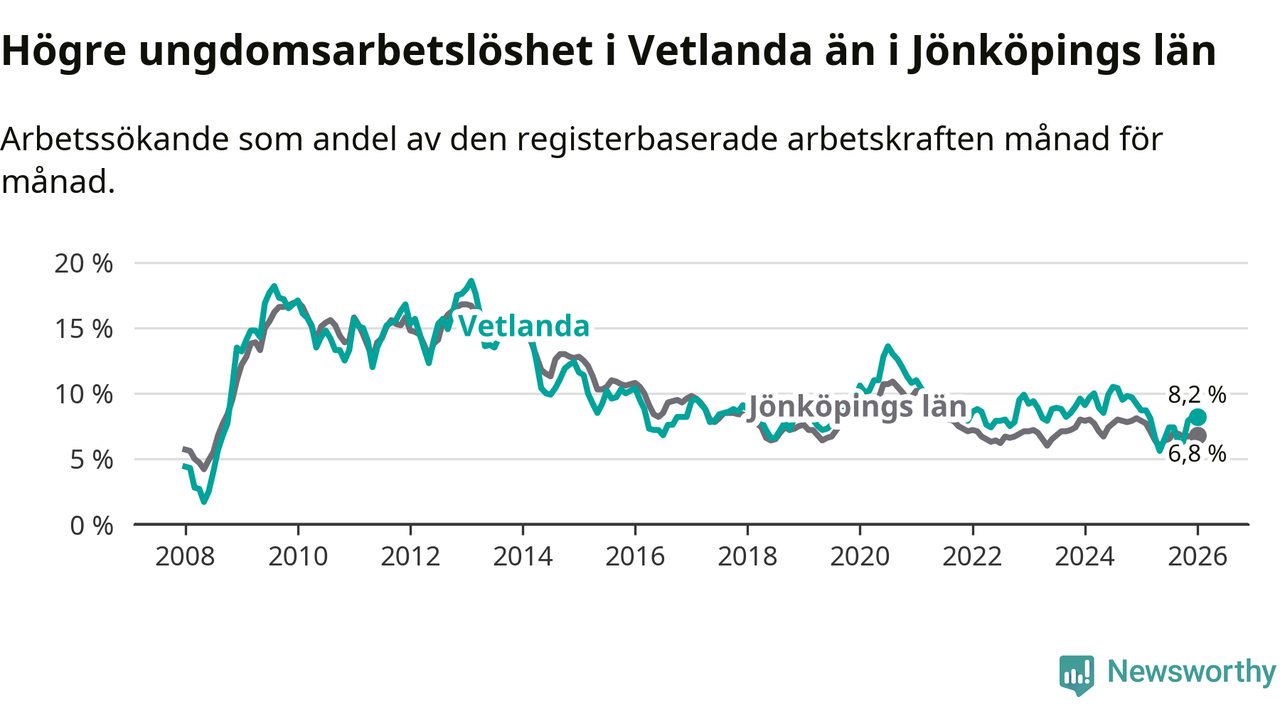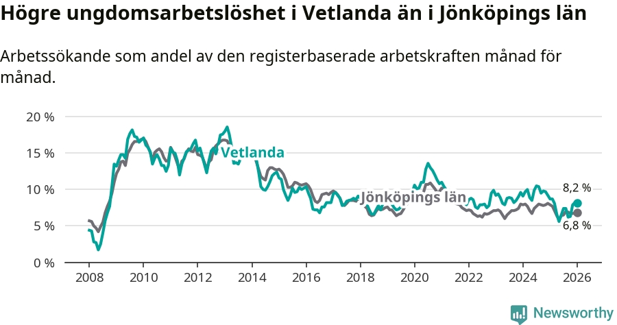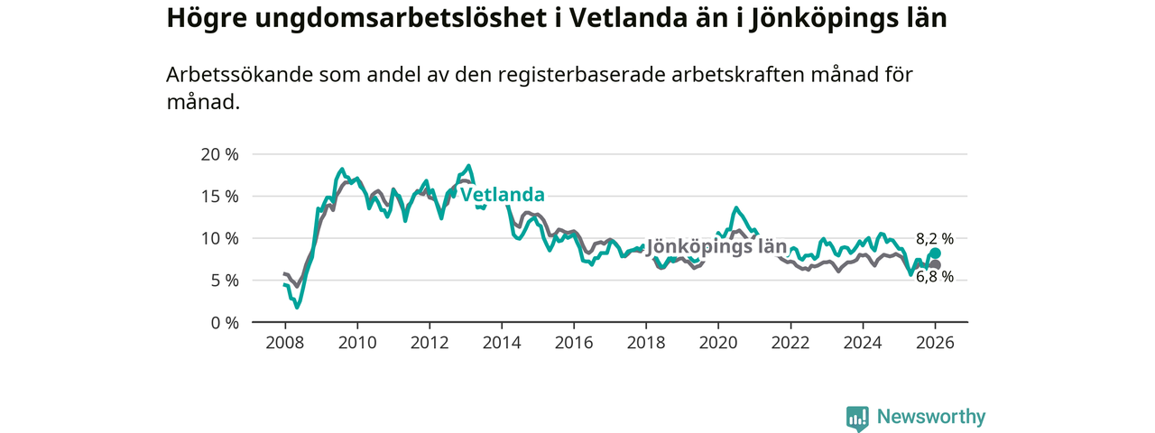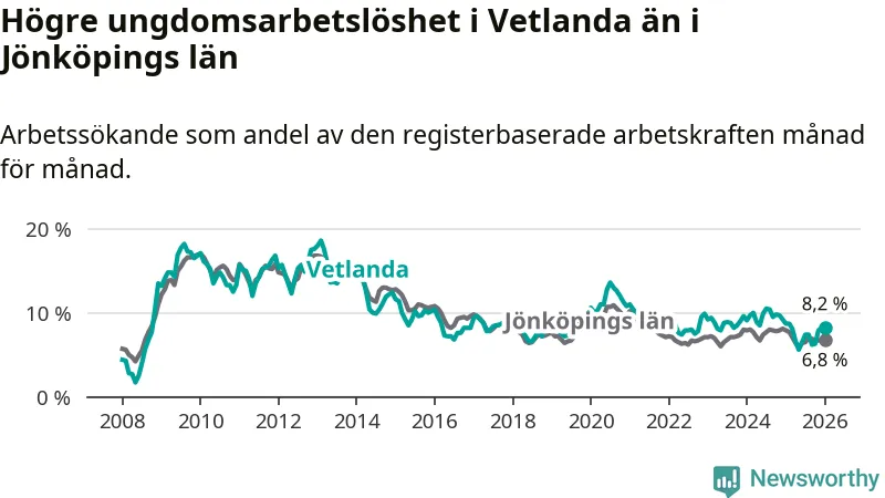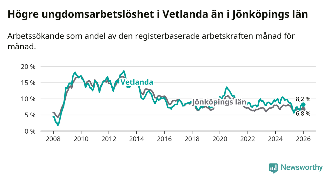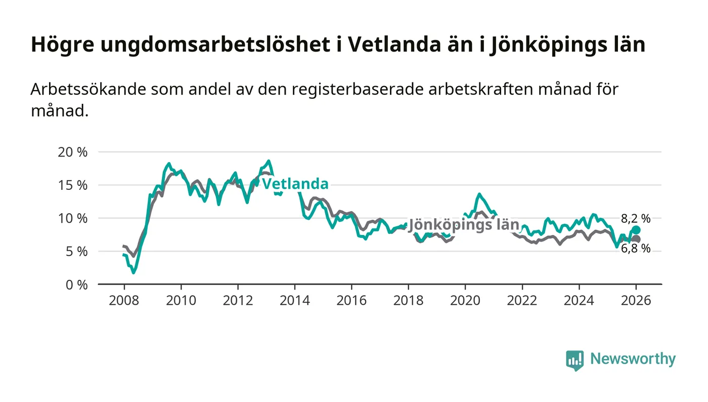 Precis som den totala arbetslösheten ligger ungdomsarbetslösheten i Vetlanda högre än i Jönköpings län som helhet. Skillnaden mellan kommunen och länet är 1,4 procentenheter.