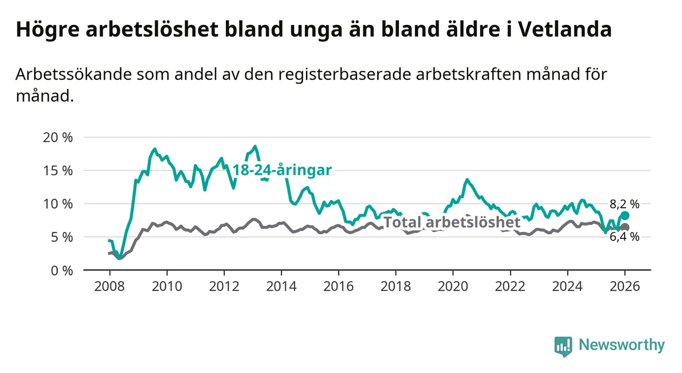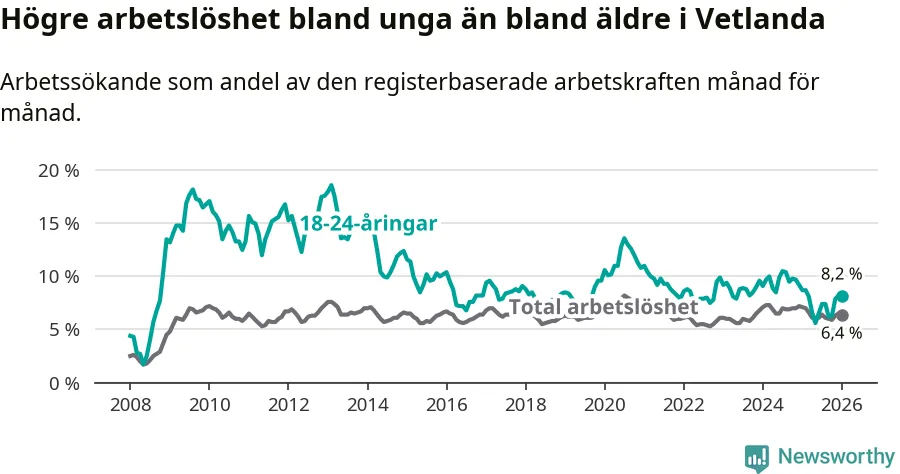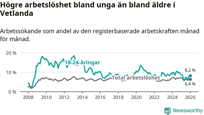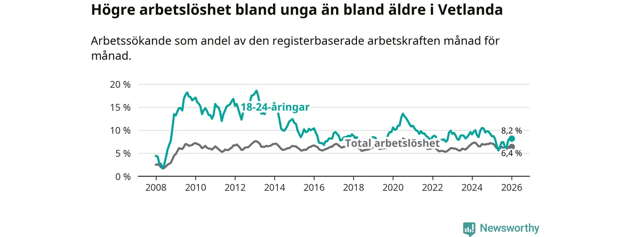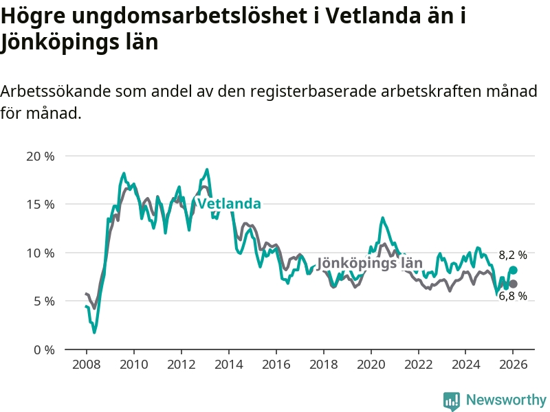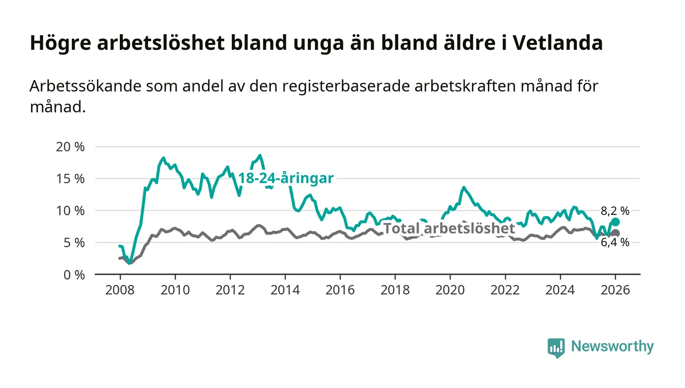 Precis som den totala arbetslösheten ligger ungdomsarbetslösheten i Vetlanda högre än i Jönköpings län som helhet. Skillnaden mellan kommunen och länet är 1,4 procentenheter.