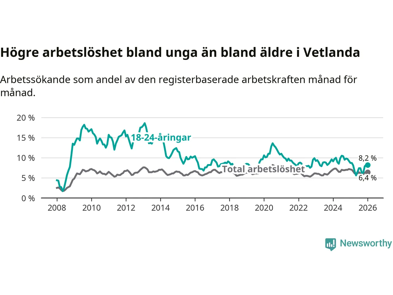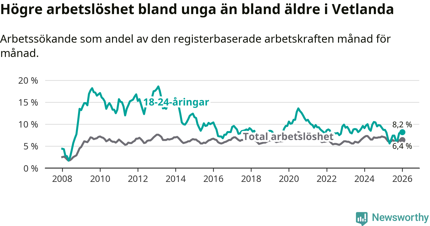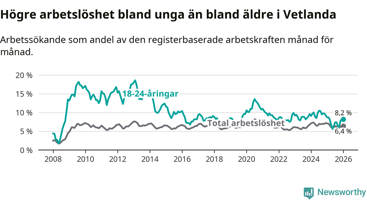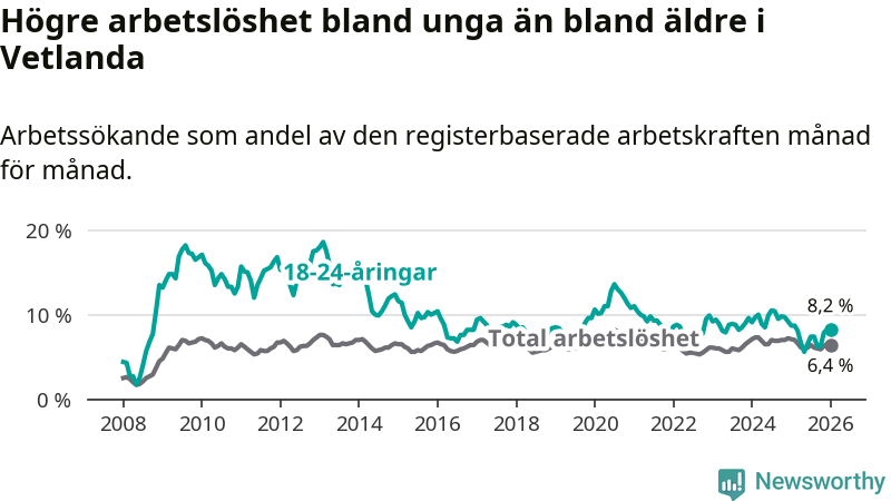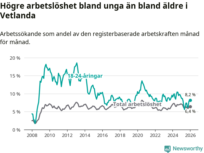 Precis som den totala arbetslösheten ligger ungdomsarbetslösheten i Vetlanda högre än i Jönköpings län som helhet. Skillnaden mellan kommunen och länet är 1,4 procentenheter.