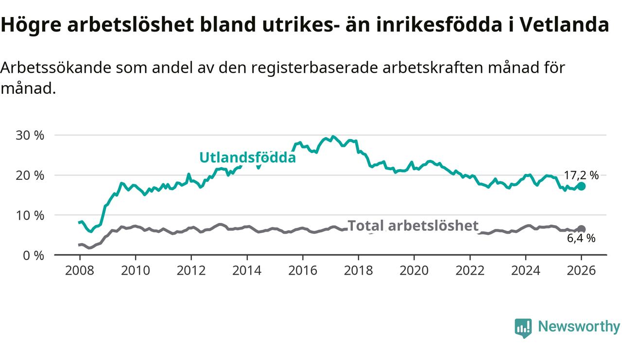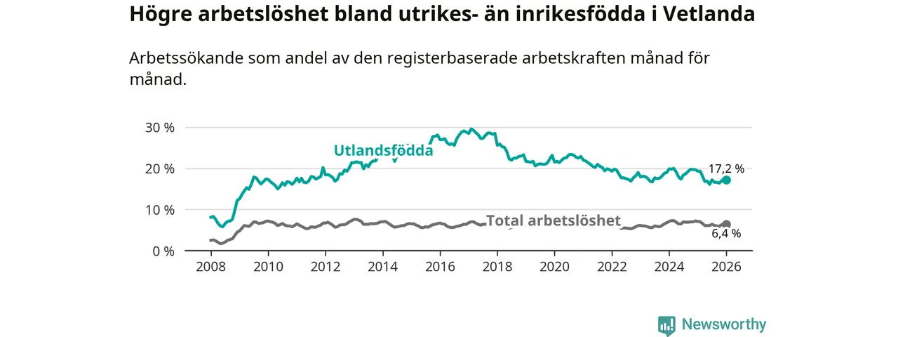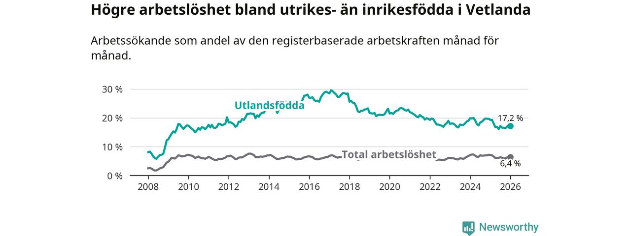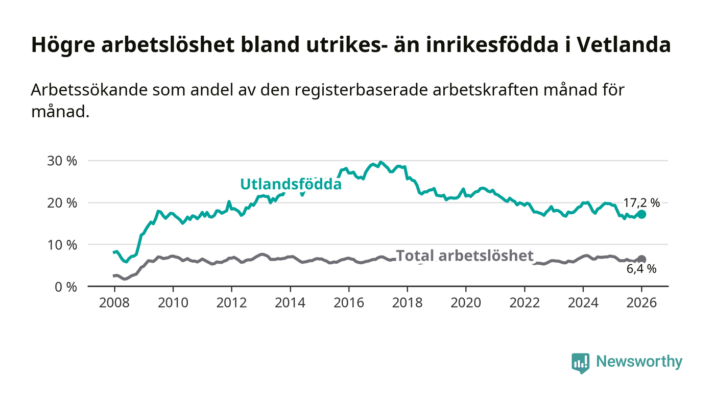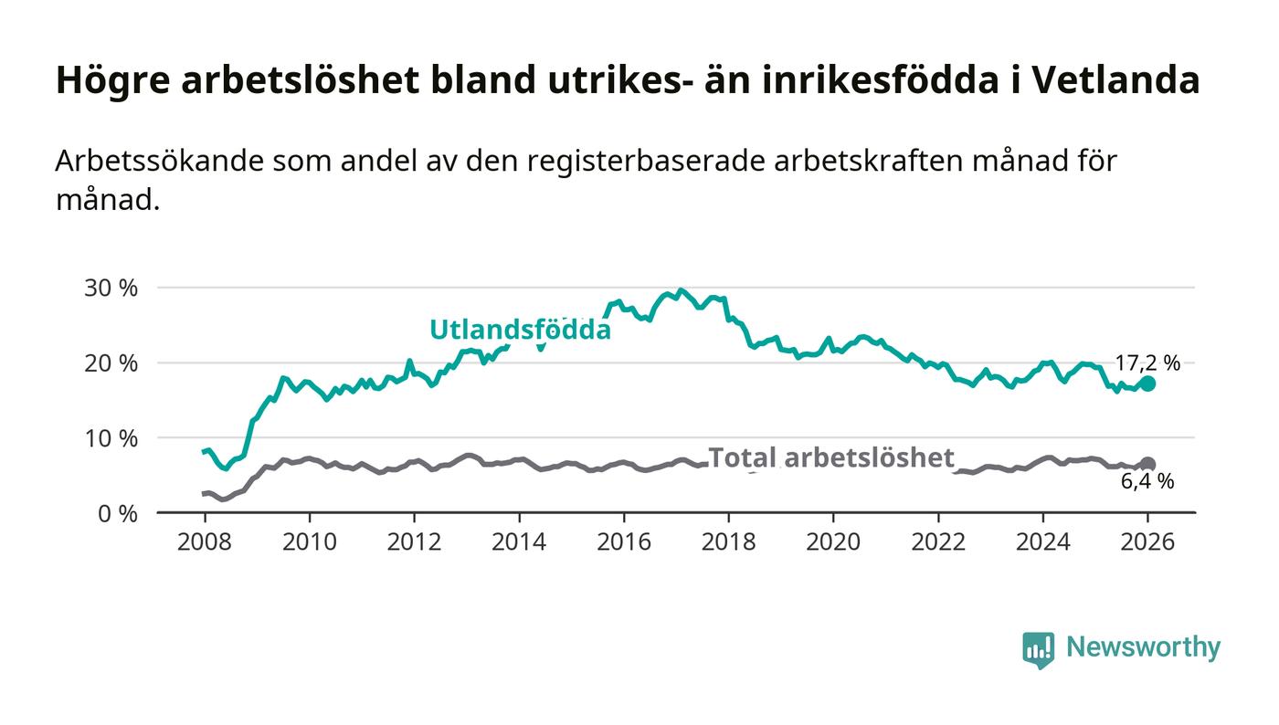 Arbetslösheten bland utlandsfödda var 17,2 procent i Vetlanda under januari månad, motsvarande 464 av 2 698 personer. Det är 2,1 procentenheter färre än vid samma tidpunkt i fjol (−51 om man räknar personer). Därmed är de utlandsföddas arbetslöshet lägre än vid samma tidpunkt i fjol för 13:e månaden i följd. Sedan december 2024 har arbetslösheten bland utlandsfödda minskat från 19,7 till 17,2 procent.