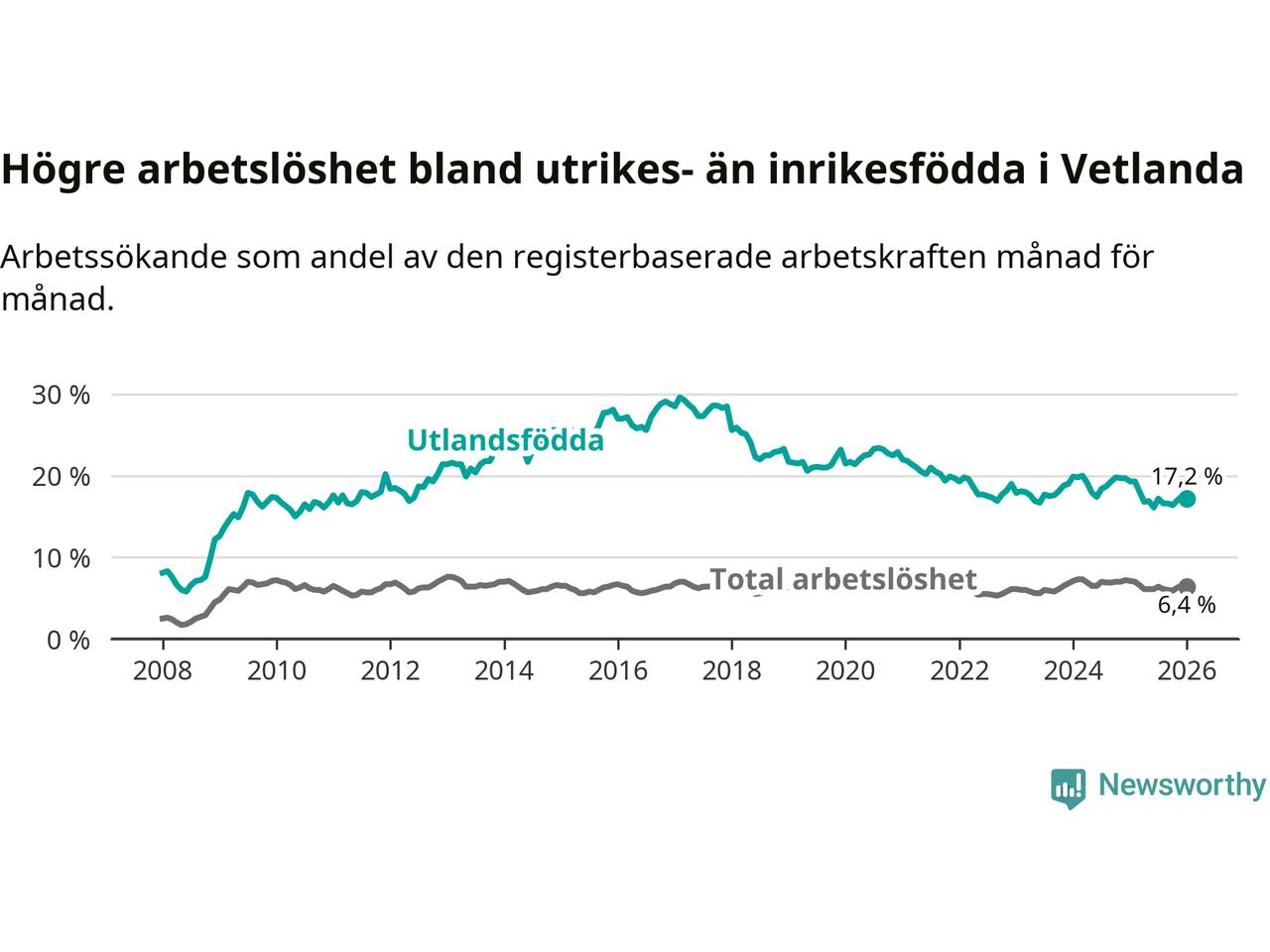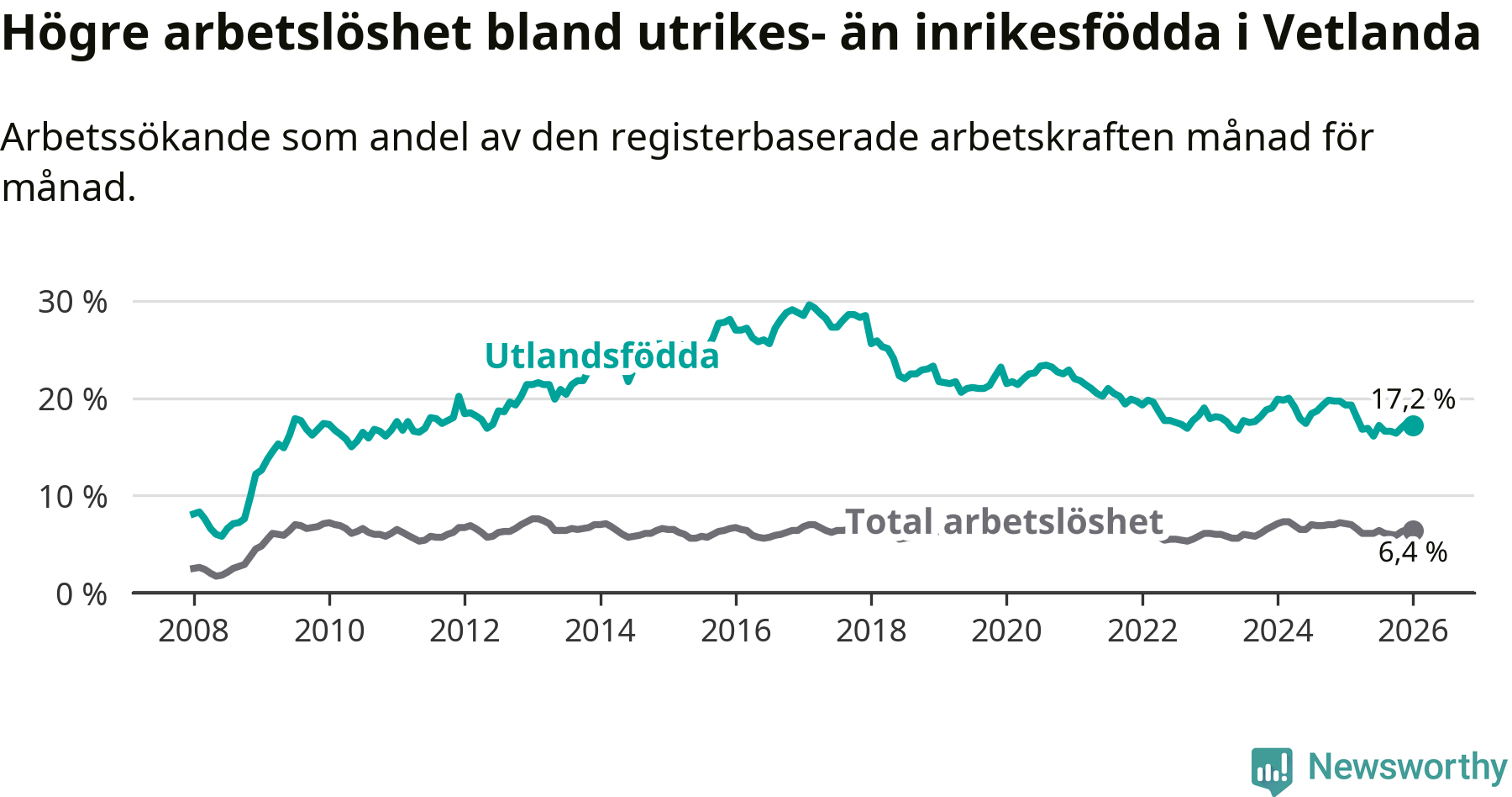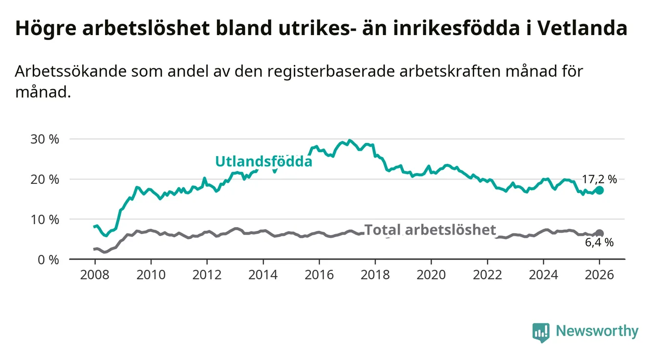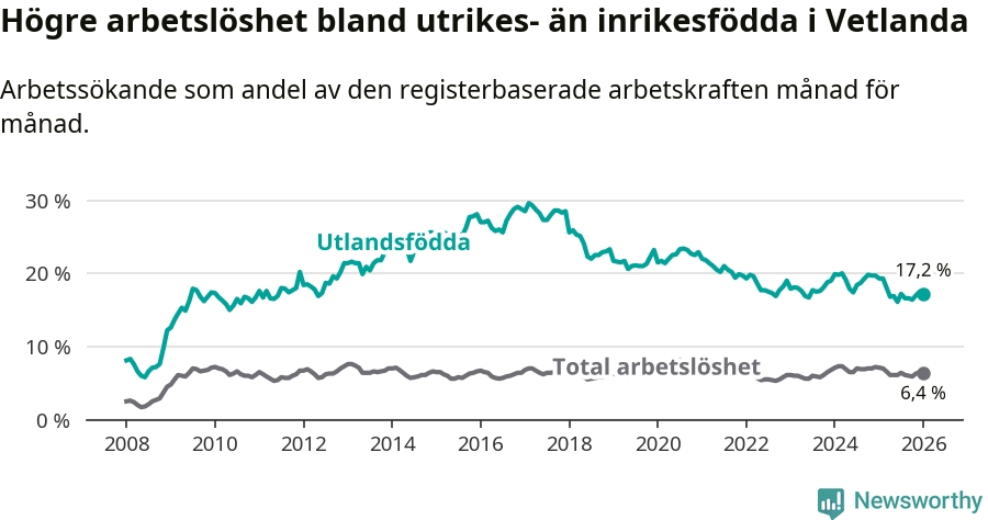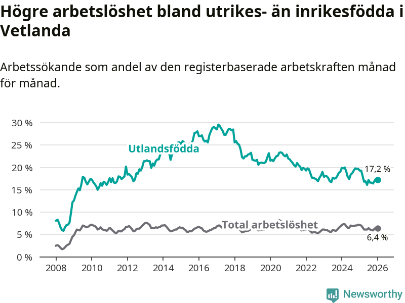 Arbetslösheten bland utlandsfödda var 17,2 procent i Vetlanda under januari månad, motsvarande 464 av 2 698 personer. Det är 2,1 procentenheter färre än vid samma tidpunkt i fjol (−51 om man räknar personer). Därmed är de utlandsföddas arbetslöshet lägre än vid samma tidpunkt i fjol för 13:e månaden i följd. Sedan december 2024 har arbetslösheten bland utlandsfödda minskat från 19,7 till 17,2 procent.