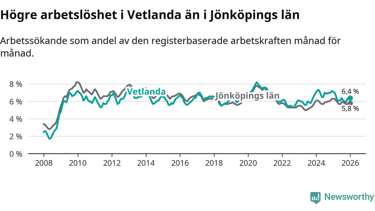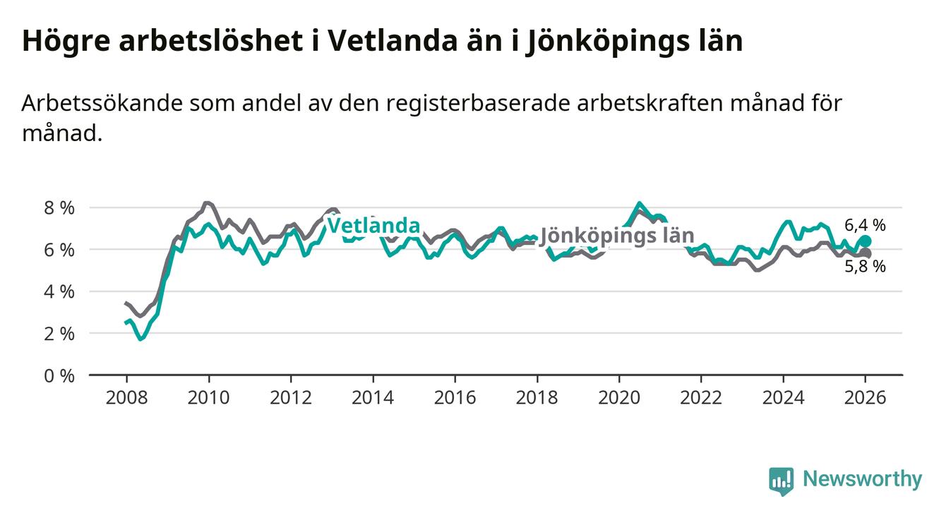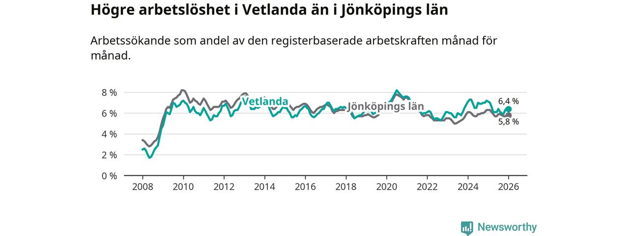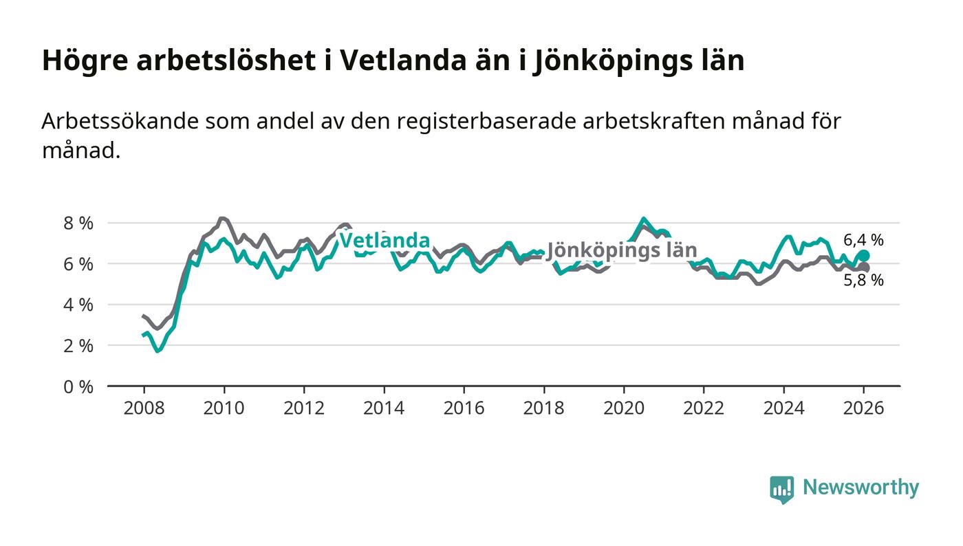 Under januari månad rapporterade Vetlanda kommun en total arbetslöshet på 6,4 procent. Det är en minskning jämfört med samma tidpunkt i fjol (−0,7 procentenheter). Även i Jönköpings län sjunker arbetslösheten .