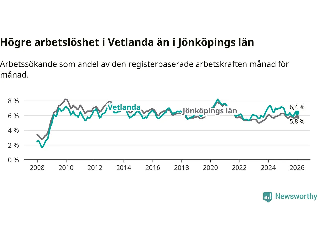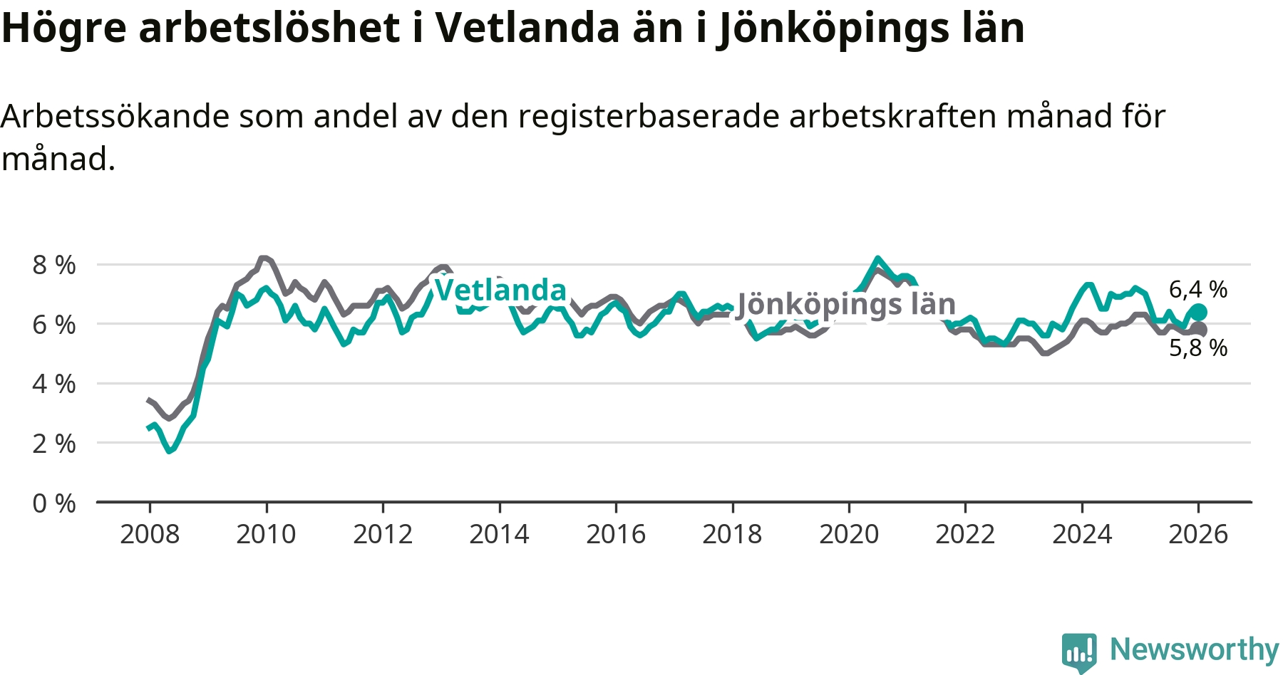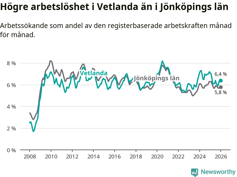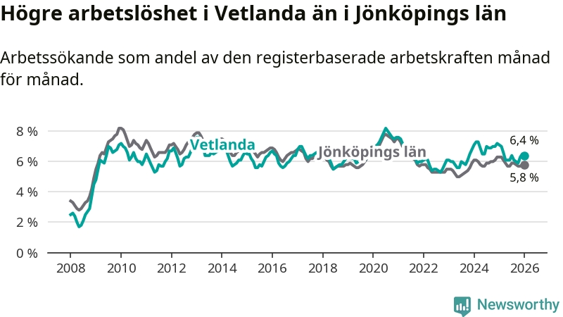 Under januari månad rapporterade Vetlanda kommun en total arbetslöshet på 6,4 procent. Det är en minskning jämfört med samma tidpunkt i fjol (−0,7 procentenheter). Även i Jönköpings län sjunker arbetslösheten .