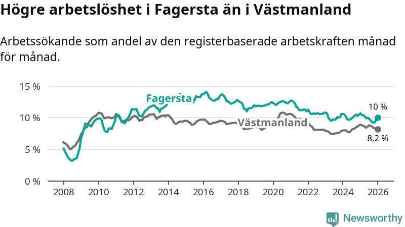 Även om arbetslösheten i Fagersta alltså minskar, så ligger den fortfarande över snittet i hela Västmanlands län (10,0 procent i kommunen, jämfört med 8,2 procent i hela länet). Fagersta har därmed även den högsta arbetslöshetsnivån i länet. Surahammar har den lägsta (6,2 procent). För att Fagersta skulle komma ner i samma arbetslöshetsnivå som Surahammar skulle 226 personer behöva sysselsättas.