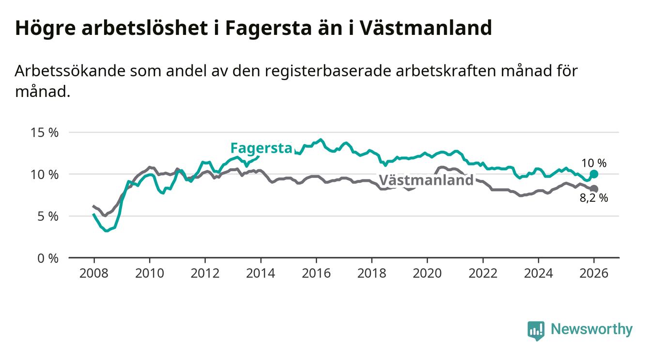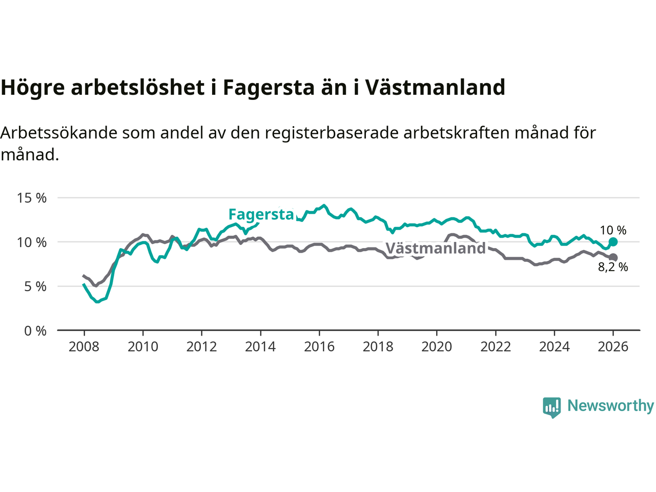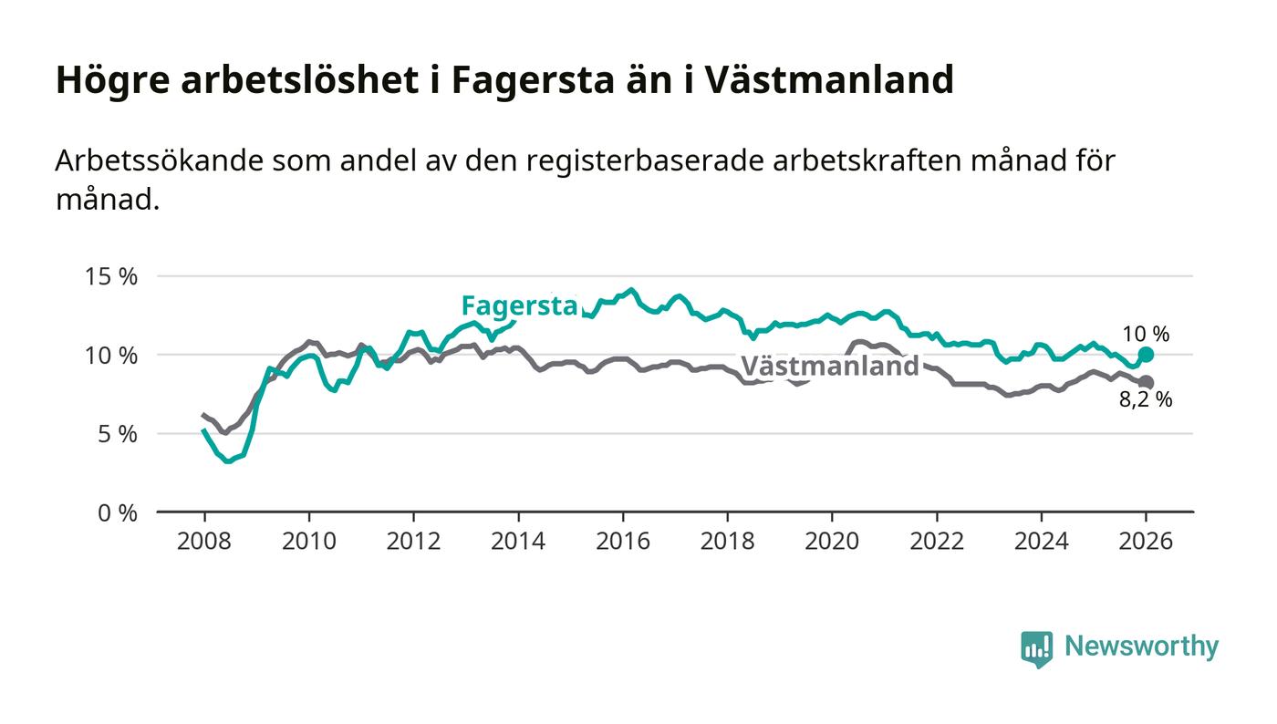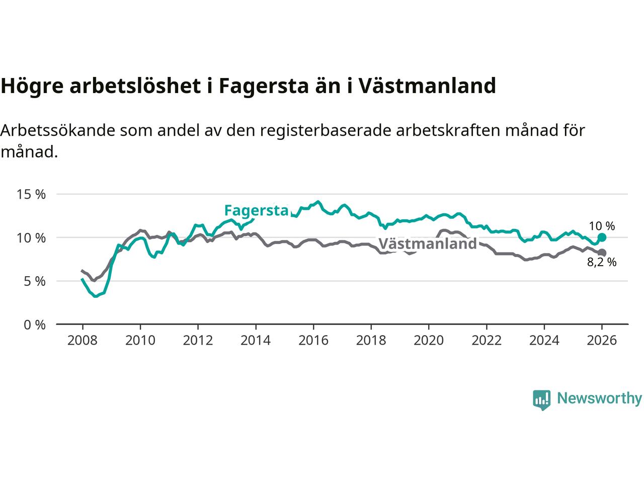Under januari månad rapporterade Fagersta kommun en total arbetslöshet på 10,0 procent. Det är en minskning jämfört med samma tidpunkt i fjol (−0,7 procentenheter). Även i Västmanlands län sjunker arbetslösheten .
