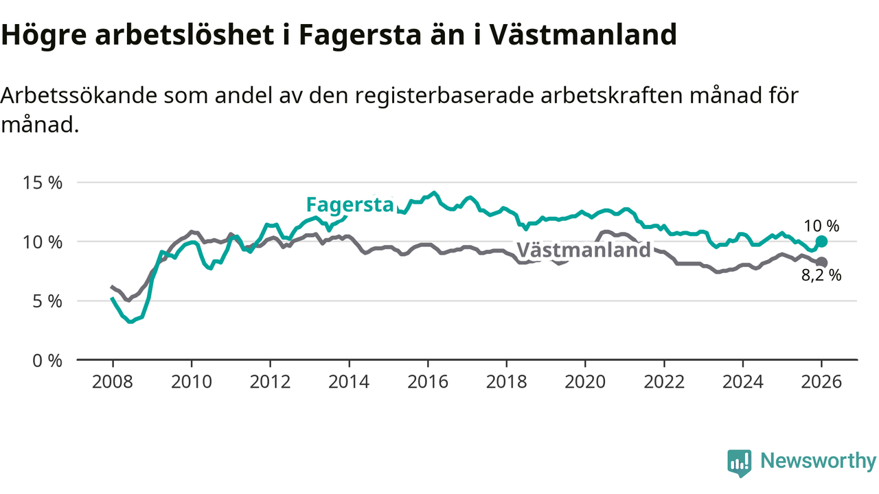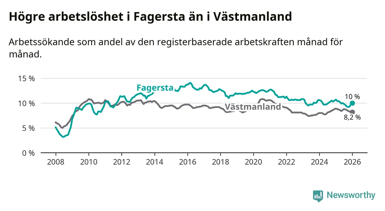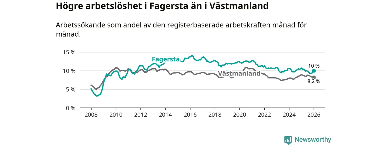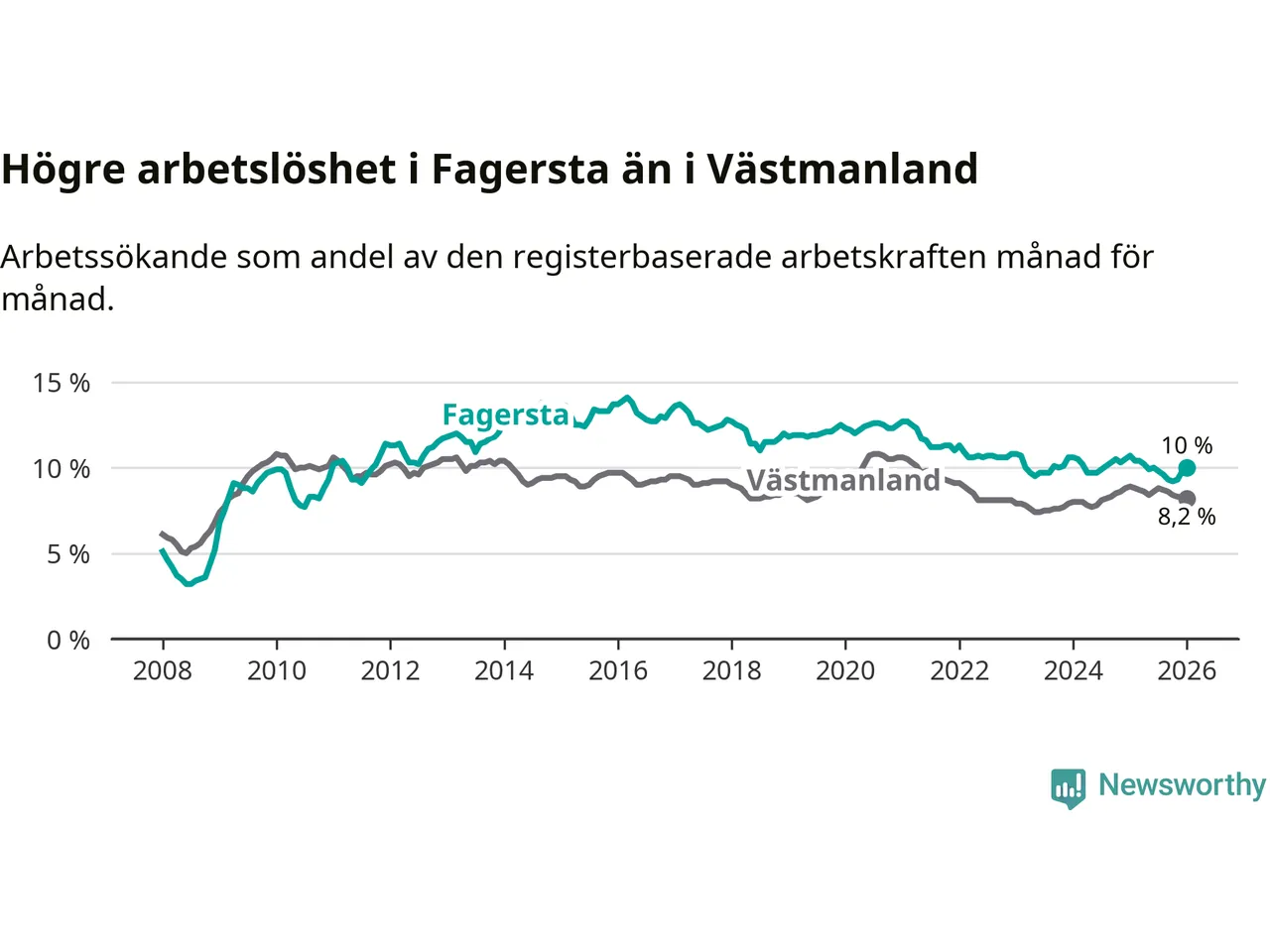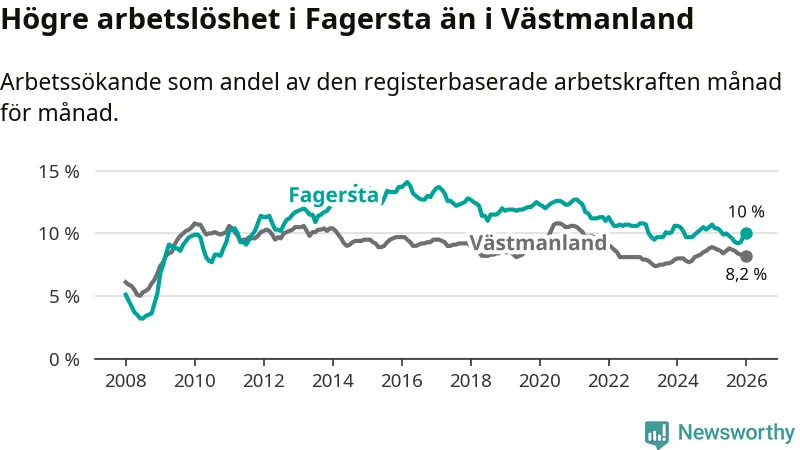 Under januari månad rapporterade Fagersta kommun en total arbetslöshet på 10,0 procent. Det är en minskning jämfört med samma tidpunkt i fjol (−0,7 procentenheter). Även i Västmanlands län sjunker arbetslösheten .