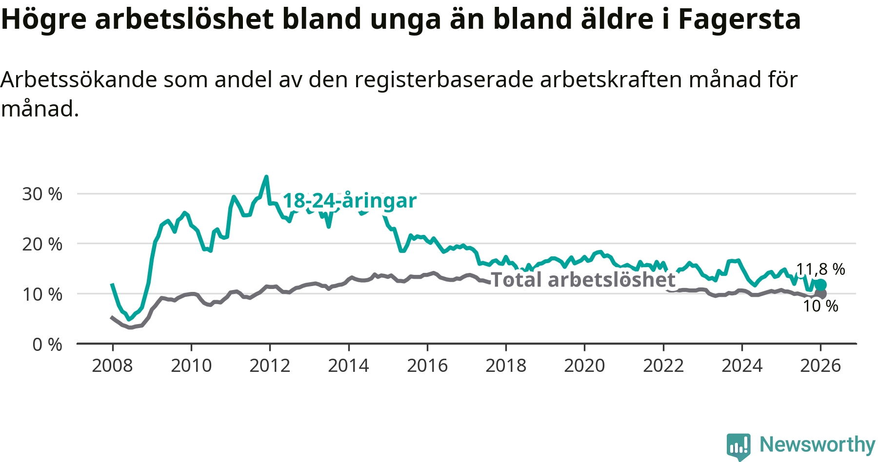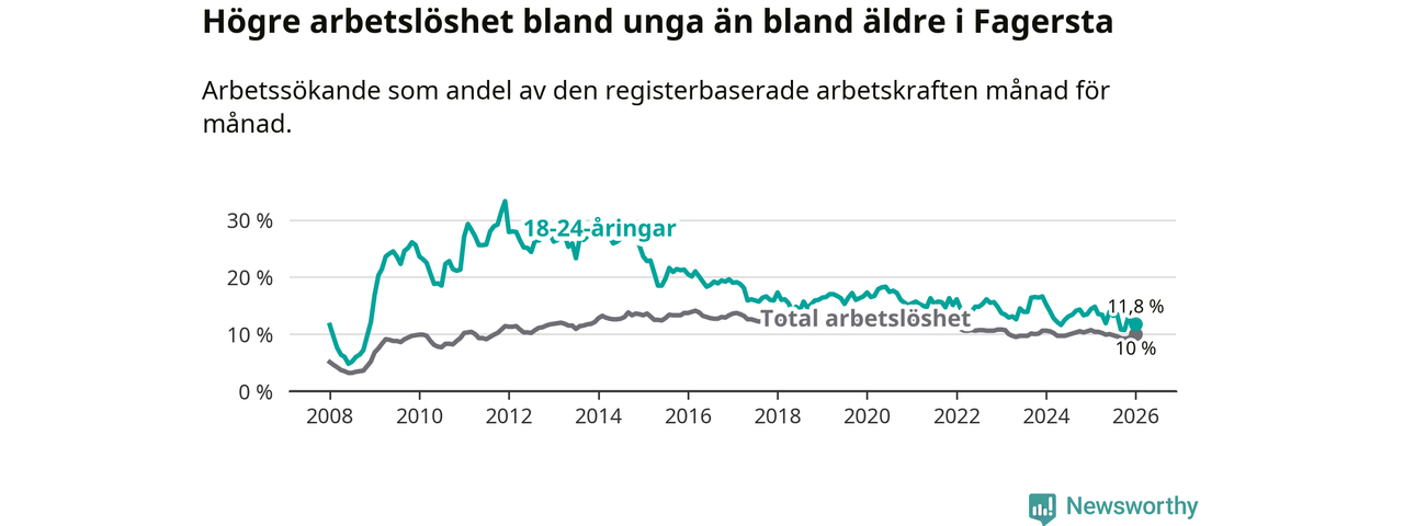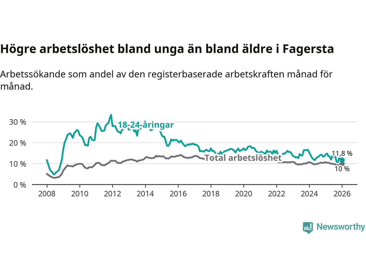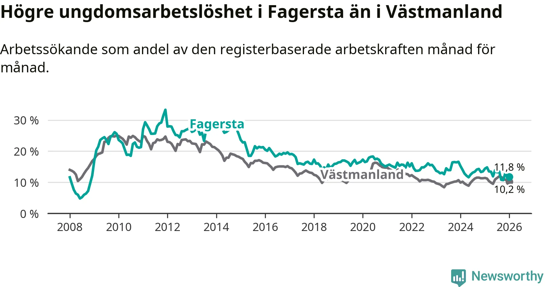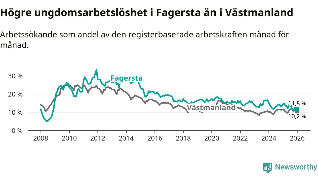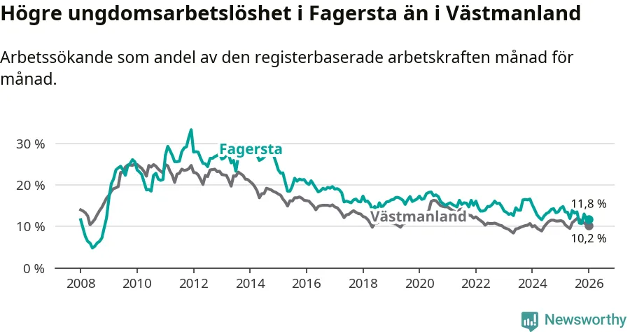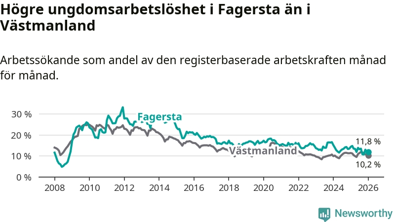 Precis som den totala arbetslösheten ligger ungdomsarbetslösheten i Fagersta högre än i Västmanland som helhet. Skillnaden mellan kommunen och länet är 1,6 procentenheter.