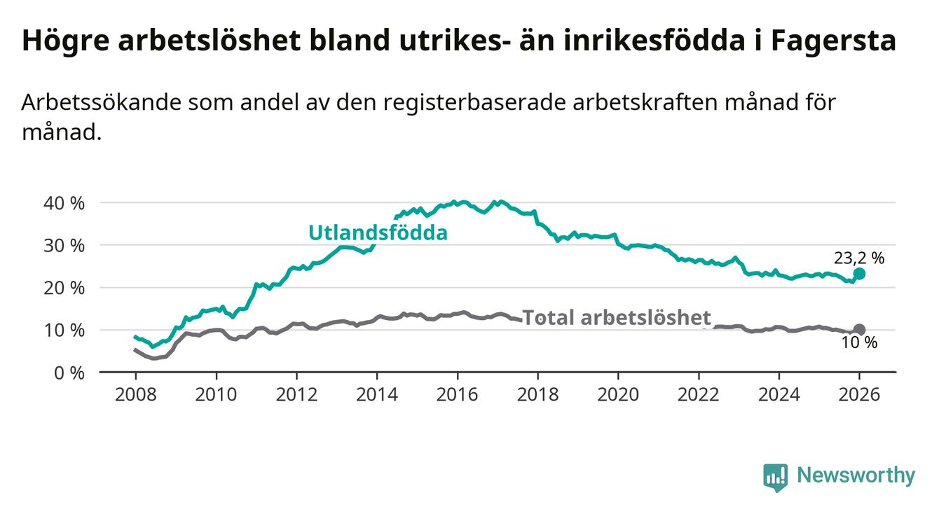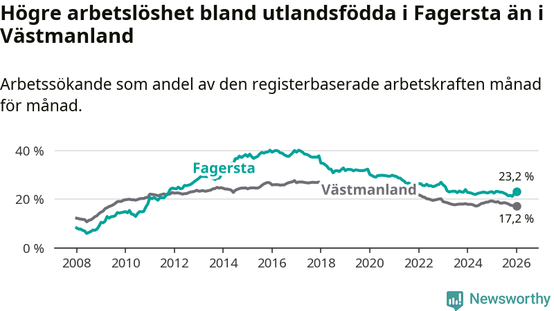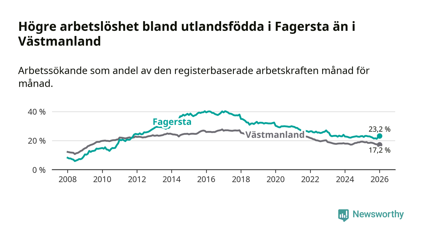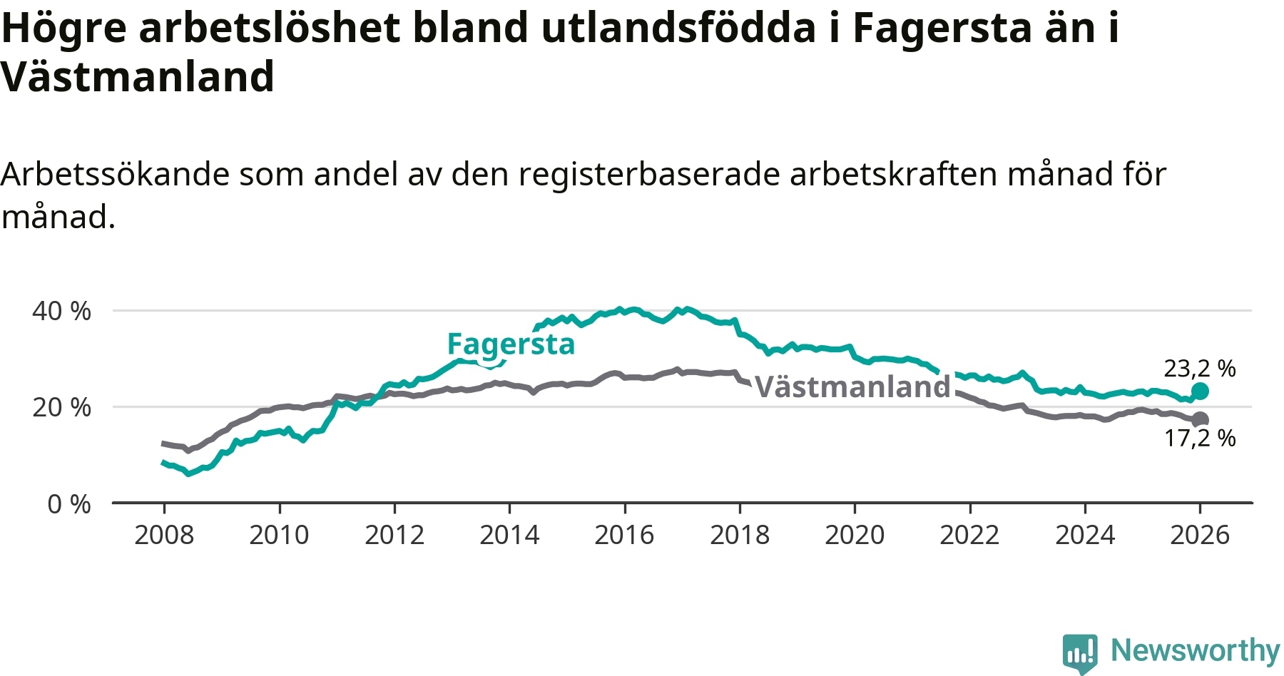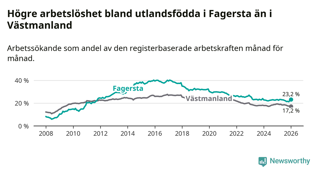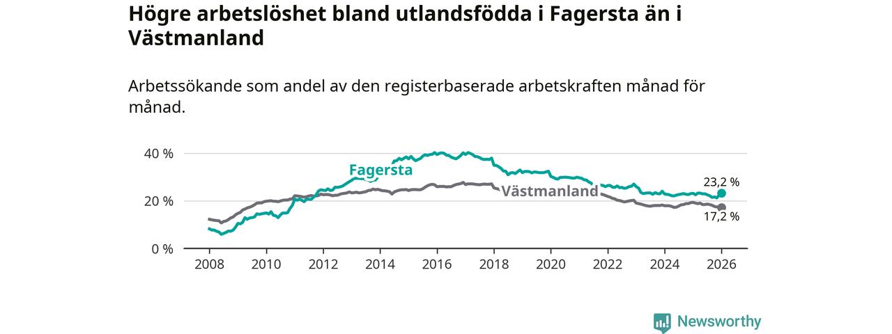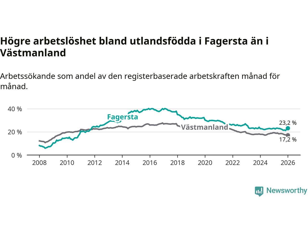 Arbetslösheten bland utlandsfödda var 23,2 procent i Fagersta under januari månad, motsvarande 421 av 1 815 personer. Det är 0,1 procentenheter fler än vid samma tidpunkt i fjol (±0 om man räknar personer). Den senaste månadens uppgång innebär ett trendbrott. Under de sex föregående månaderna hade arbetslösheten bland utlandsfödda varit lägre än motsvarande tidpunkt året innan.