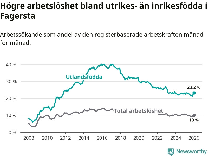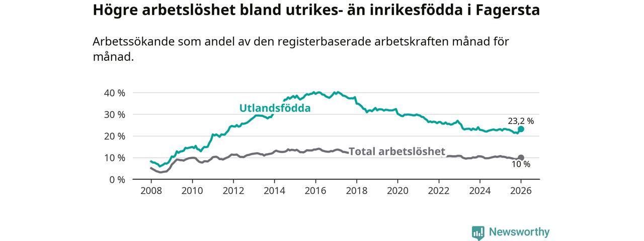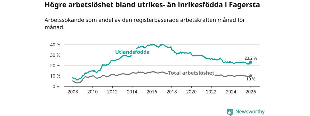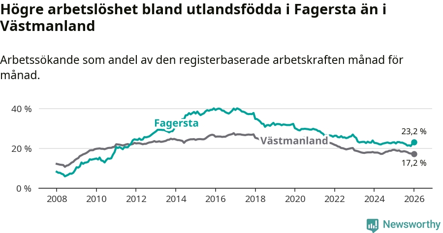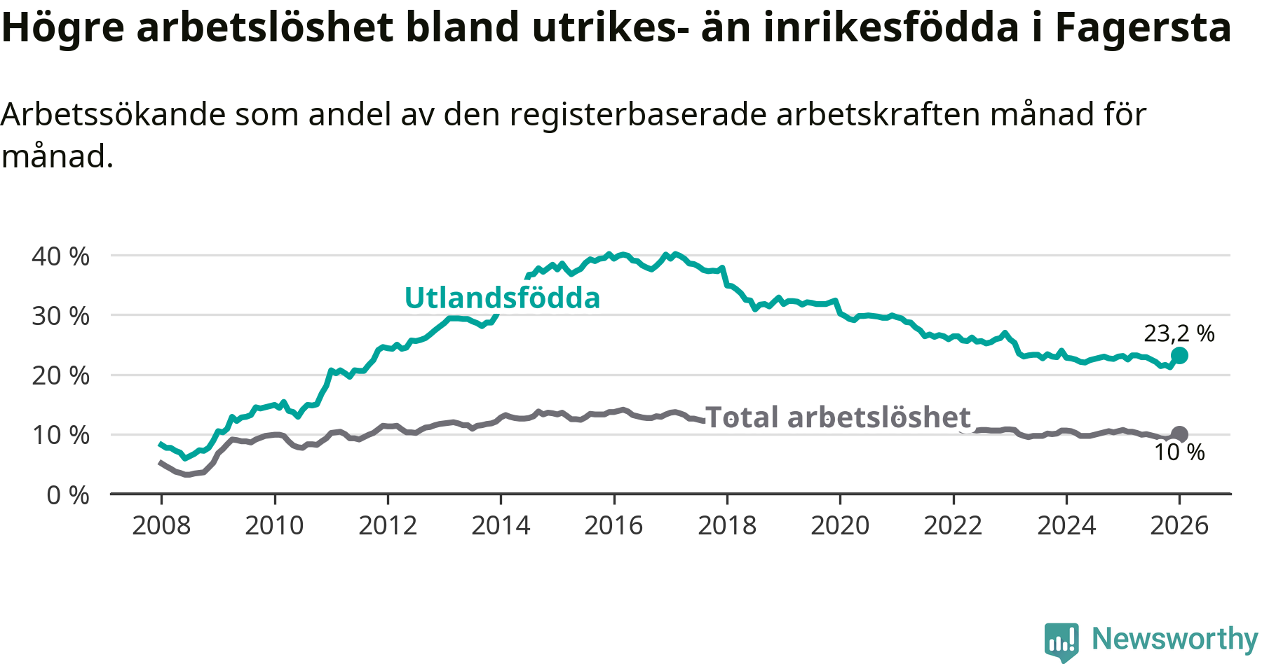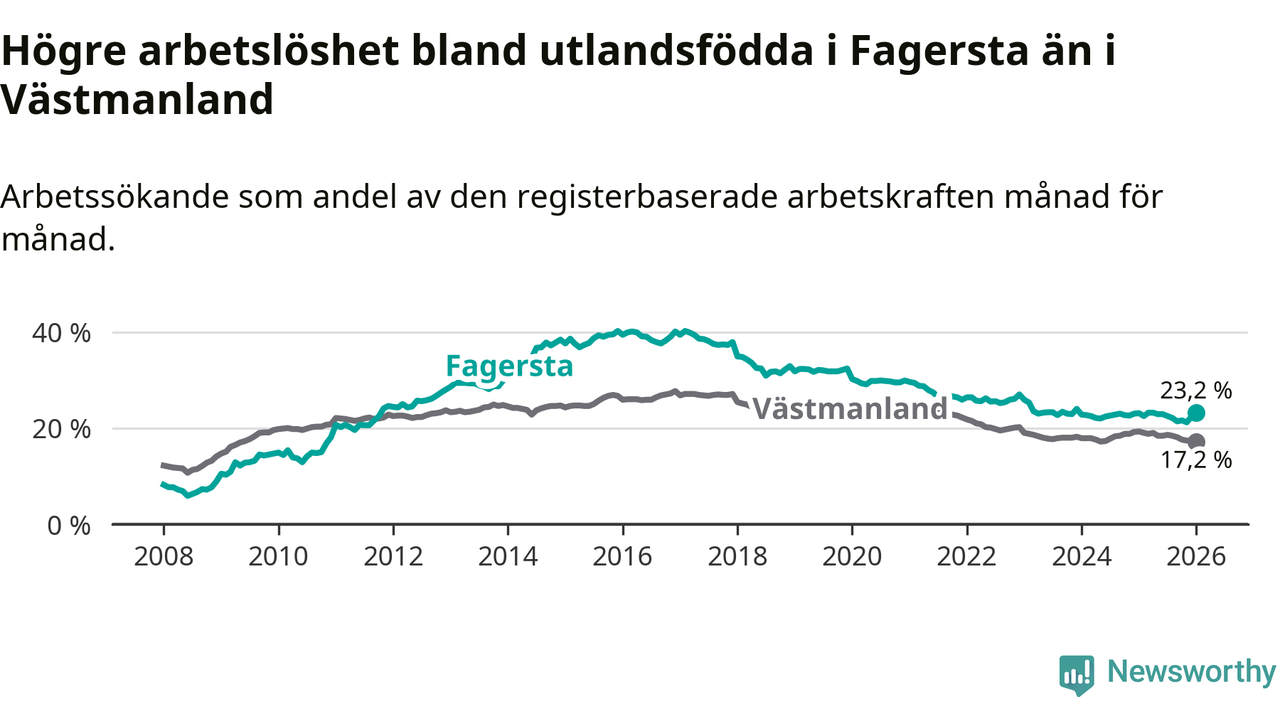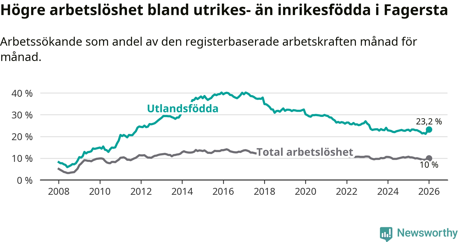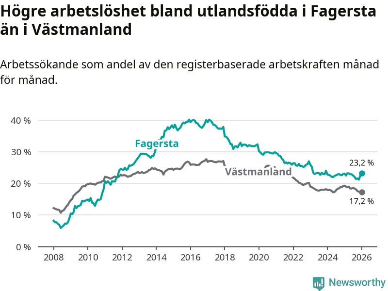 Arbetslösheten bland utlandsfödda var 23,2 procent i Fagersta under januari månad, motsvarande 421 av 1 815 personer. Det är 0,1 procentenheter fler än vid samma tidpunkt i fjol (±0 om man räknar personer). Den senaste månadens uppgång innebär ett trendbrott. Under de sex föregående månaderna hade arbetslösheten bland utlandsfödda varit lägre än motsvarande tidpunkt året innan.