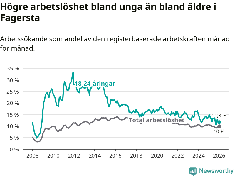 Precis som den totala arbetslösheten sjunker arbetslösheten bland unga (−2,6 procentenheter). I januari var 11,8 procent av 18–24-åringarna inskrivna som arbetssökande (motsvarande 72 personer). Mäter vi antalet inskrivna ser vi en minskning med 16 personer på ett års sikt.