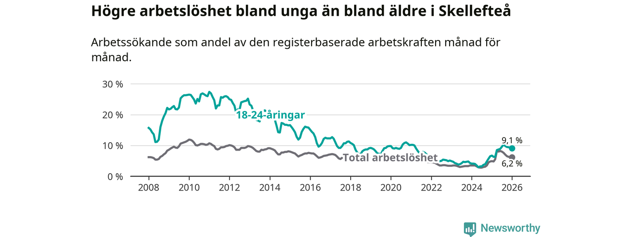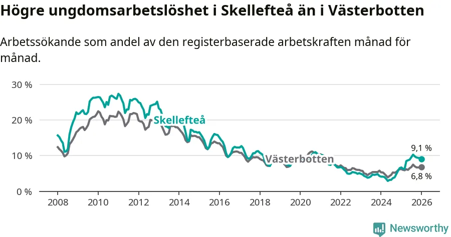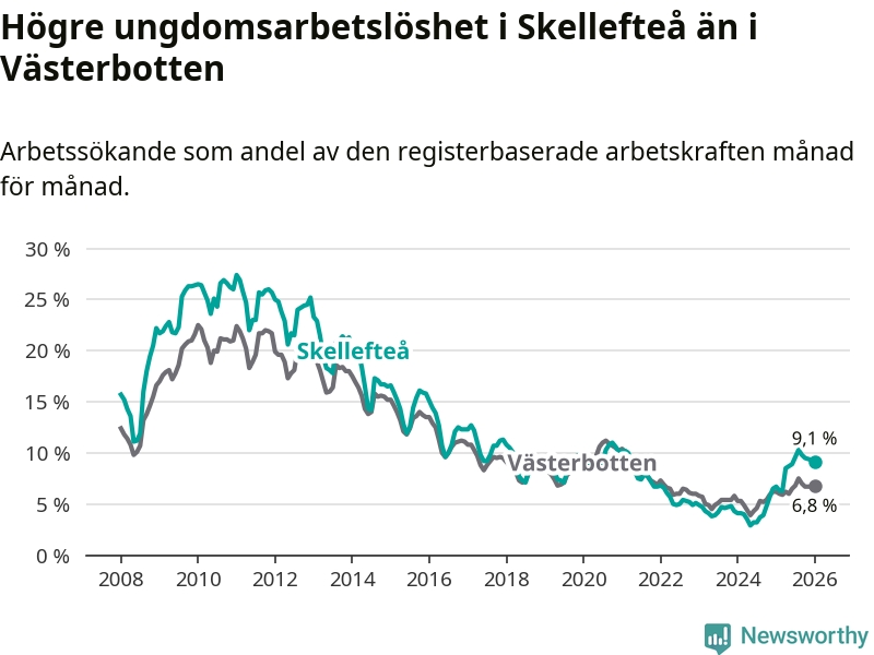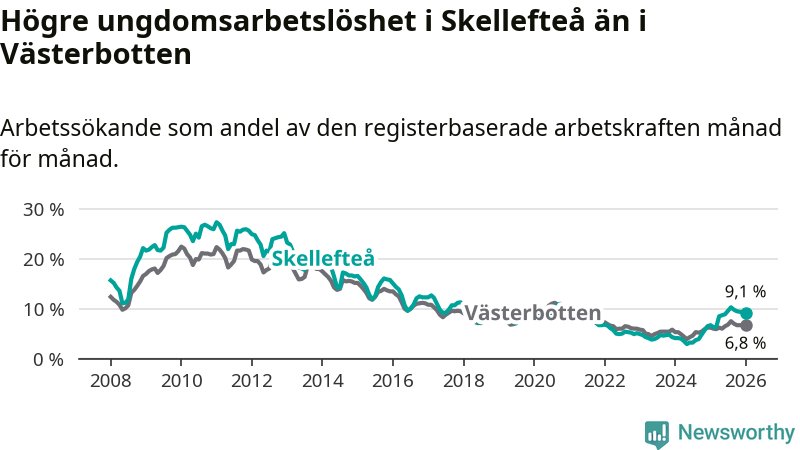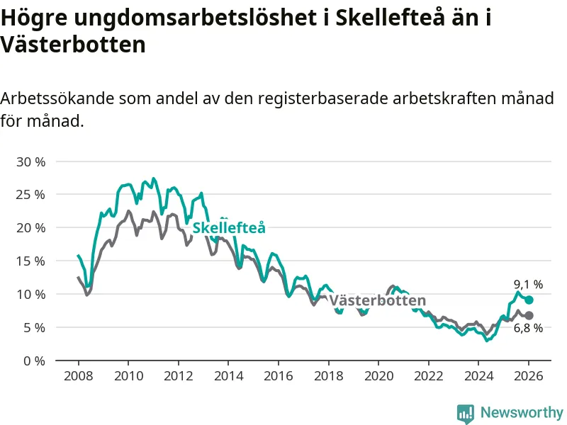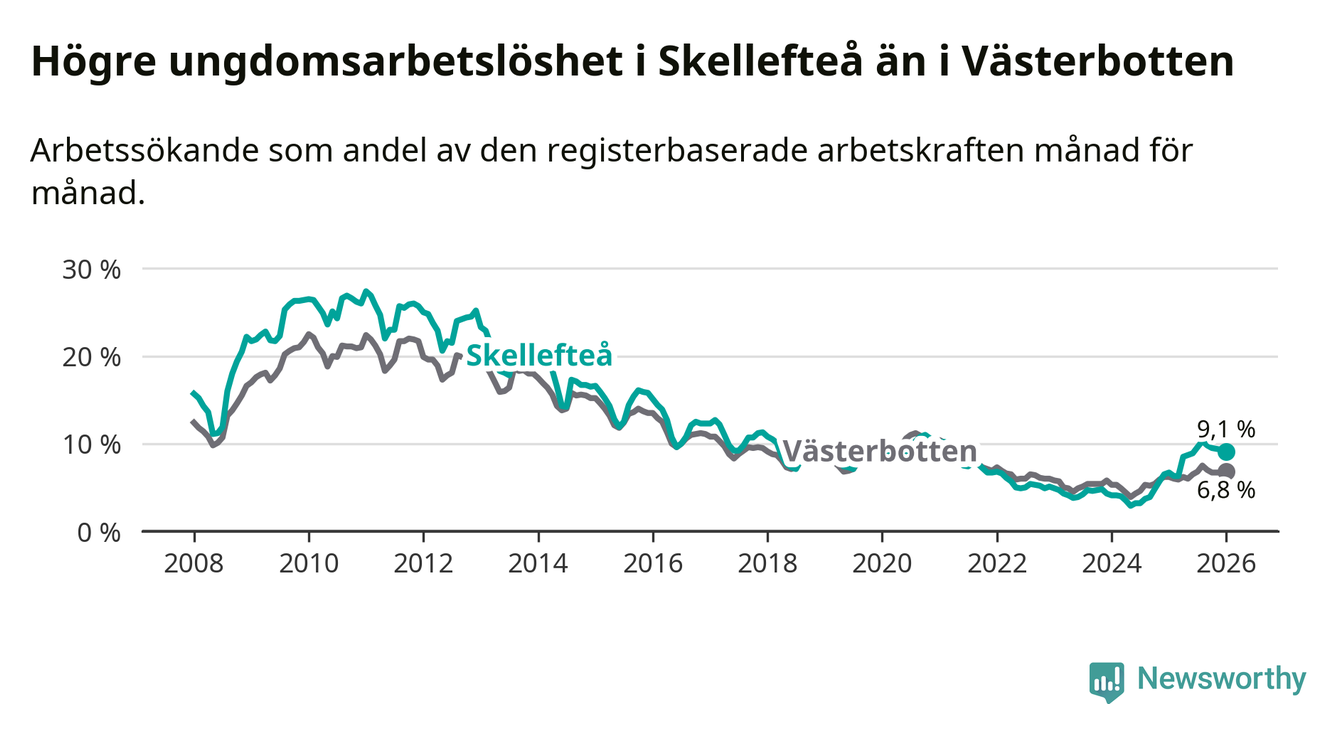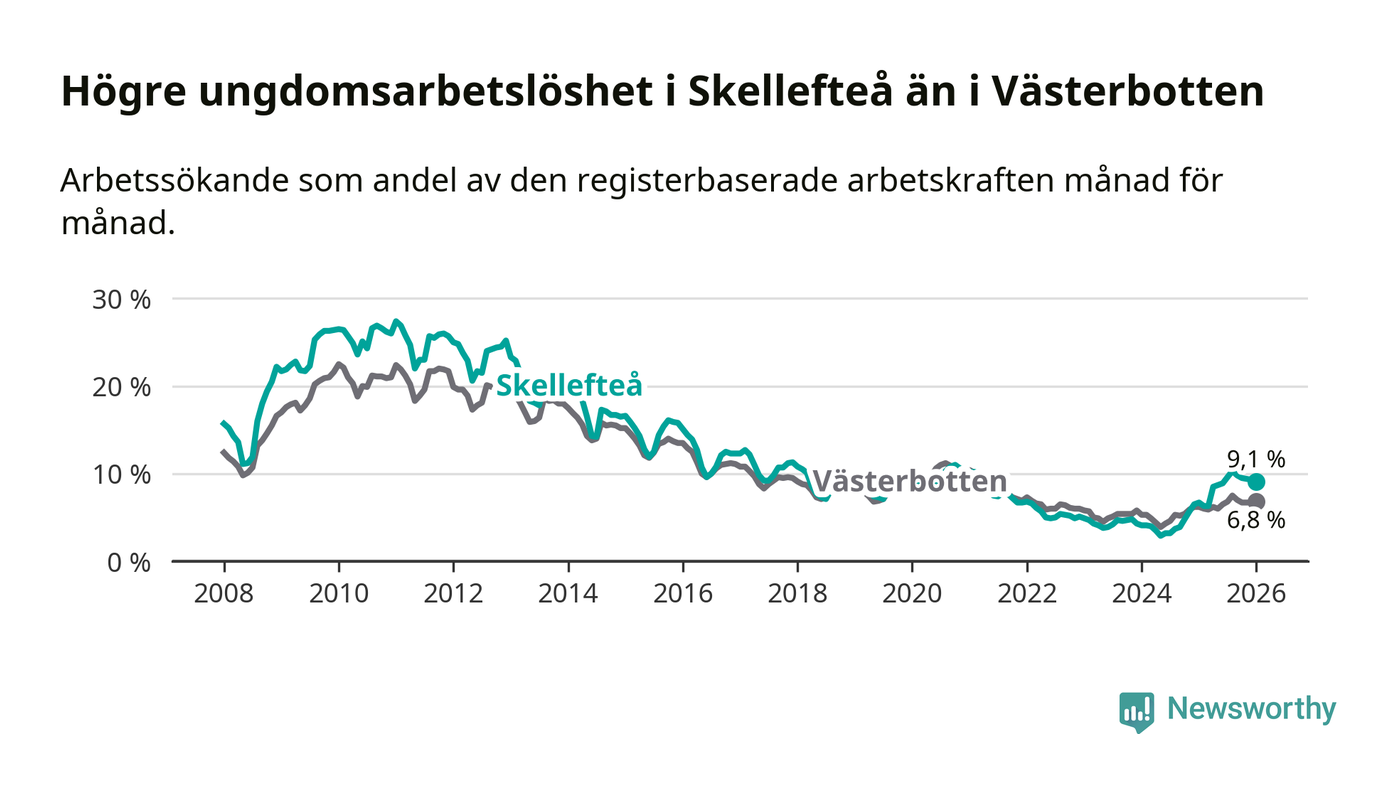 Precis som den totala arbetslösheten ligger ungdomsarbetslösheten i Skellefteå högre än i Västerbotten som helhet. Skillnaden mellan kommunen och länet är 2,3 procentenheter.