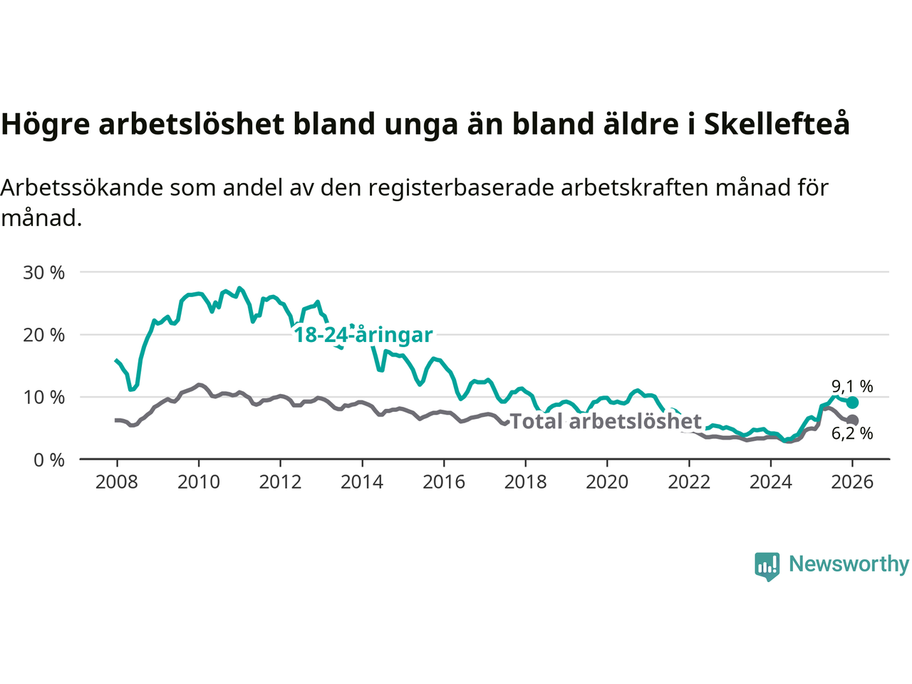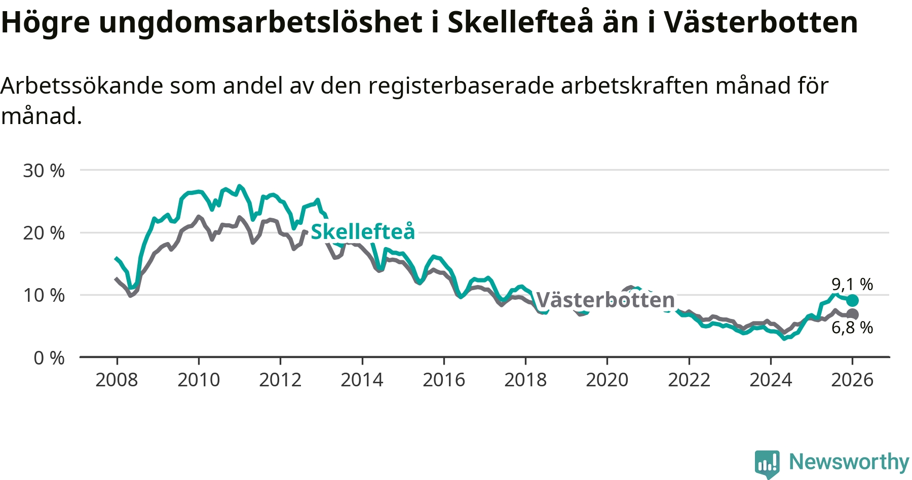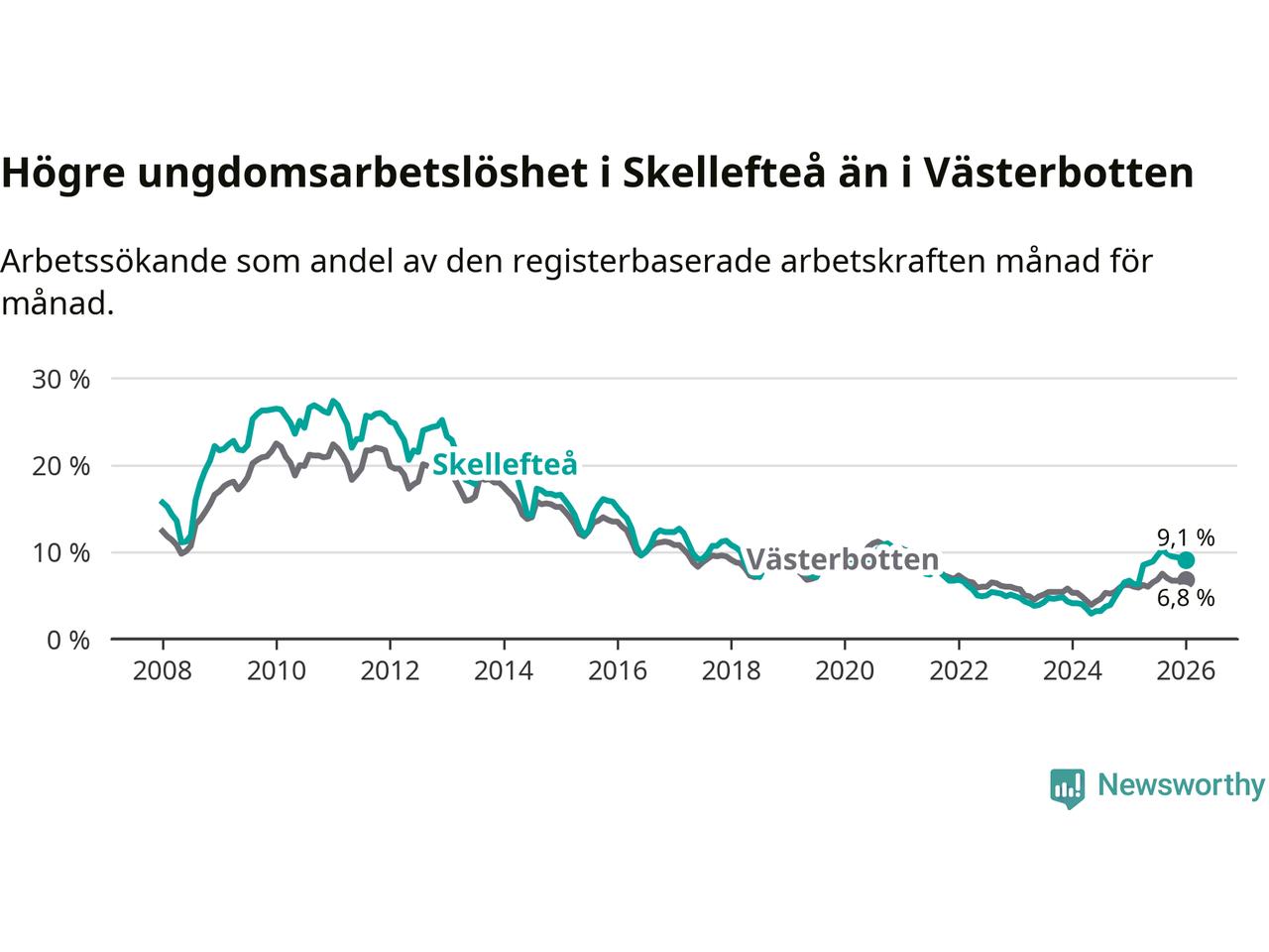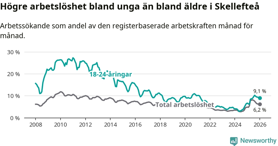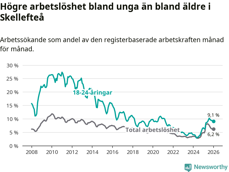Precis som den totala arbetslösheten ligger ungdomsarbetslösheten i Skellefteå högre än i Västerbotten som helhet. Skillnaden mellan kommunen och länet är 2,3 procentenheter.