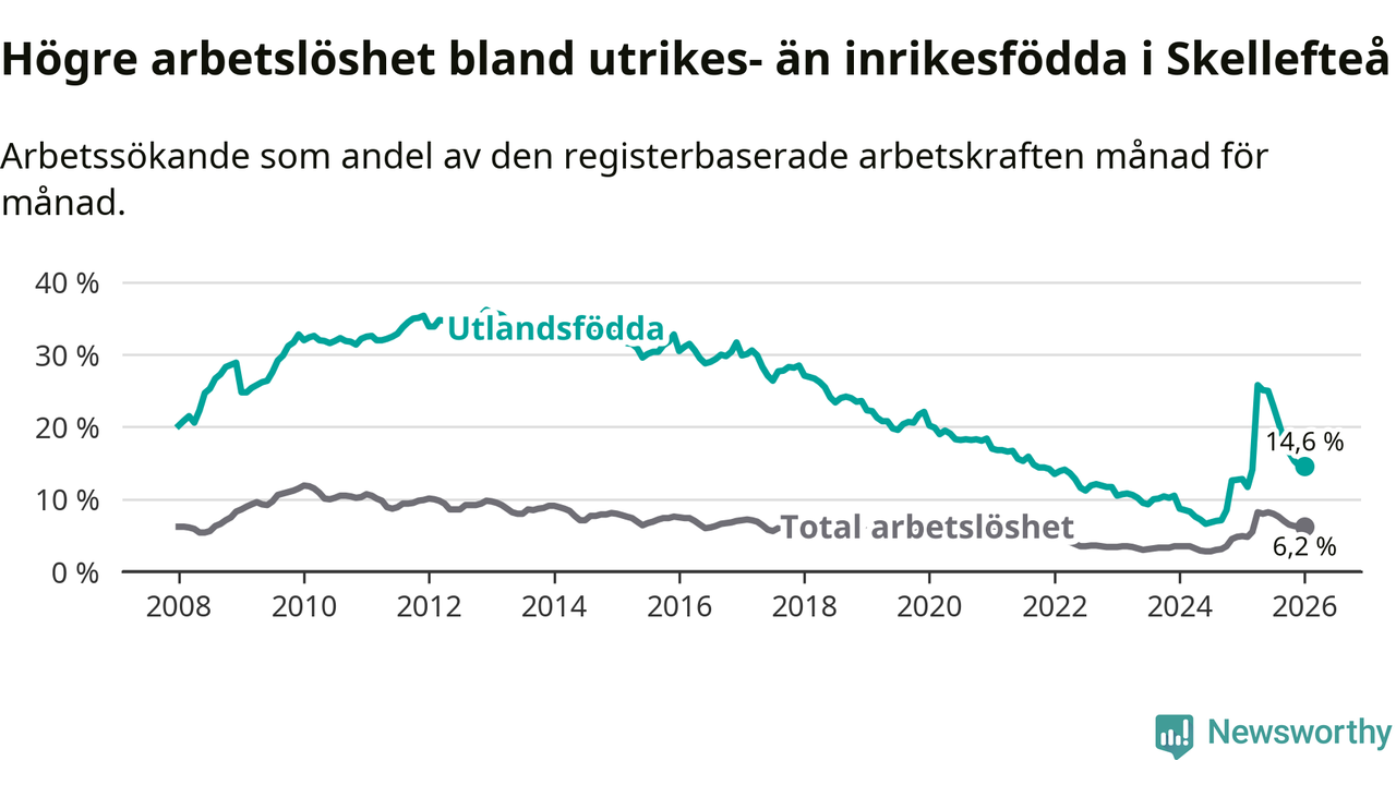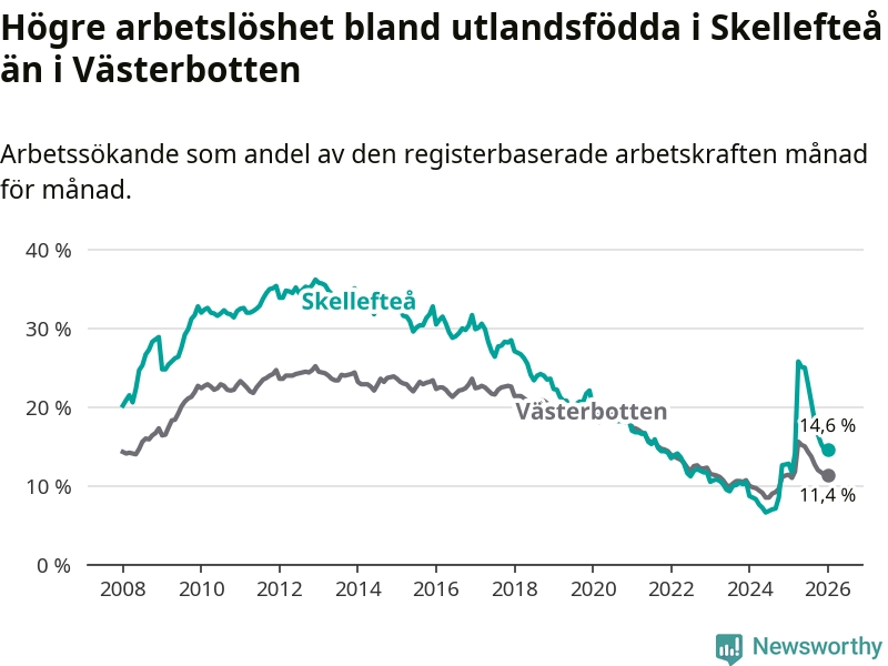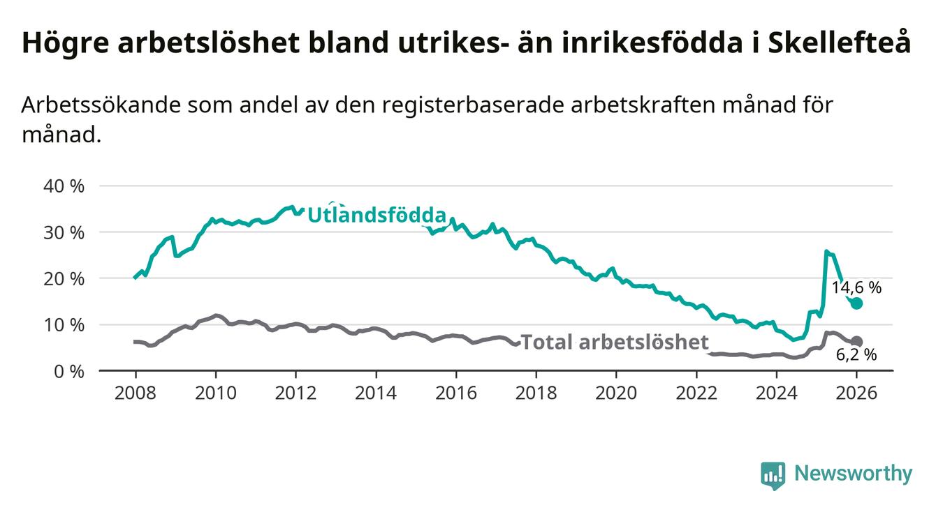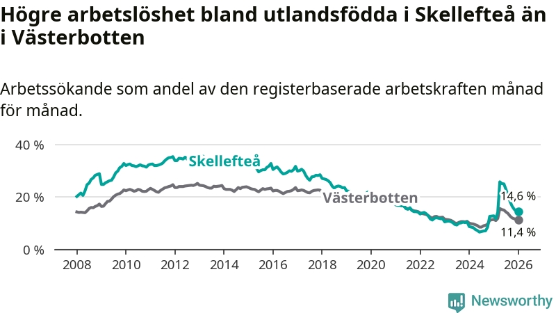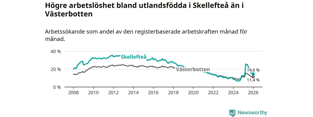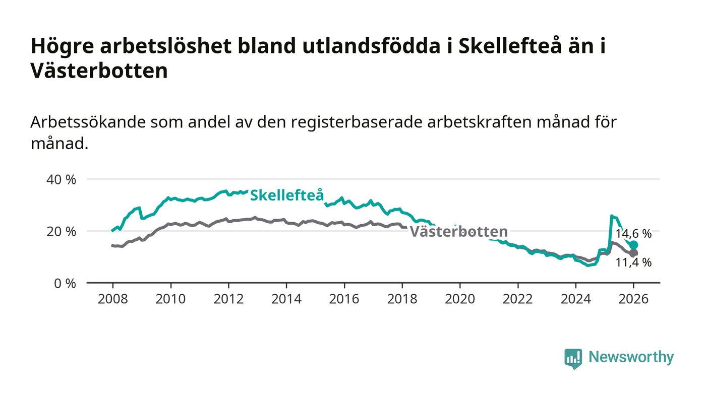 Arbetslösheten bland utlandsfödda var 14,6 procent i Skellefteå under januari månad, motsvarande 1 034 av 7 082 personer. Det är 1,8 procentenheter fler än vid samma tidpunkt i fjol (+112 om man räknar personer). Därmed är de utlandsföddas arbetslöshet högre än vid samma tidpunkt i fjol för 15:e månaden i följd. Sedan oktober 2024 har arbetslösheten bland utlandsfödda ökat från 8,5 till 14,6 procent.