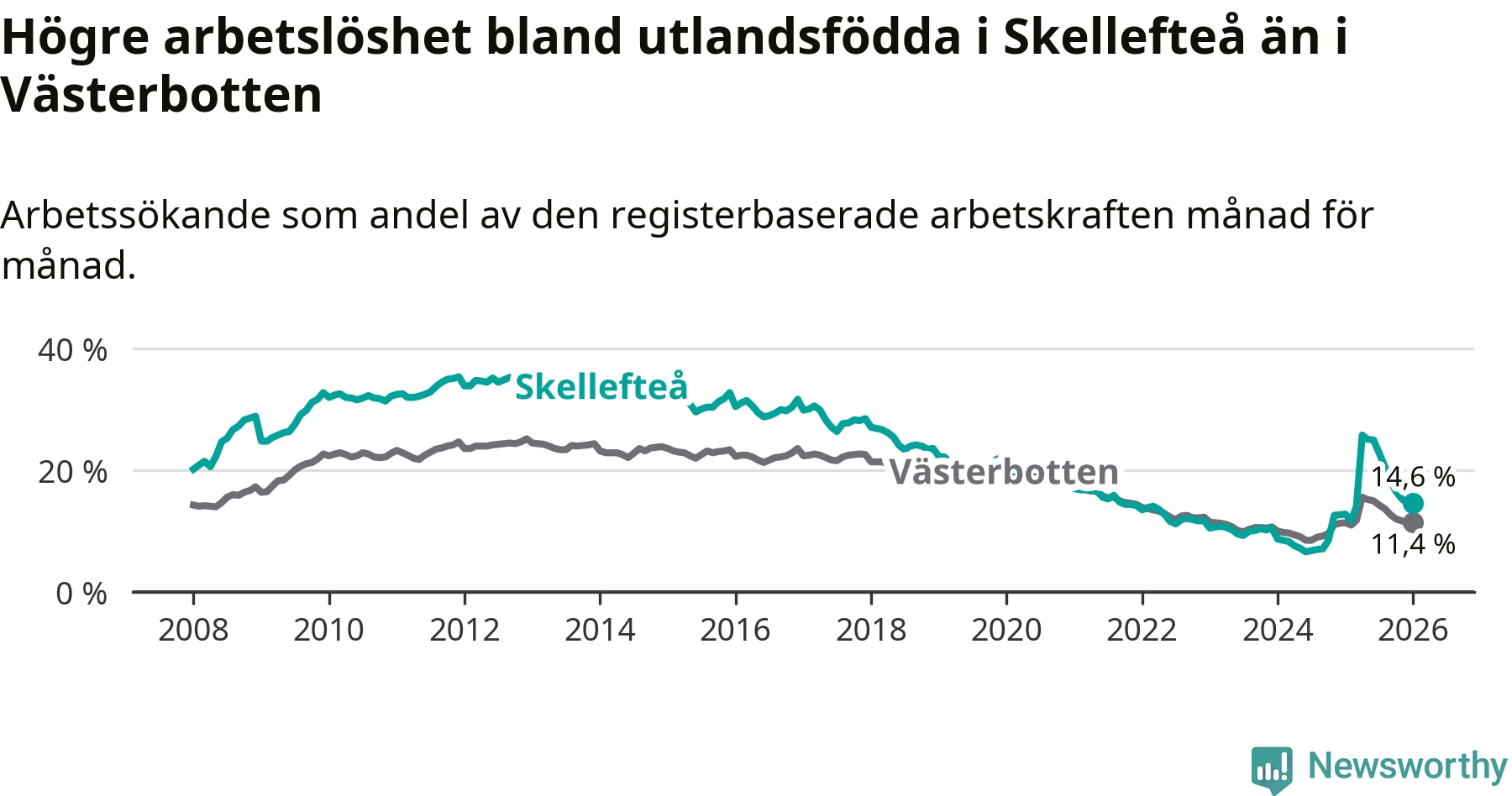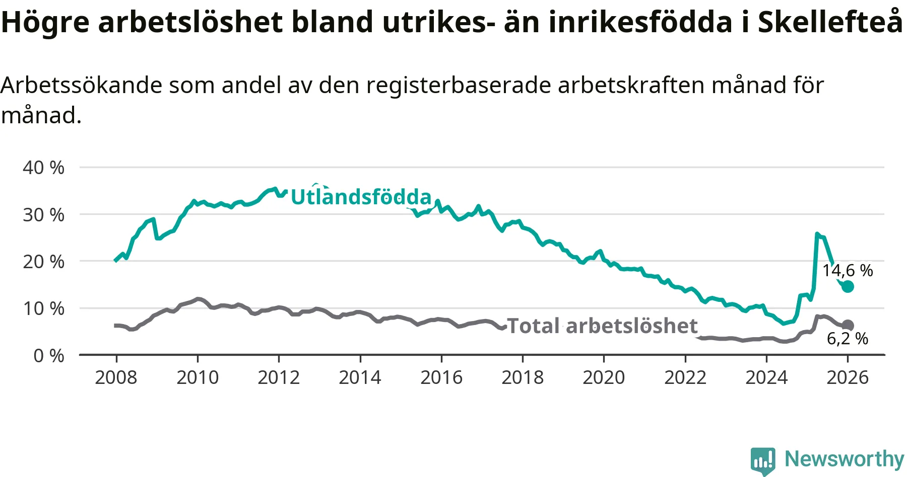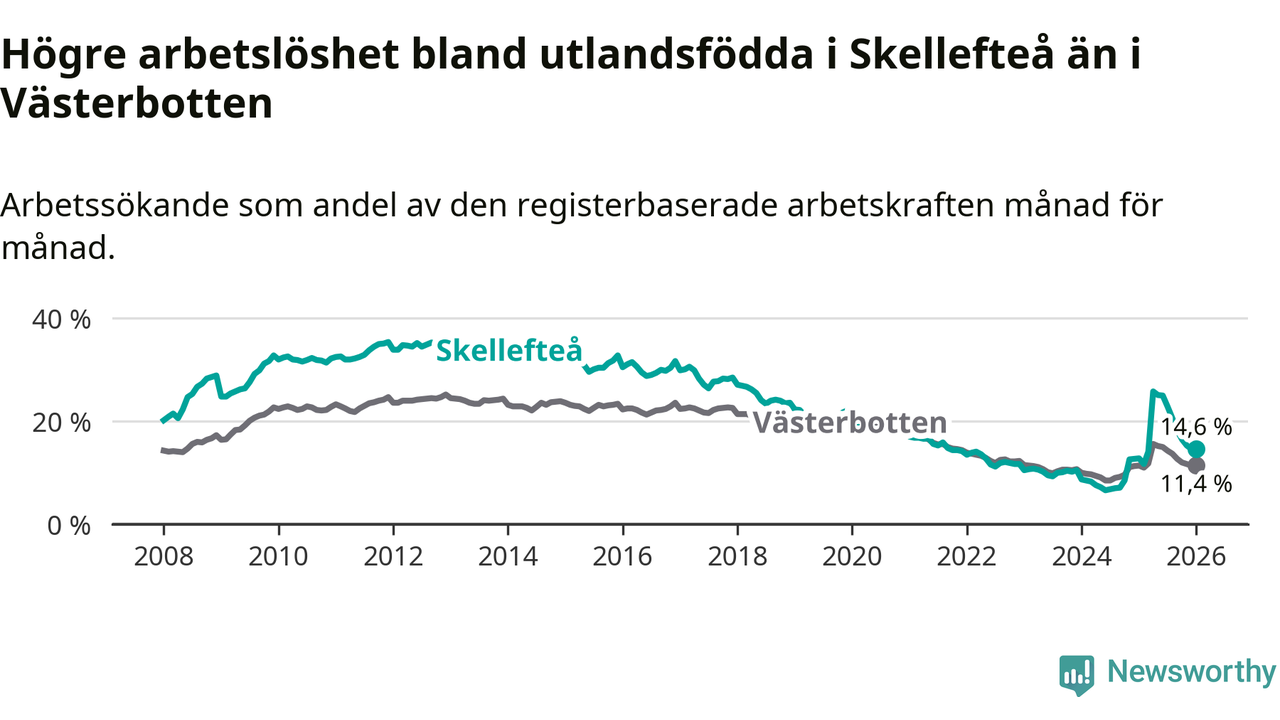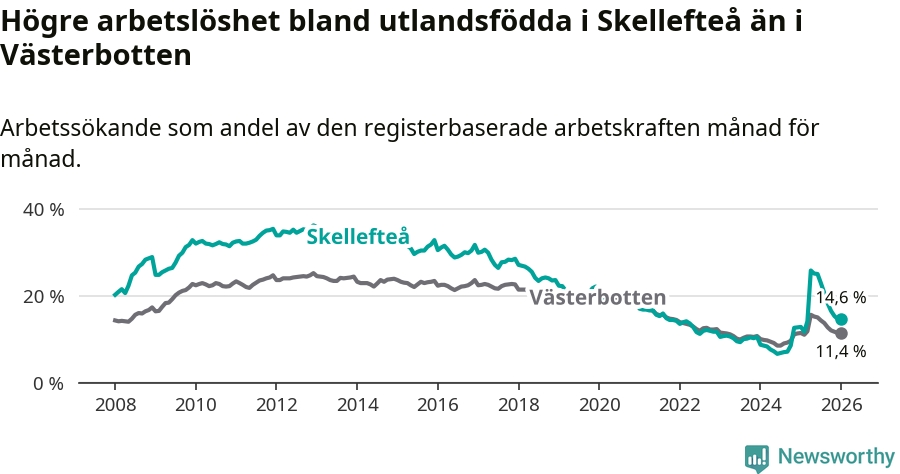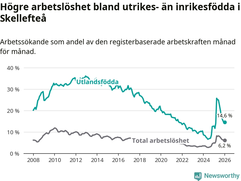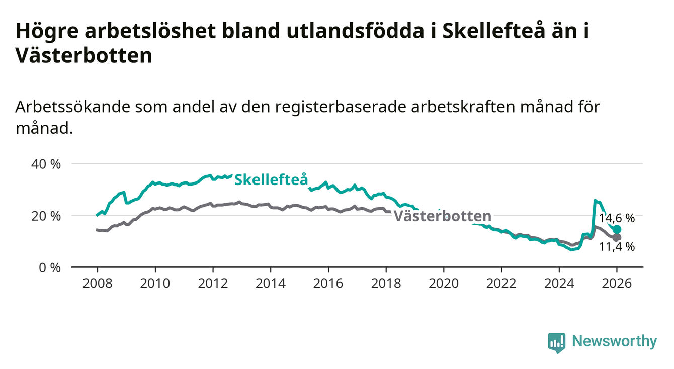 Arbetslösheten bland utlandsfödda var 14,6 procent i Skellefteå under januari månad, motsvarande 1 034 av 7 082 personer. Det är 1,8 procentenheter fler än vid samma tidpunkt i fjol (+112 om man räknar personer). Därmed är de utlandsföddas arbetslöshet högre än vid samma tidpunkt i fjol för 15:e månaden i följd. Sedan oktober 2024 har arbetslösheten bland utlandsfödda ökat från 8,5 till 14,6 procent.