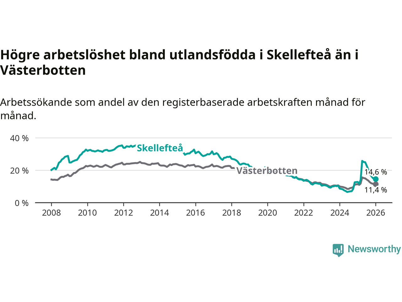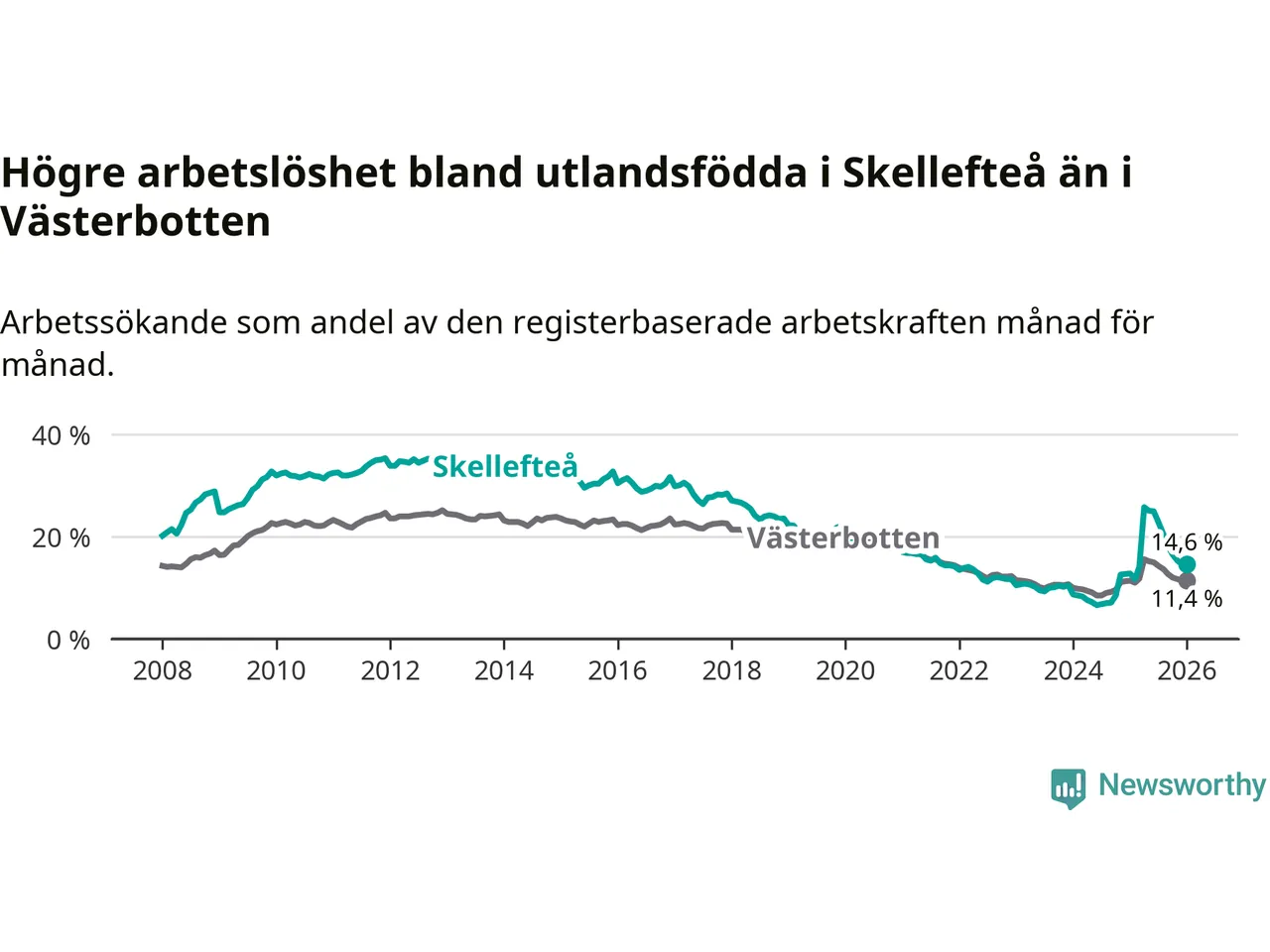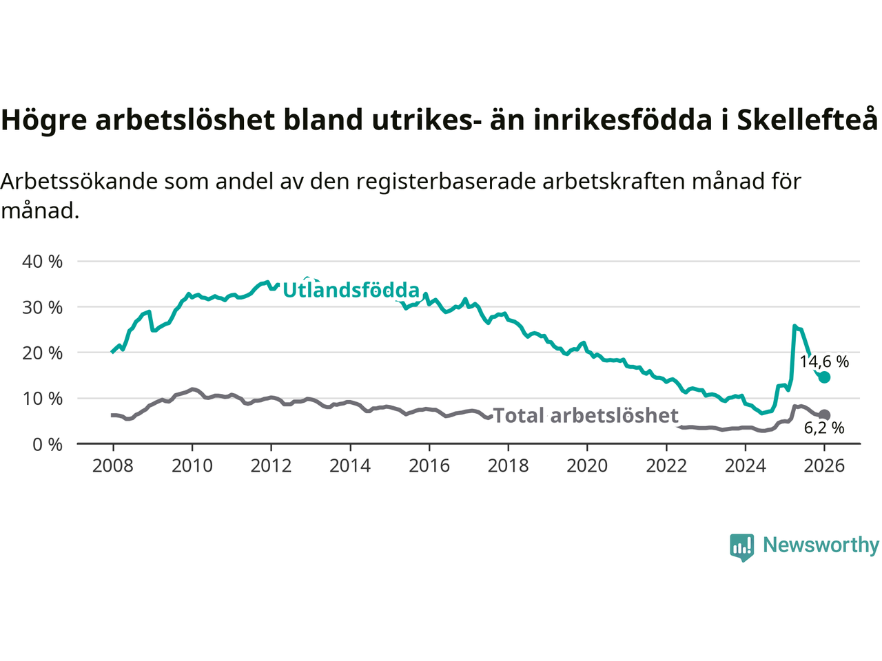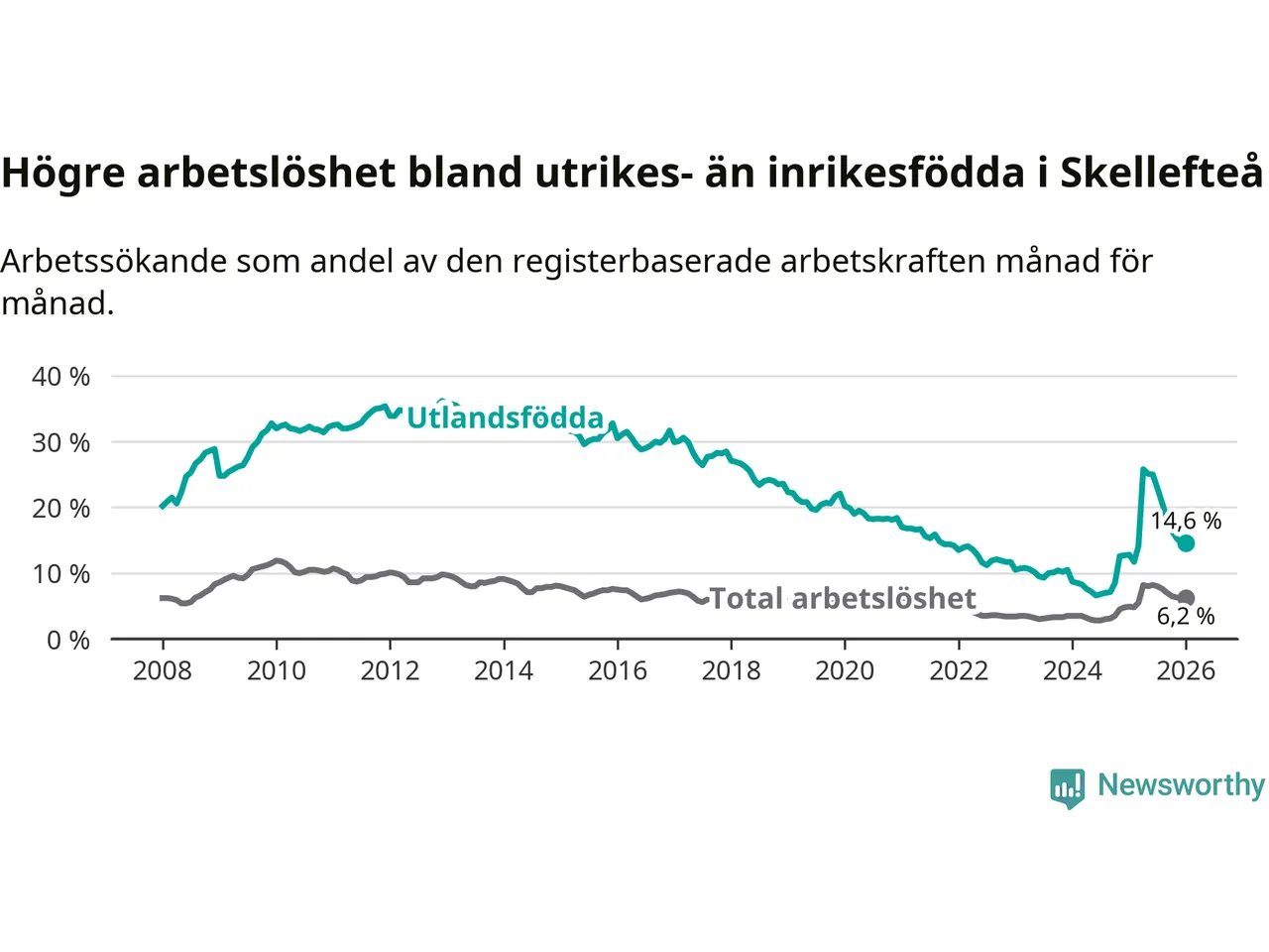 Arbetslösheten bland utlandsfödda var 14,6 procent i Skellefteå under januari månad, motsvarande 1 034 av 7 082 personer. Det är 1,8 procentenheter fler än vid samma tidpunkt i fjol (+112 om man räknar personer). Därmed är de utlandsföddas arbetslöshet högre än vid samma tidpunkt i fjol för 15:e månaden i följd. Sedan oktober 2024 har arbetslösheten bland utlandsfödda ökat från 8,5 till 14,6 procent.