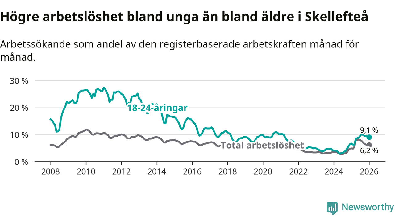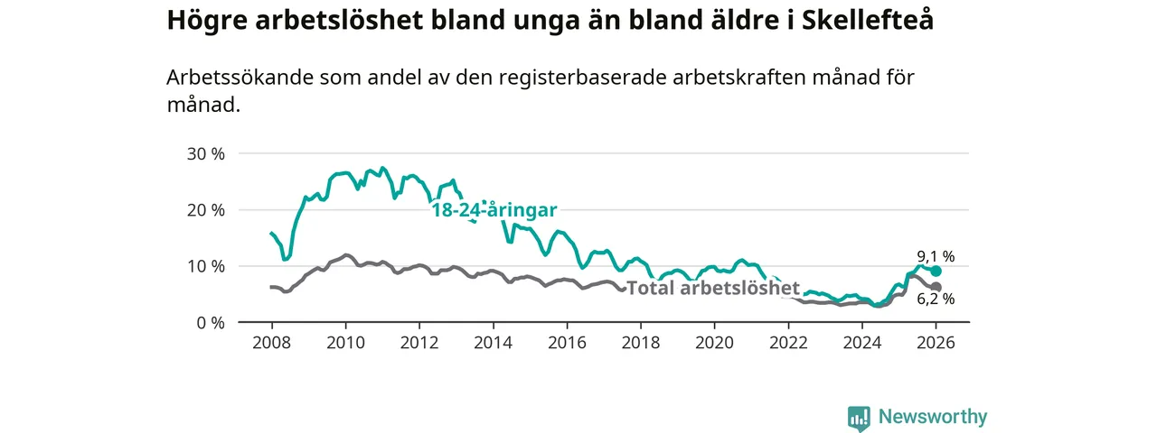 I och med den senaste månadens uppgång har de ungas arbetslöshet i Skellefteå stigit 16 månader i följd (upp från 3,9 procent i september 2024 till 9,1 procent nu).
