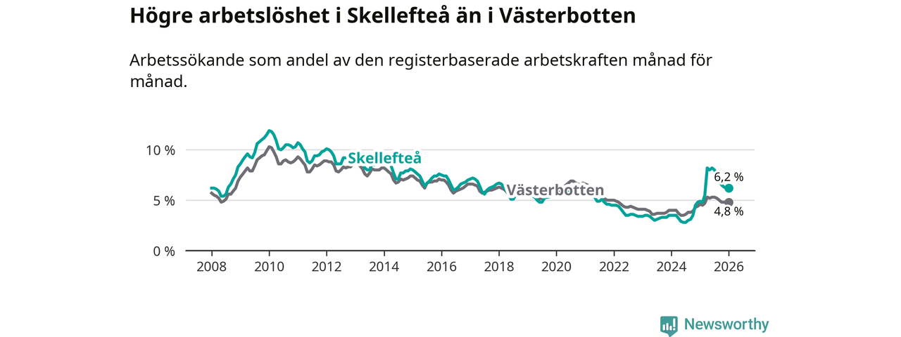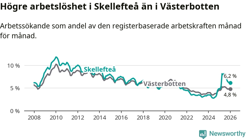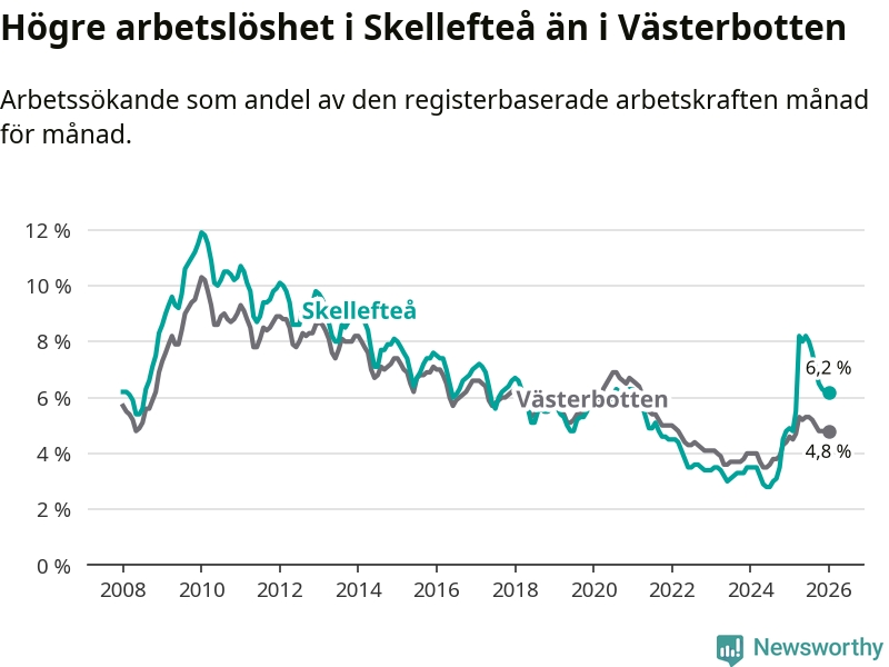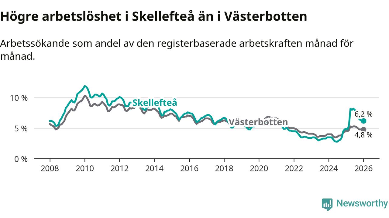 Under januari månad rapporterade Skellefteå kommun en total arbetslöshet på 6,2 procent. Det är en ökning jämfört med samma tidpunkt i fjol (+1,3 procentenheter). Även i Västerbottens län stiger arbetslösheten .