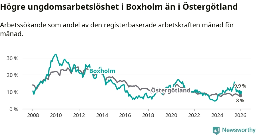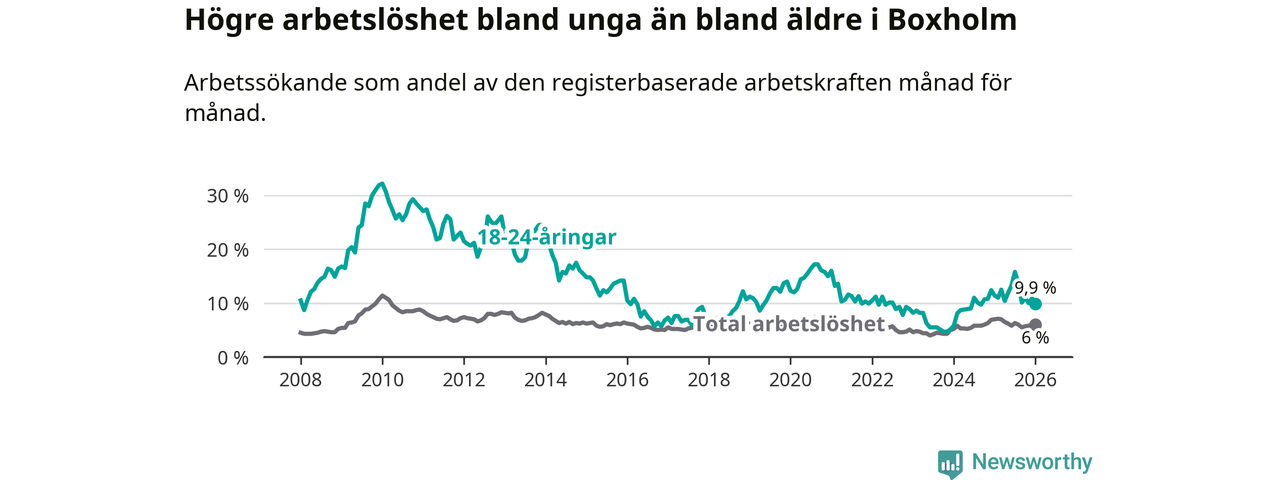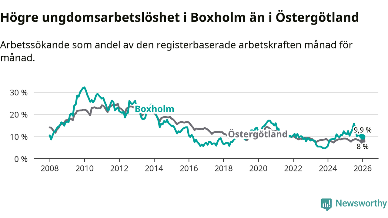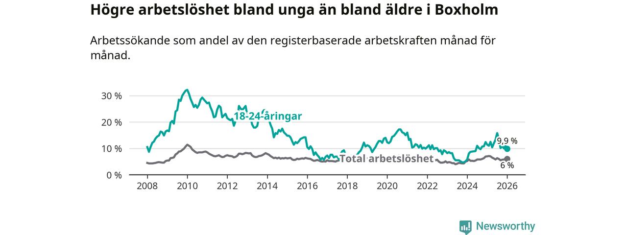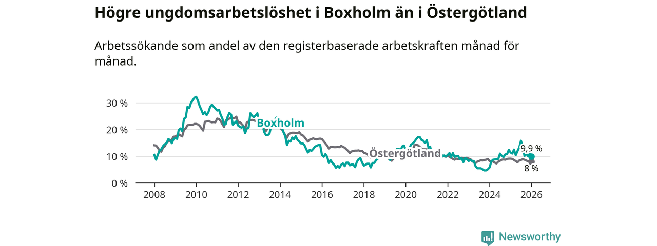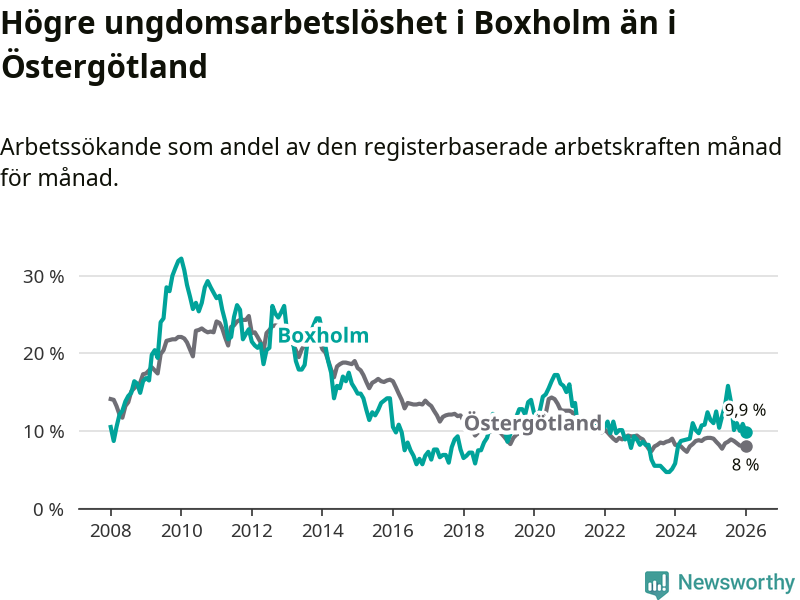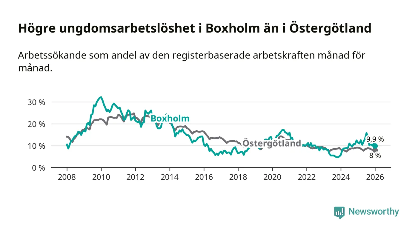 Medan Boxholm har lägre total arbetslöshet än Östergötland, ligger ungdomsarbetslösheten 1,9 procentenheter högre i Boxholm.