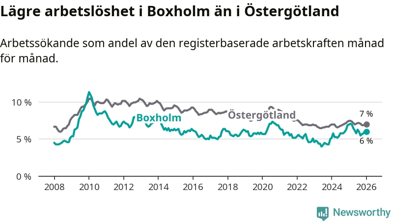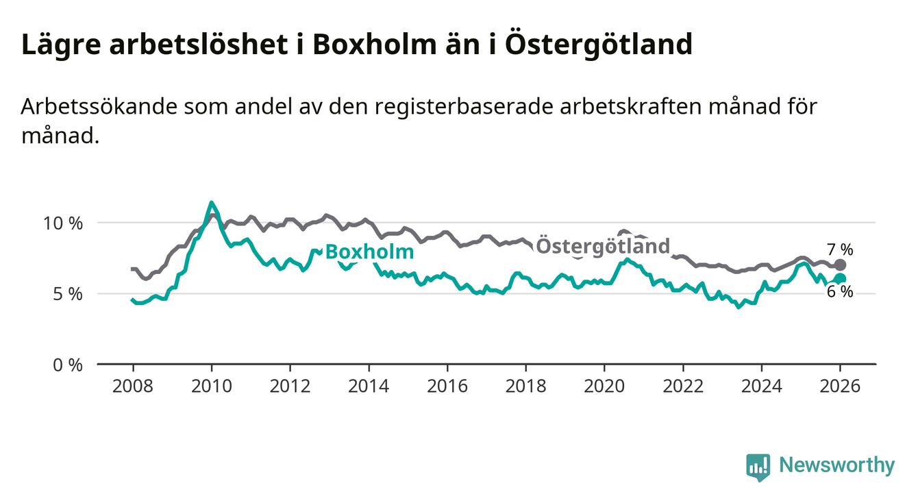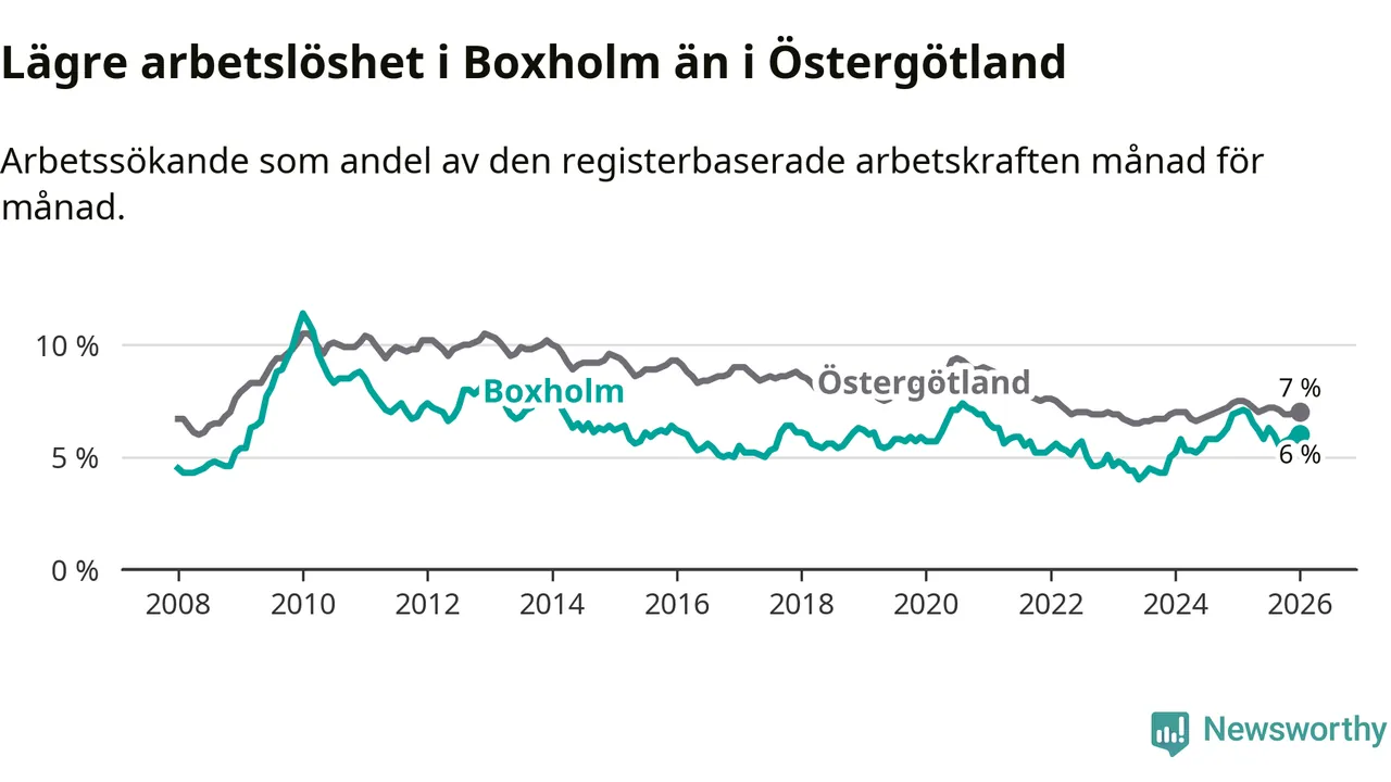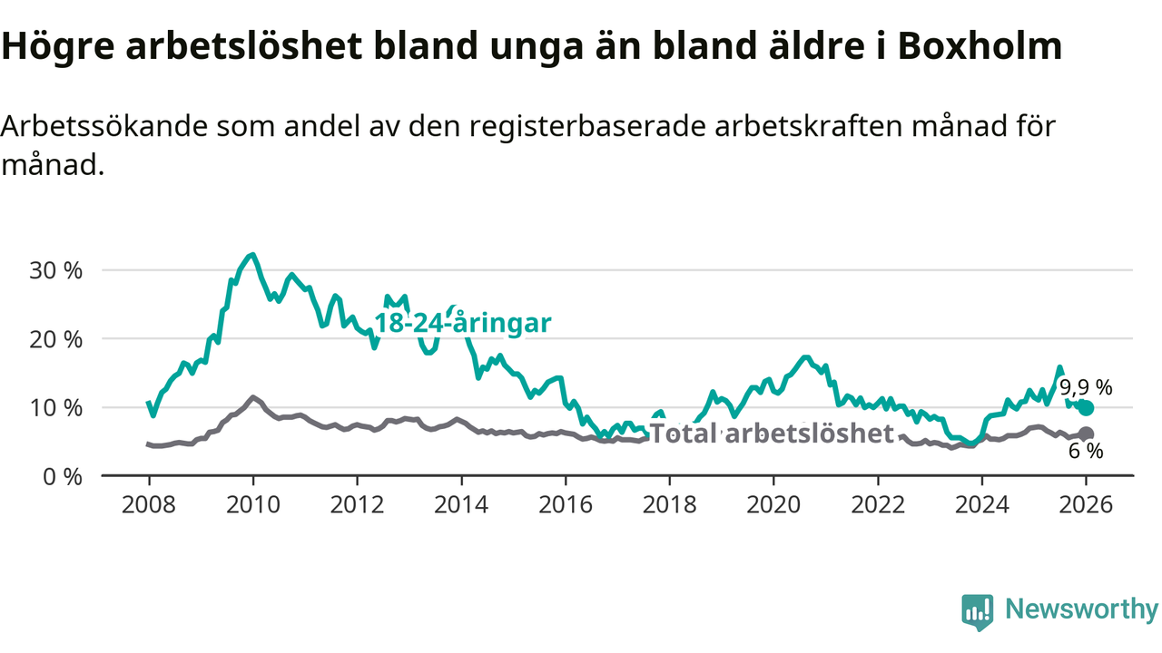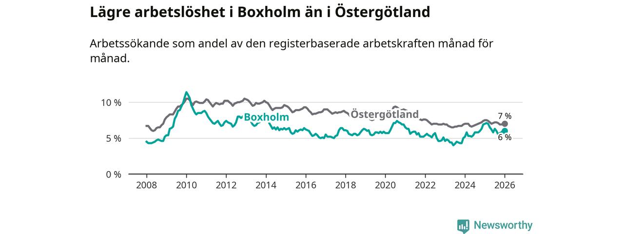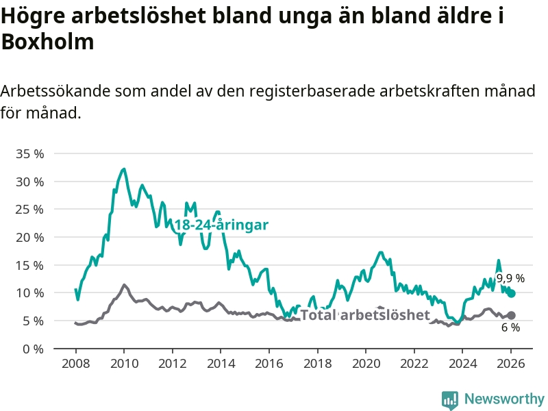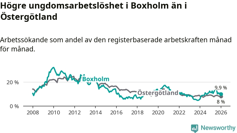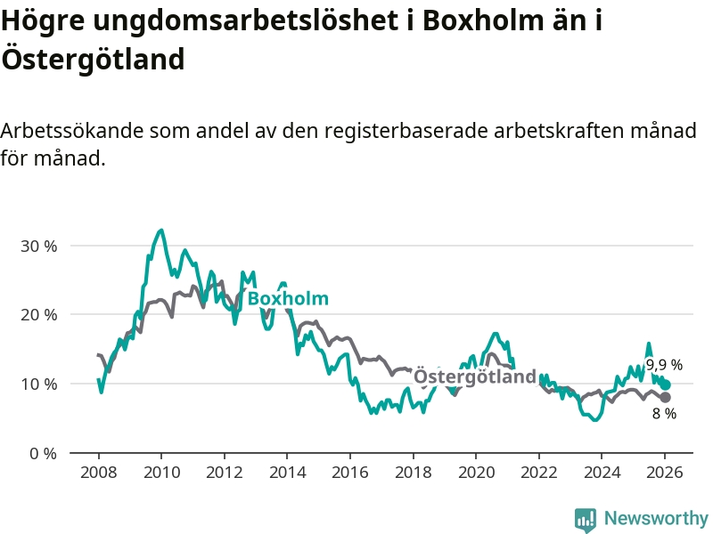 Medan Boxholm har lägre total arbetslöshet än Östergötland, ligger ungdomsarbetslösheten 1,9 procentenheter högre i Boxholm.