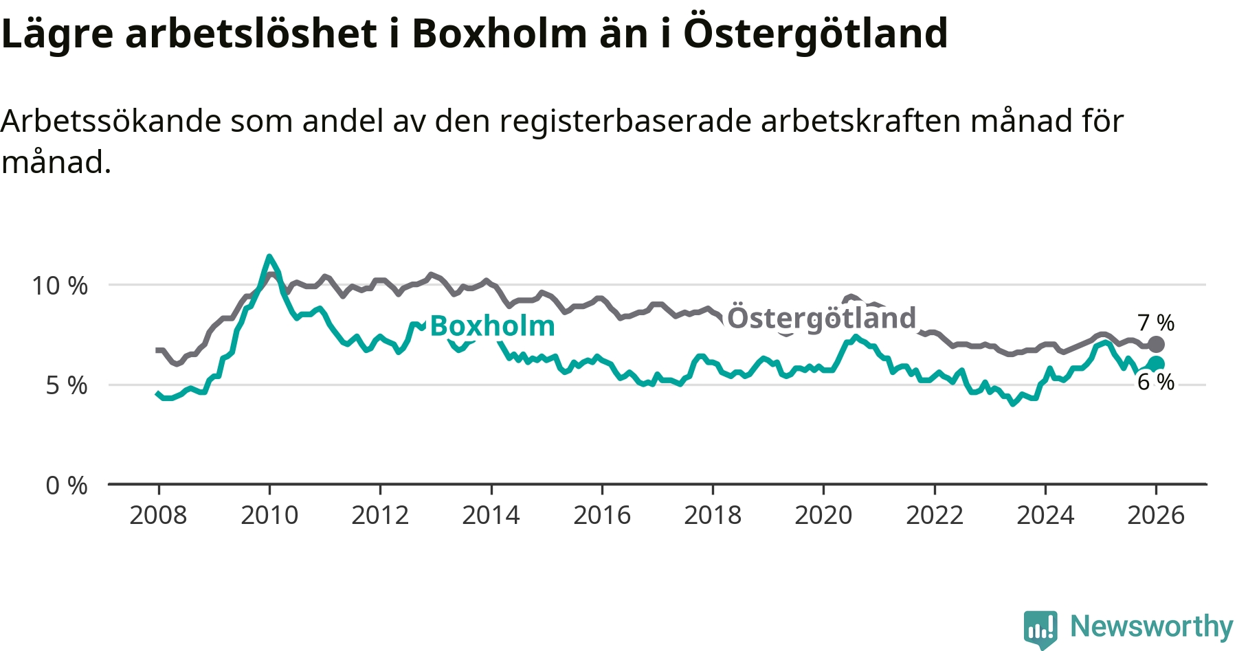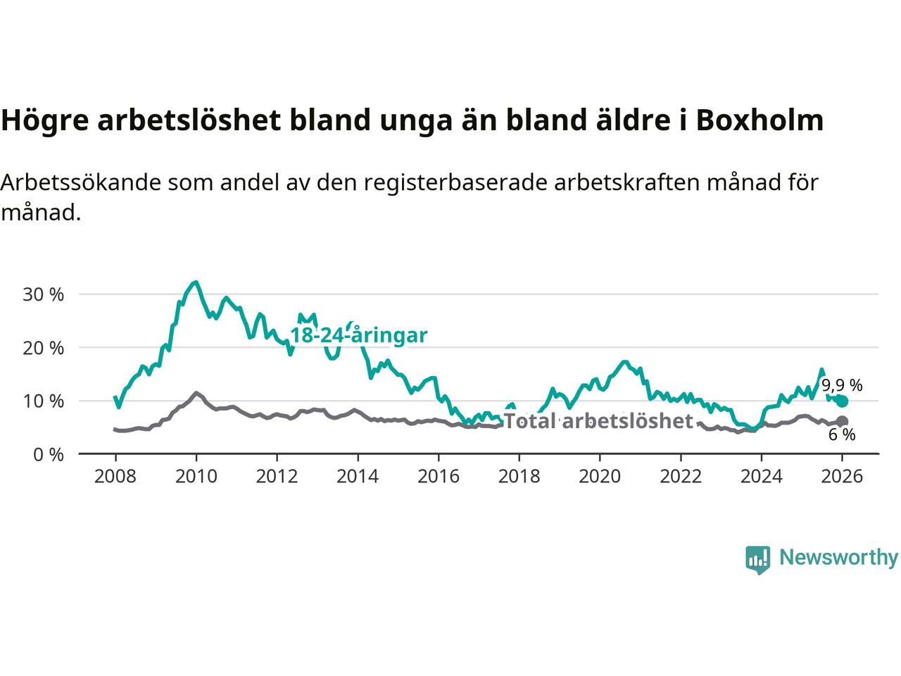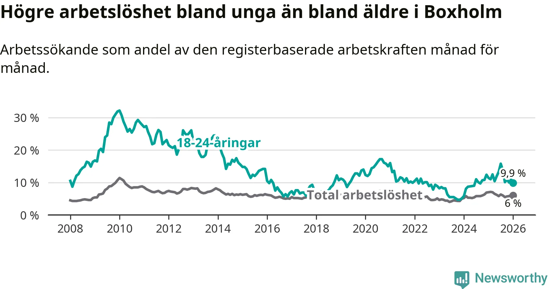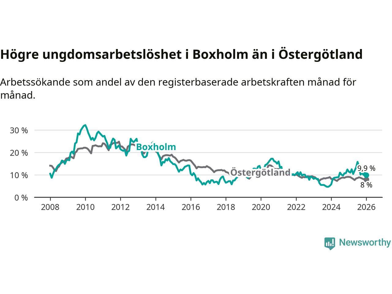 Medan Boxholm har lägre total arbetslöshet än Östergötland, ligger ungdomsarbetslösheten 1,9 procentenheter högre i Boxholm.