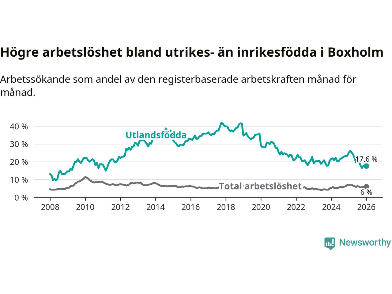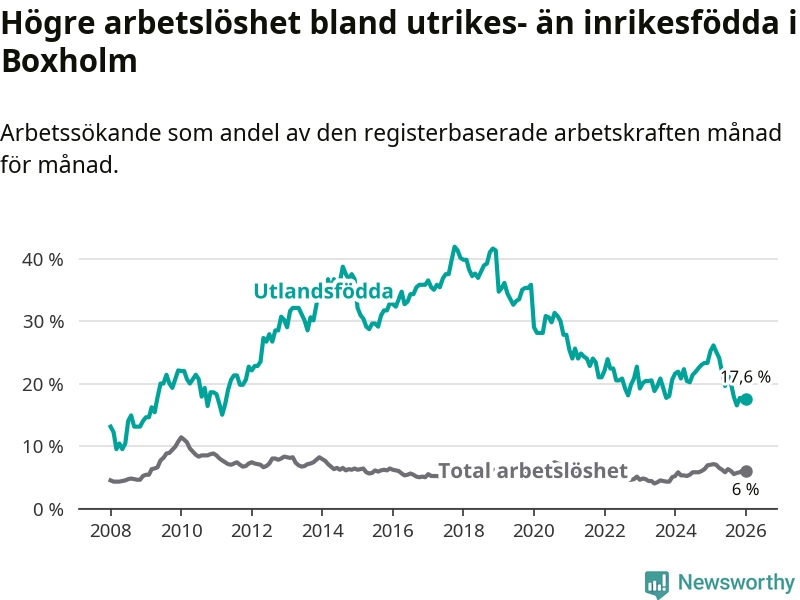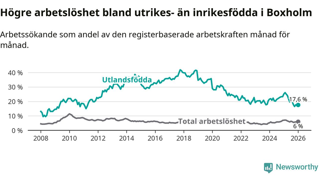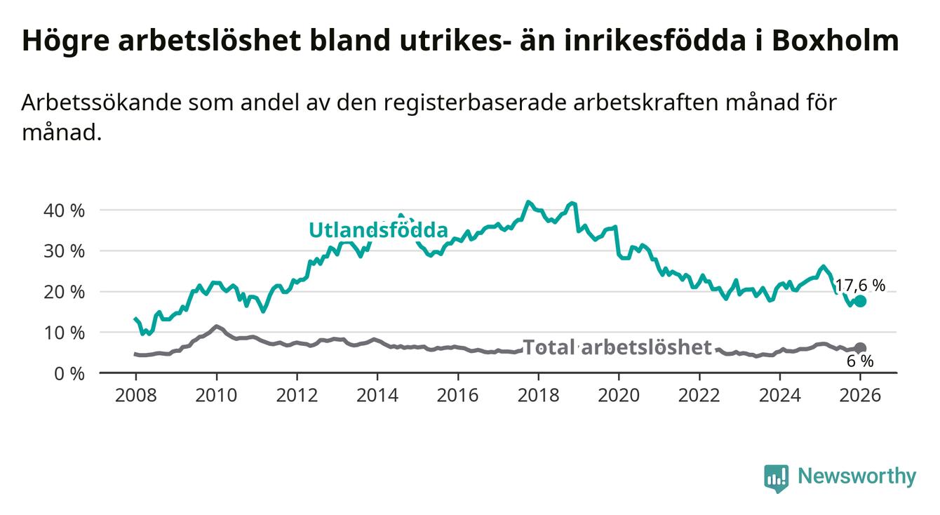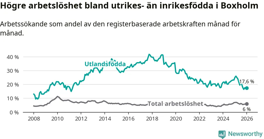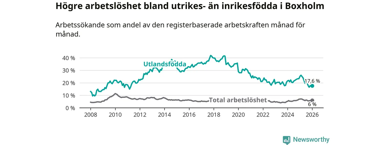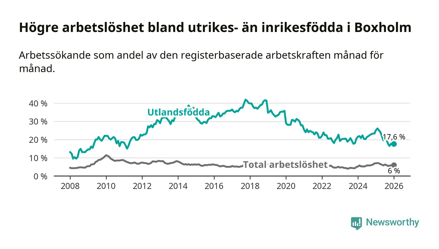Arbetslösheten bland utlandsfödda var 17,6 procent i Boxholm under januari månad, motsvarande 57 av 324 personer. Det är 7,6 procentenheter färre än vid samma tidpunkt i fjol (−22 om man räknar personer). Därmed är de utlandsföddas arbetslöshet lägre än vid samma tidpunkt i fjol för sjätte månaden i följd. Sedan juli 2025 har arbetslösheten bland utlandsfödda minskat från 21,4 till 17,6 procent.