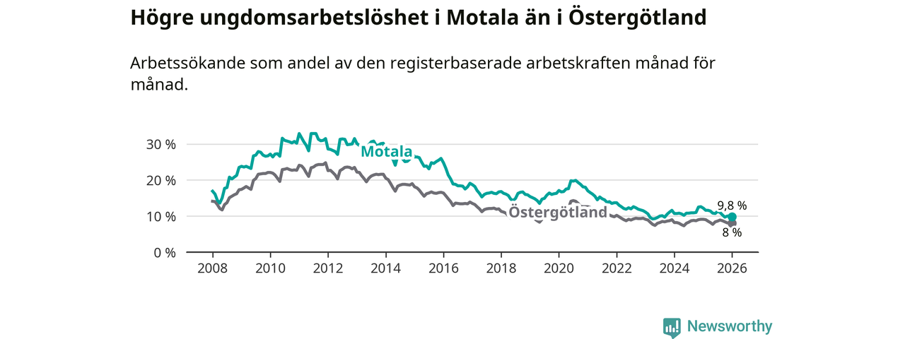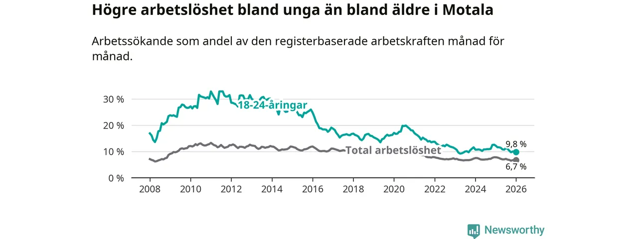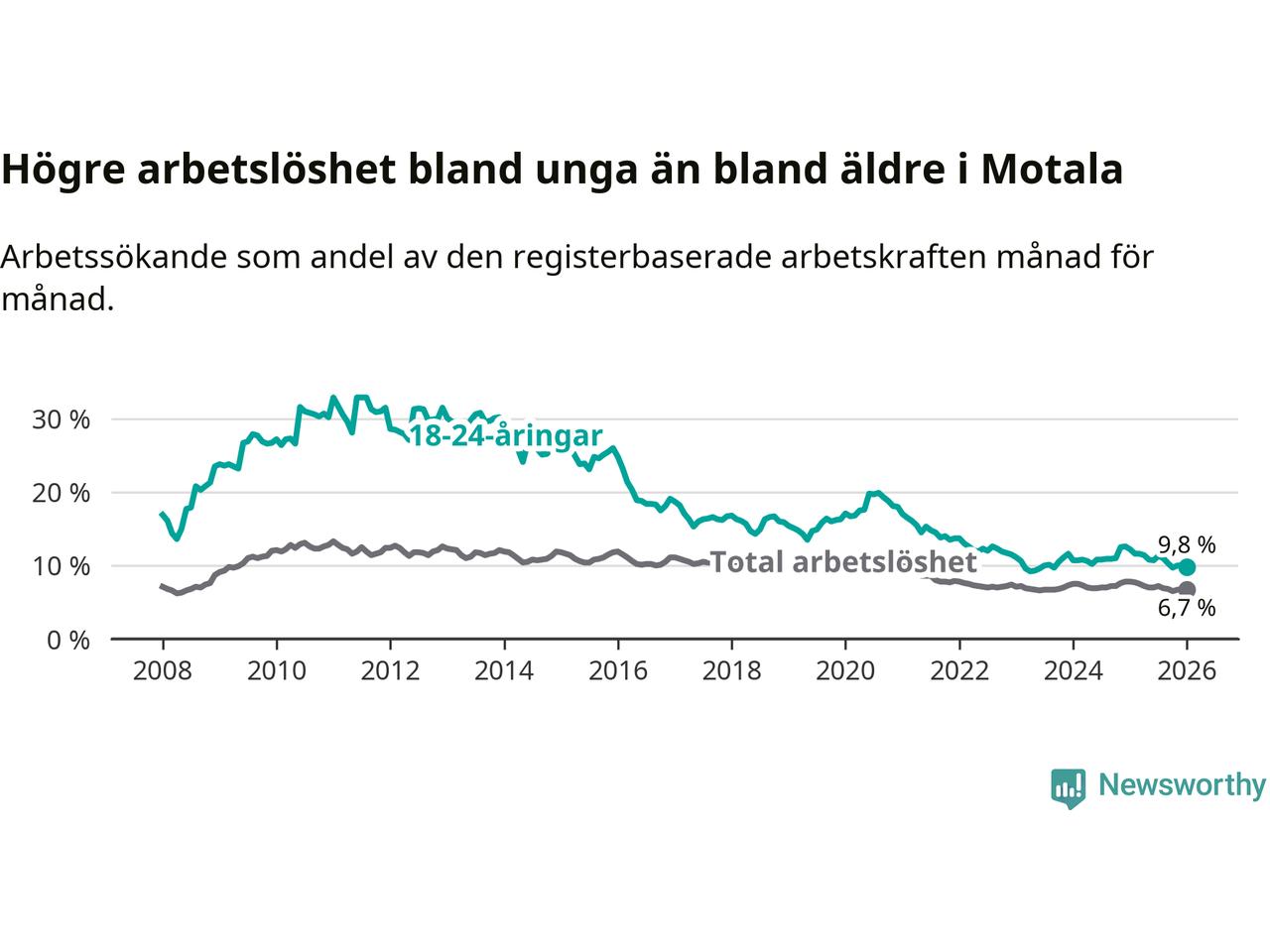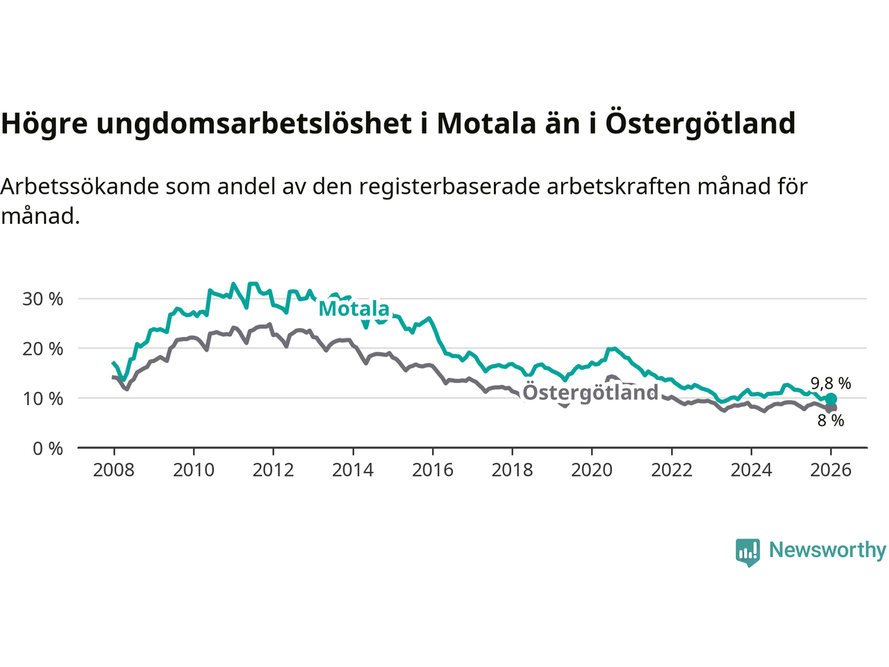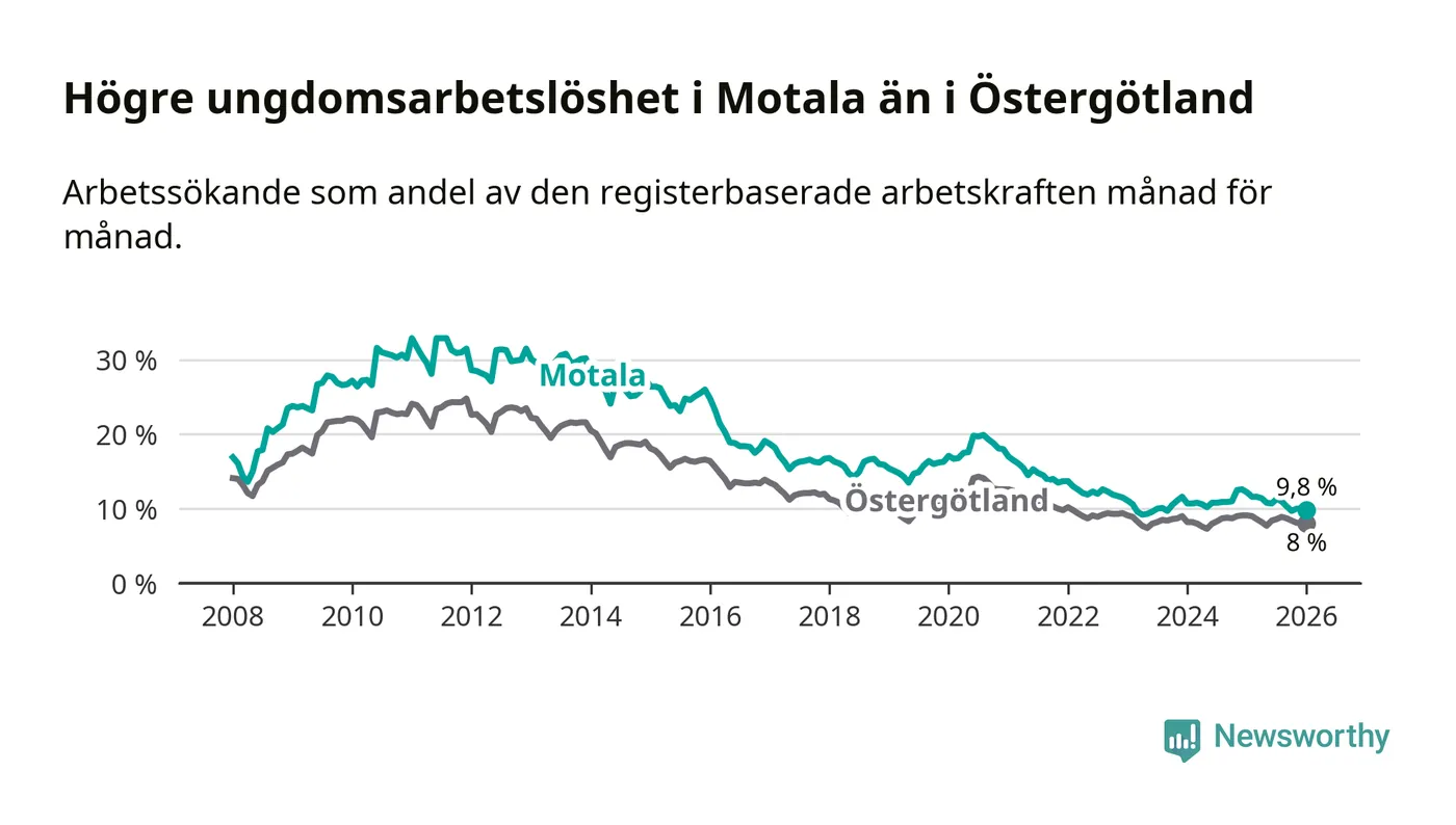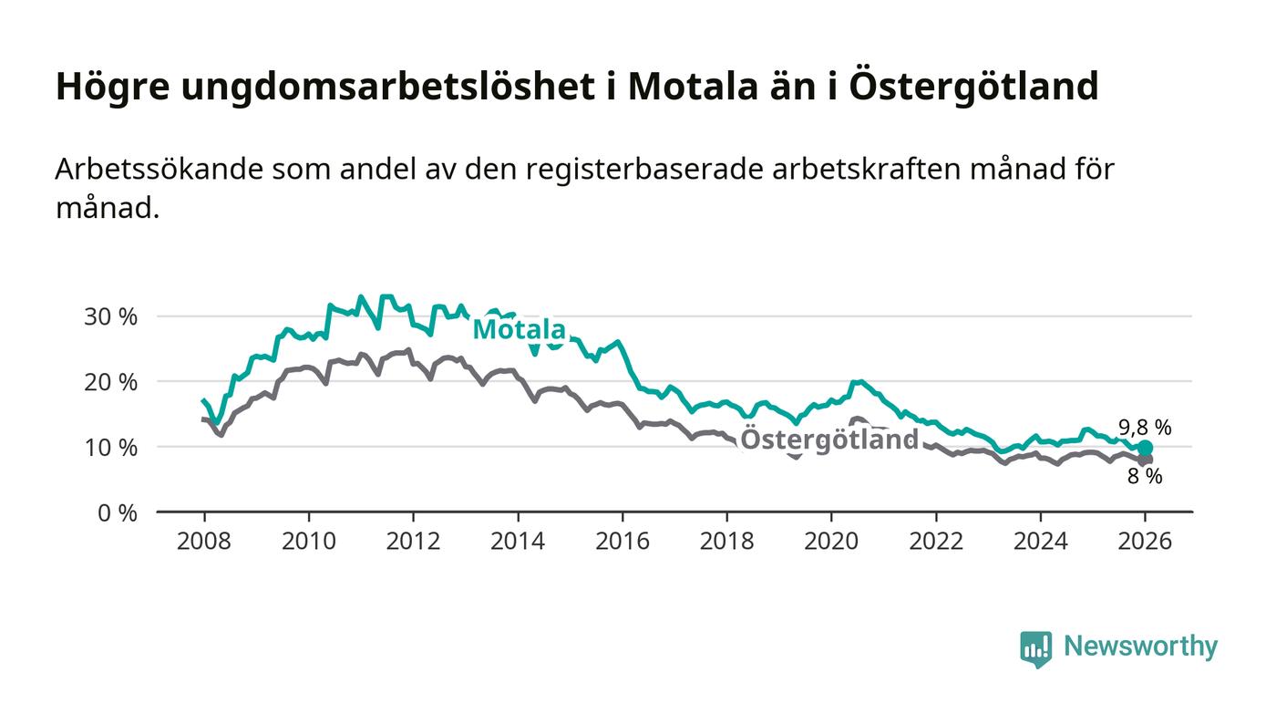 Medan Motala har lägre total arbetslöshet än Östergötland, ligger ungdomsarbetslösheten 1,8 procentenheter högre i Motala.